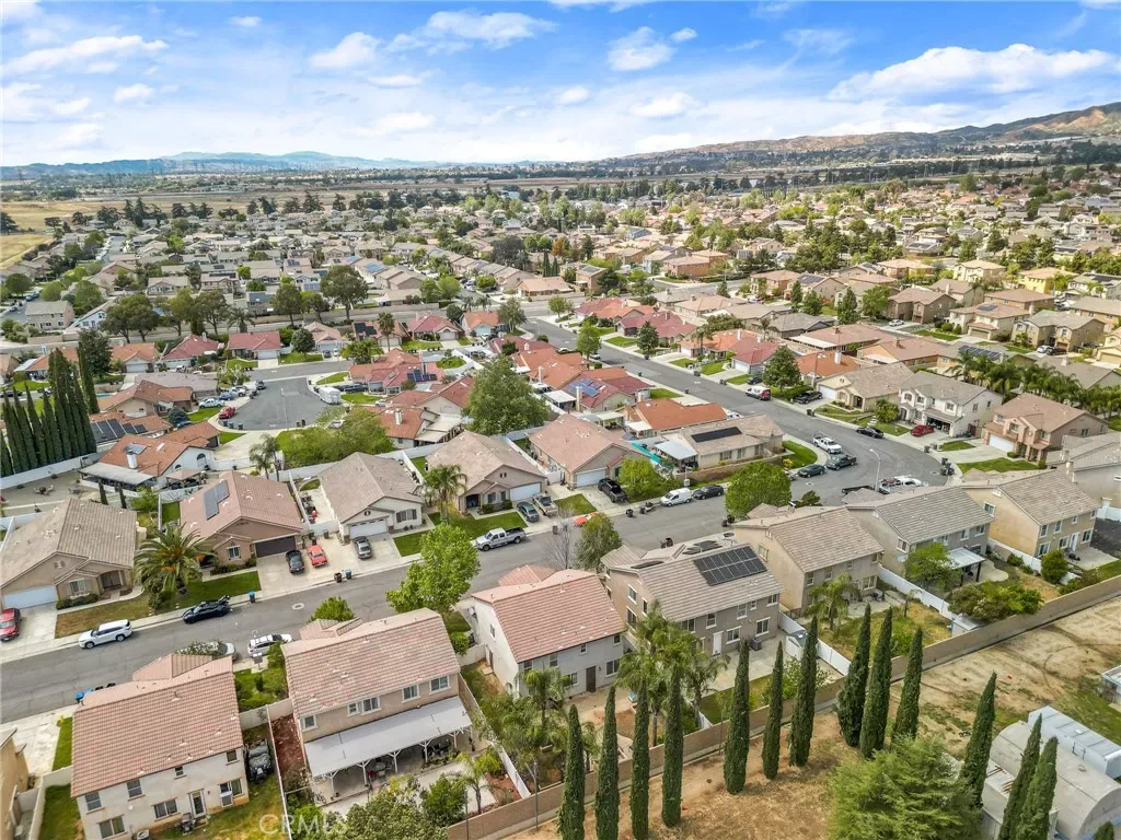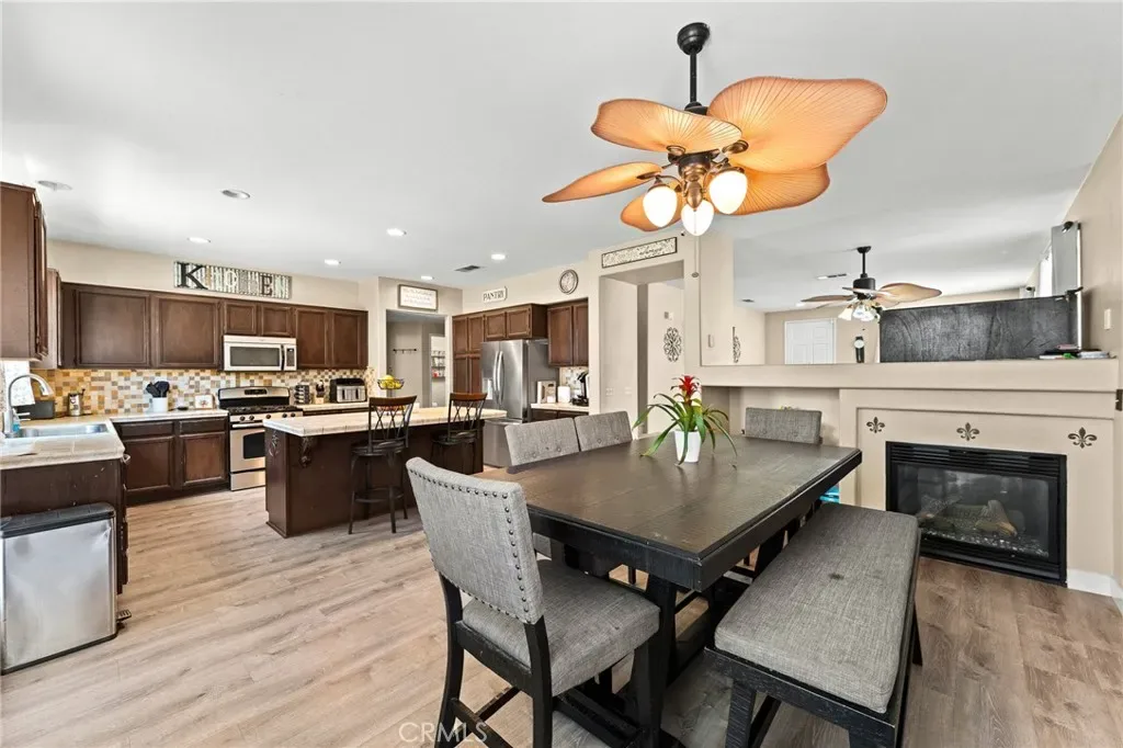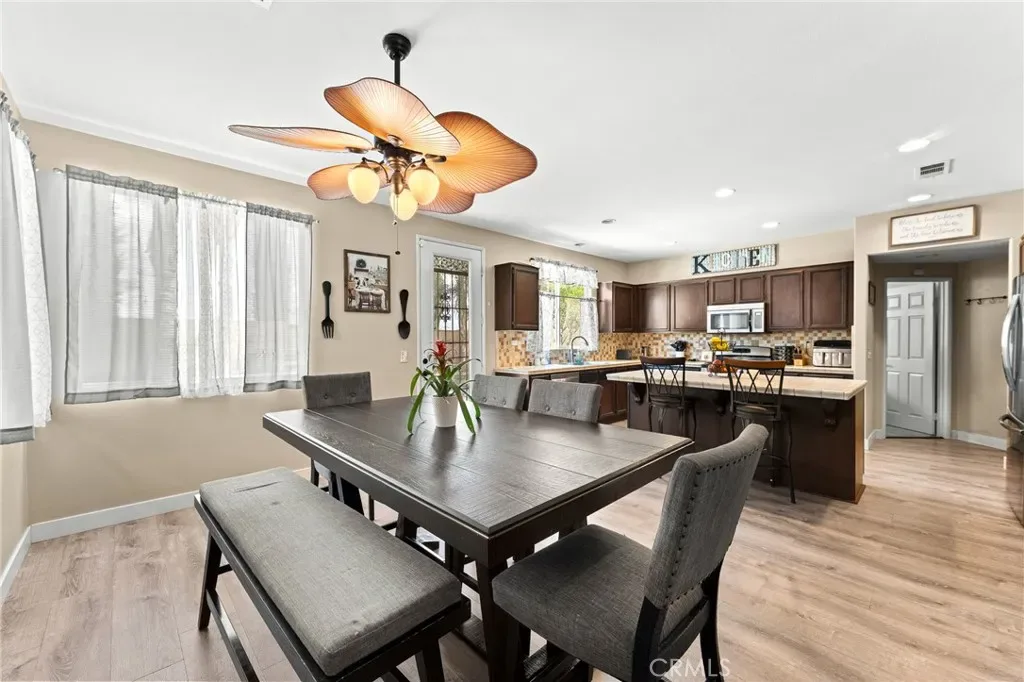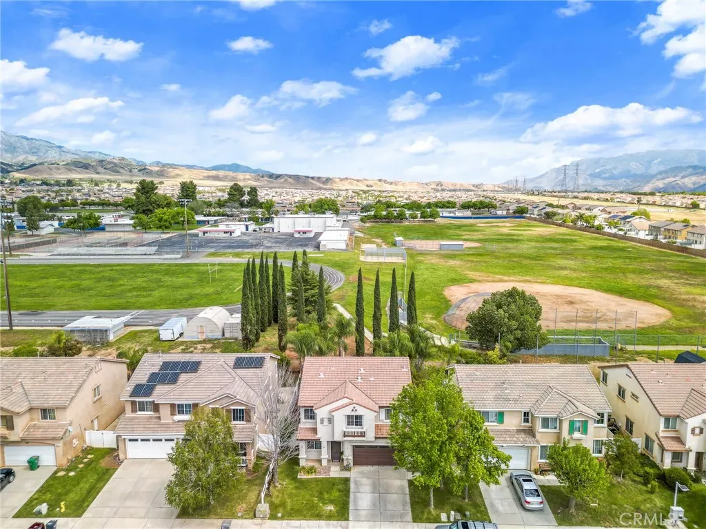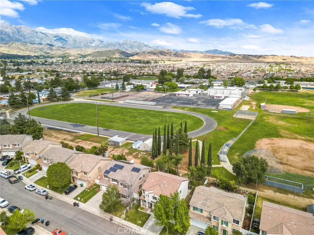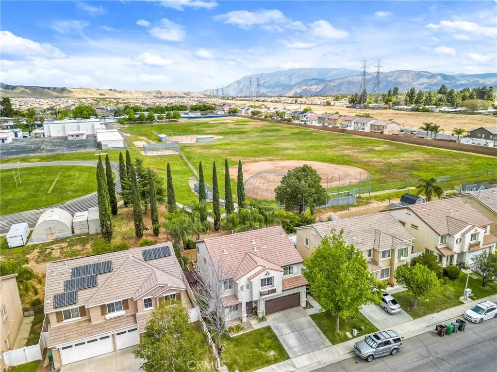 Located in a family friendly Beaumont neighborhood surrounded by scenic mountain views, this well-maintained 5-bedroom, 3-bath home offers over 2,300 sq ft of functional living space. Turnkey and move-in ready, this home offers a spacious layout ideal for everyday living and entertaining. As you enter the home, you’re welcomed into the living room filled with abundance of natural light, and upgraded LVP flooring throughout, with carpet in select areas for added comfort. The kitchen opens to the dining area and features a large kitchen island, tiled countertops, and a stylish backsplash, along with recessed lighting. The dining area is highlighted by a cozy fireplace, creating a warm space for gatherings. A downstairs bedroom and full bath provide flexibility for guests or multi-generational living! Upstairs offers a spacious loft that can be used as a second living area, office, or game room. All bedrooms are generously sized, including the primary suite, which features French doors, a private bathroom with dual sinks, and a separate toilet area. Step outside to a spacious backyard with a large concrete pad, built-in brick fire pit, hardscape, and a combination of block wall and vinyl fencing. There are mature palm trees and low-maintenance landscaping creating a private, relaxed setting with room to entertain or customize. The backyard backs directly to San Gorgonio Middle School, offering added convenience and no rear neighbors. Conveniently located near local schools, parks, shopping, and with easy access to the freeway. No HOA and no solar, offering added flexibility and lower monthly costs. Schedule your private showing today.