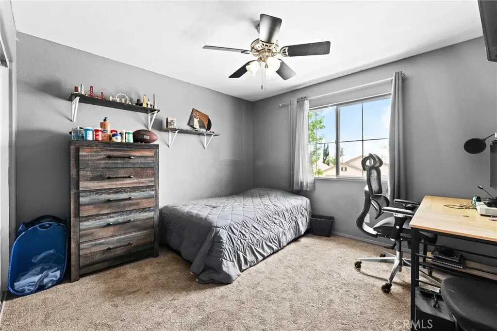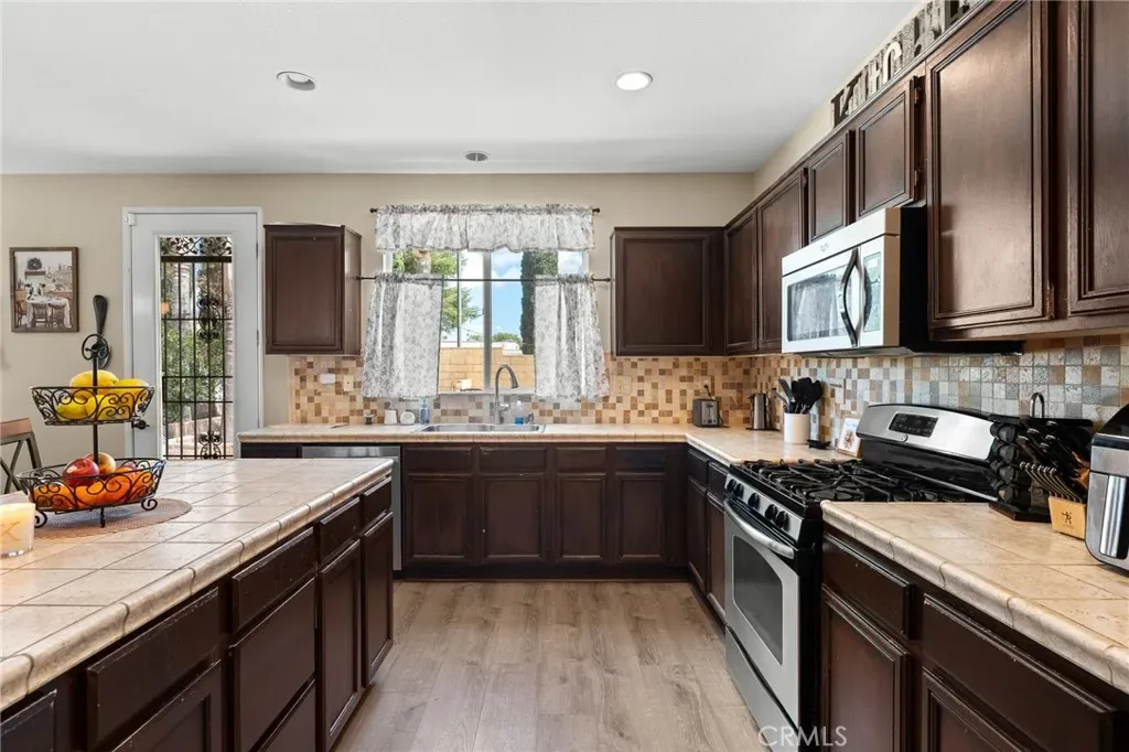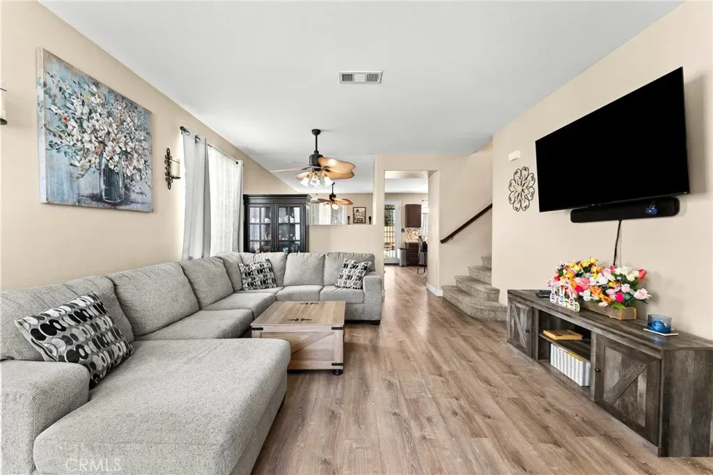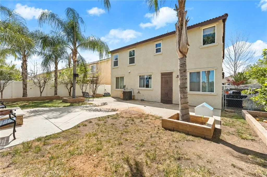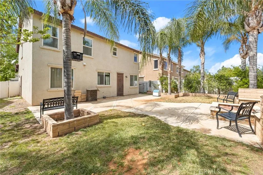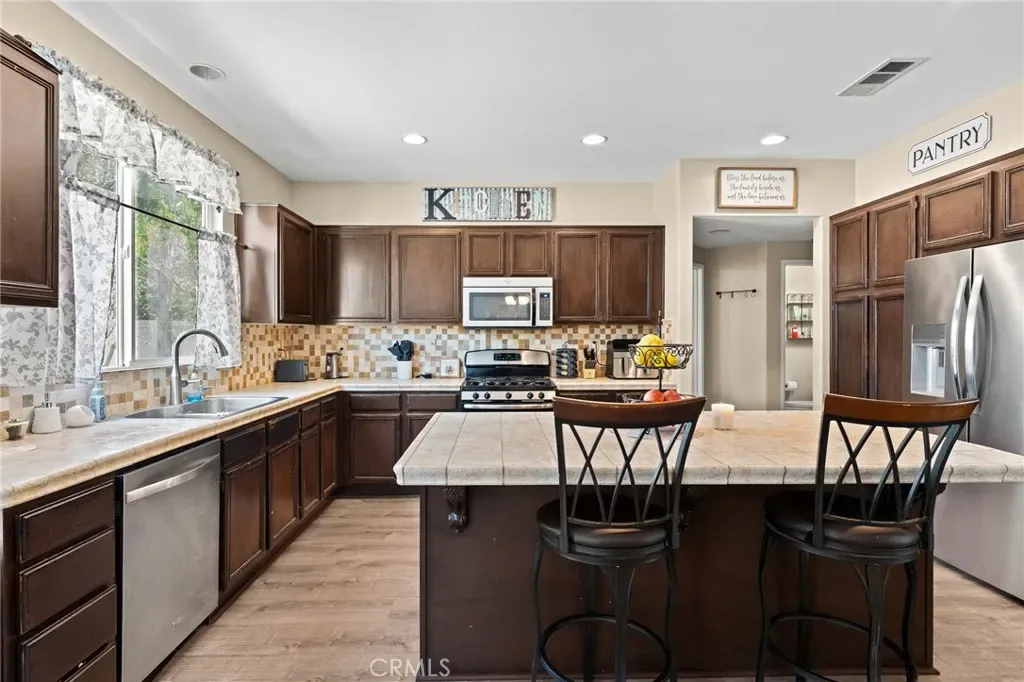 Located in a family friendly Beaumont neighborhood surrounded by scenic mountain views, this well-maintained 5-bedroom, 3-bath home offers over 2,300 sq ft of functional living space. Turnkey and move-in ready, this home offers a spacious layout ideal for everyday living and entertaining. As you enter the home, you’re welcomed into the living room filled with abundance of natural light, and upgraded LVP flooring throughout, with carpet in select areas for added comfort. The kitchen opens to the dining area and features a large kitchen island, tiled countertops, and a stylish backsplash, along with recessed lighting. The dining area is highlighted by a cozy fireplace, creating a warm space for gatherings. A downstairs bedroom and full bath provide flexibility for guests or multi-generational living! Upstairs offers a spacious loft that can be used as a second living area, office, or game room. All bedrooms are generously sized, including the primary suite, which features French doors, a private bathroom with dual sinks, and a separate toilet area. Step outside to a spacious backyard with a large concrete pad, built-in brick fire pit, hardscape, and a combination of block wall and vinyl fencing. There are mature palm trees and low-maintenance landscaping creating a private, relaxed setting with room to entertain or customize. The backyard backs directly to San Gorgonio Middle School, offering added convenience and no rear neighbors. Conveniently located near local schools, parks, shopping, and with easy access to the freeway. No HOA and no solar, offering added flexibility and lower monthly costs. Schedule your private showing today.