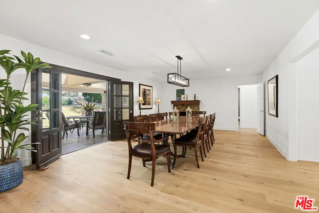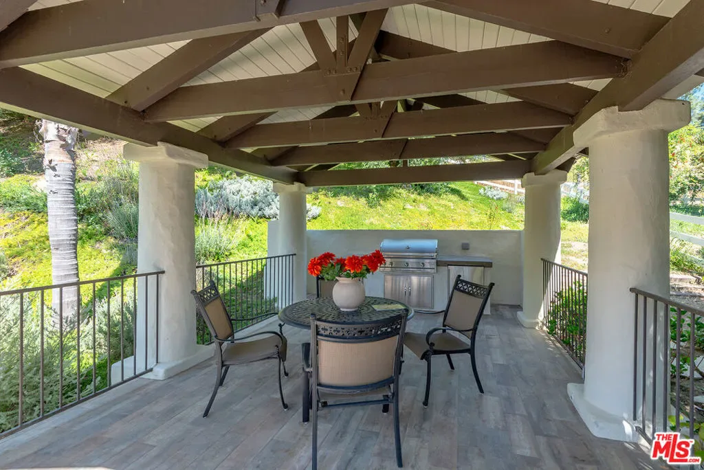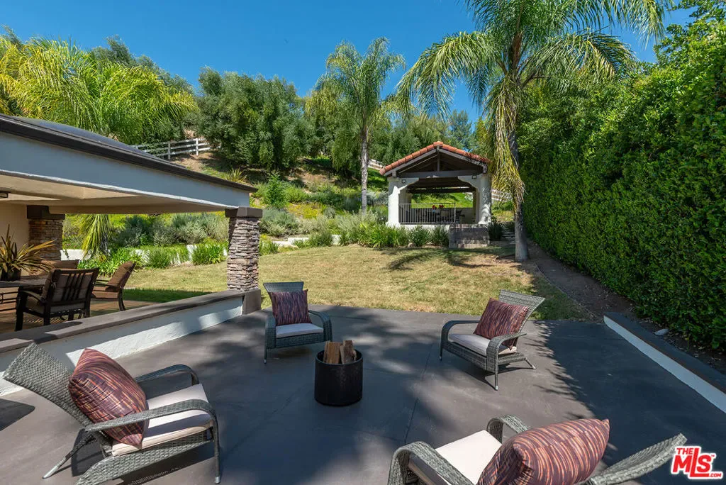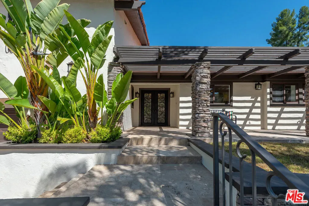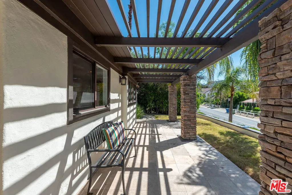 Beautifully situated within the prestigious, guard-gated community of Bell Canyon, this exceptional residence offers refined living with stunning natural surroundings. The home features a charming front porch with a pergola and a dramatic entryway leading to a light-filled interior with wide plank hardwood floors. The thoughtfully designed floor plan includes a step-down living room with a fireplace, a vaulted-ceiling den showcasing serene hill views, and an oversized formal dining room with seamless access to the backyard for effortless indoor-outdoor entertaining. The expansive, updated chef’s kitchen is both stylish and functional, complete with stainless steel appliances, a large center island, and abundant storage.A desirable first-floor bedroom with a private entrance and a bathroom, offers ideal flexibility for guests or a sophisticated home office. Upstairs, the luxurious primary suite is a true retreat, featuring a spacious sitting area, walk-in closet, and an updated spa-inspired bathroom. A generous private balcony captures breathtaking mountain views. On the top level, two additional guest bedrooms share a well-appointed Jack and Jill bathroom. Additional highlights include a three-car direct entry garage and a dedicated laundry area. The entertainer’s backyard is designed for year-round enjoyment, featuring a solid covered patio and a built-in BBQ area – perfect for weekend gatherings and celebrations under the California sky. Residents of Bell Canyon enjoy a resort-style lifestyle with exclusive amenities including tennis courts, an equestrian center, a fitness center, and miles of scenic hiking and riding trails. This community is also complemented by access to the highly acclaimed Las Virgenes School District. This is a phenomenal opportunity to own a home that combines elegance, comfort, and lifestyle.