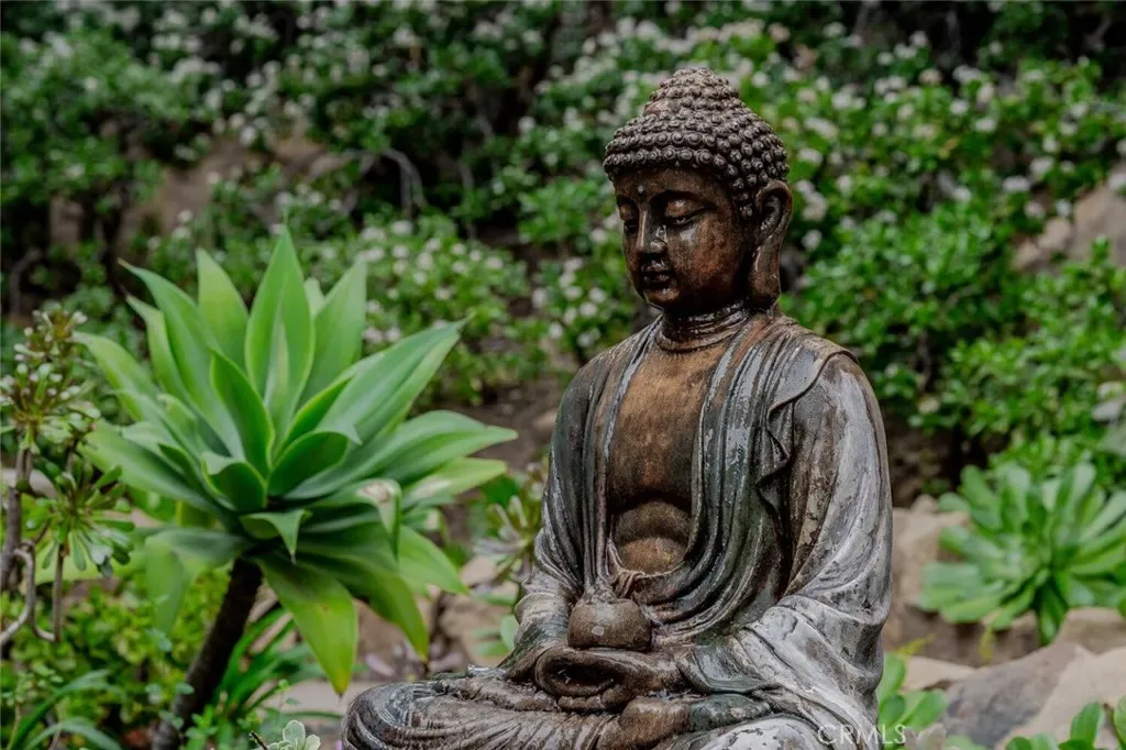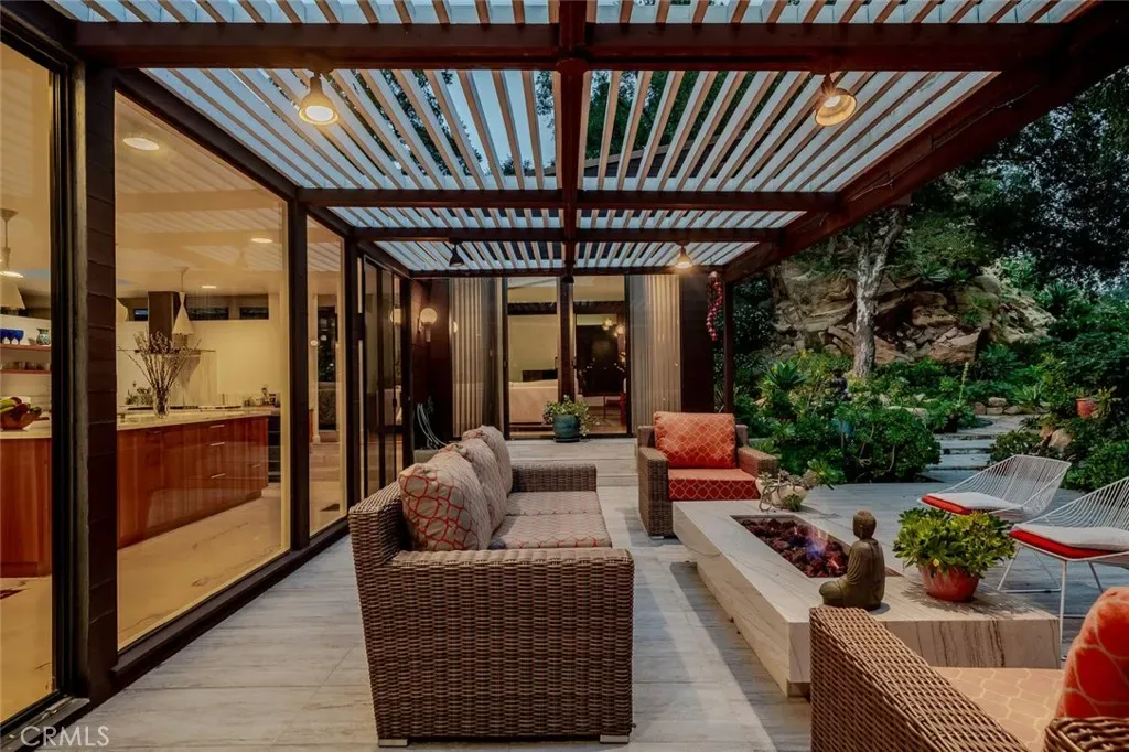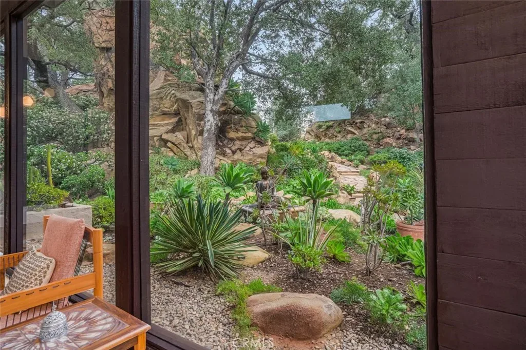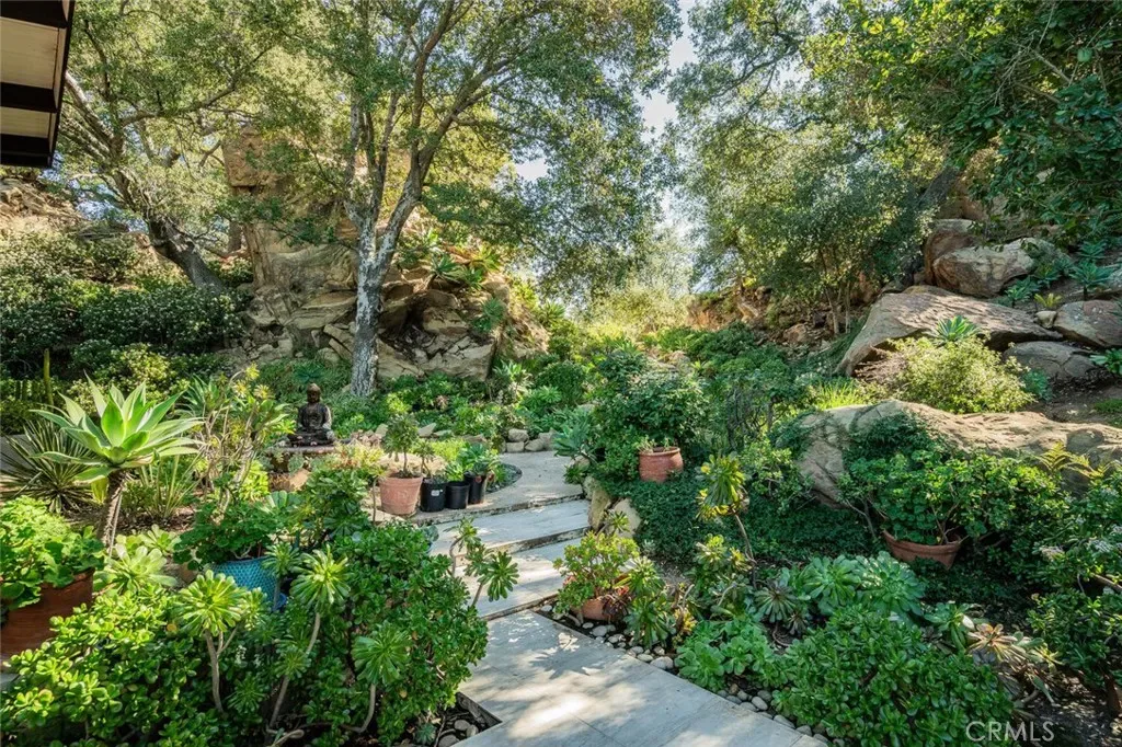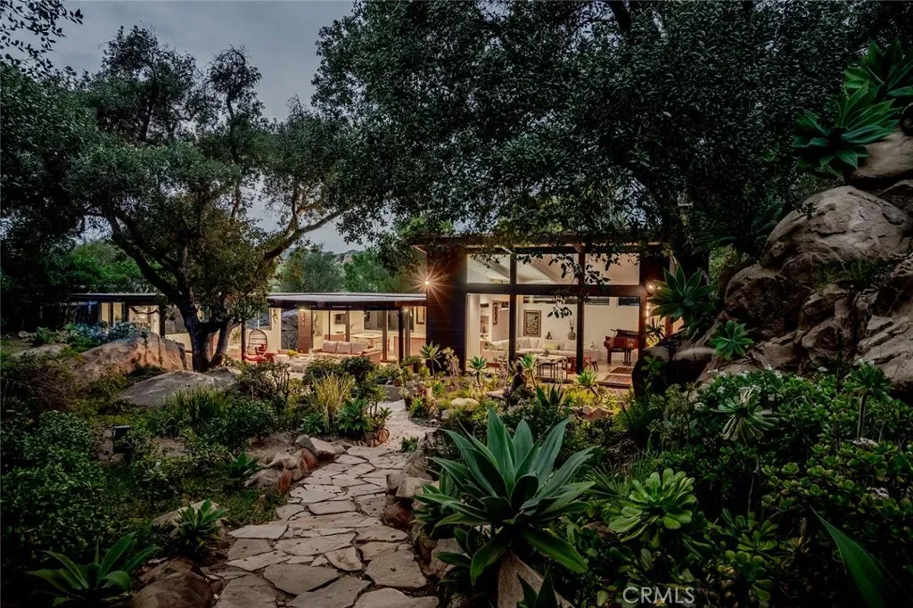 Outdoor living is equally intentional. Porcelain-clad patios extend the home into the landscape, complemented by a covered outdoor kitchen, sculptural soapstone fire pit, and PebbleTec-finished pool. Meandering stone paths, mature fruit trees, and layered gardens create moments of discovery throughout the grounds. A climate-controlled three-car garage with epoxy flooring, substantial storage, and additional guest parking complete the offering.