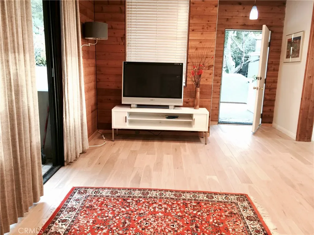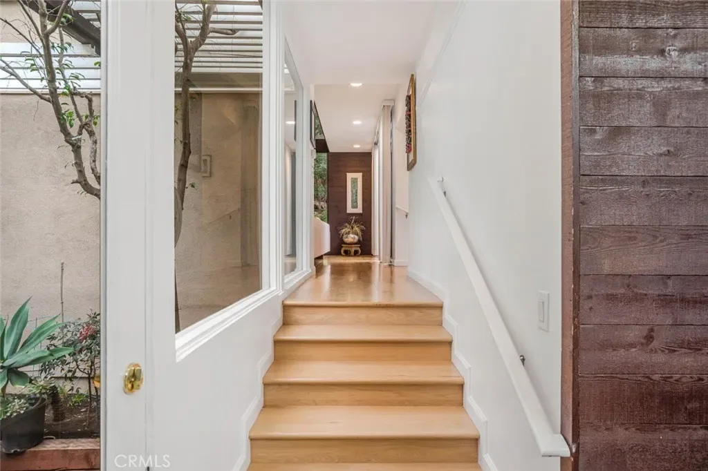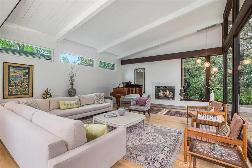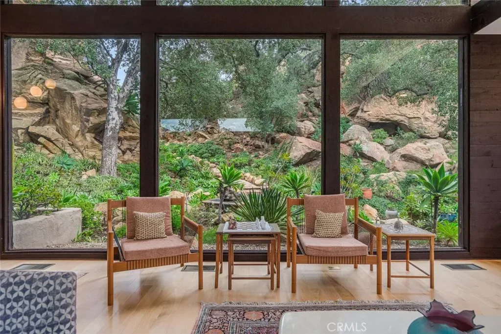 The formal living room is defined by dramatic walls of glass that frame garden and canyon views, while transom windows throughout introduce architectural depth and natural light. Wide-plank hickory floors, curated lighting, and a refined neutral palette establish a cohesive and elevated interior environment.