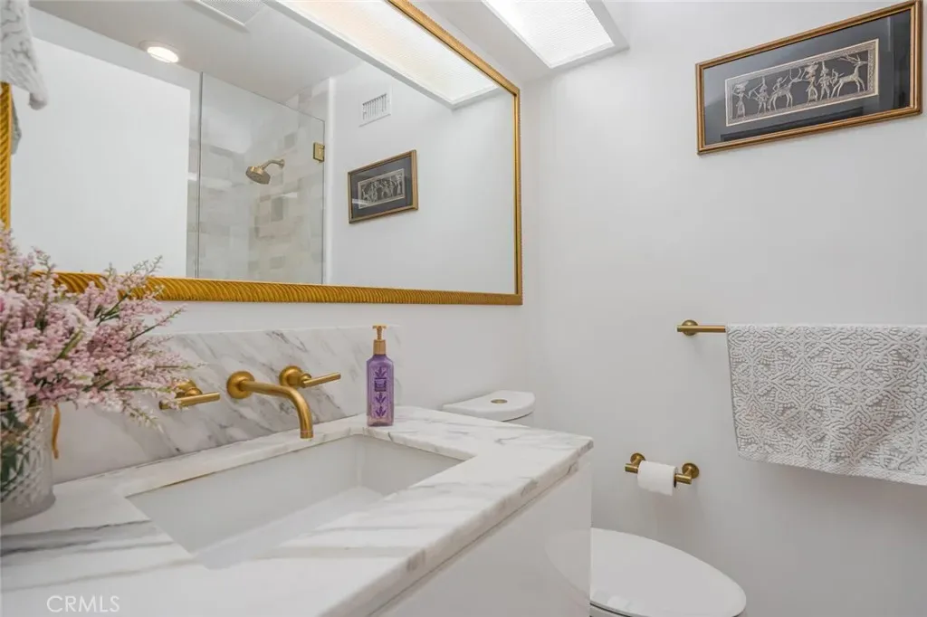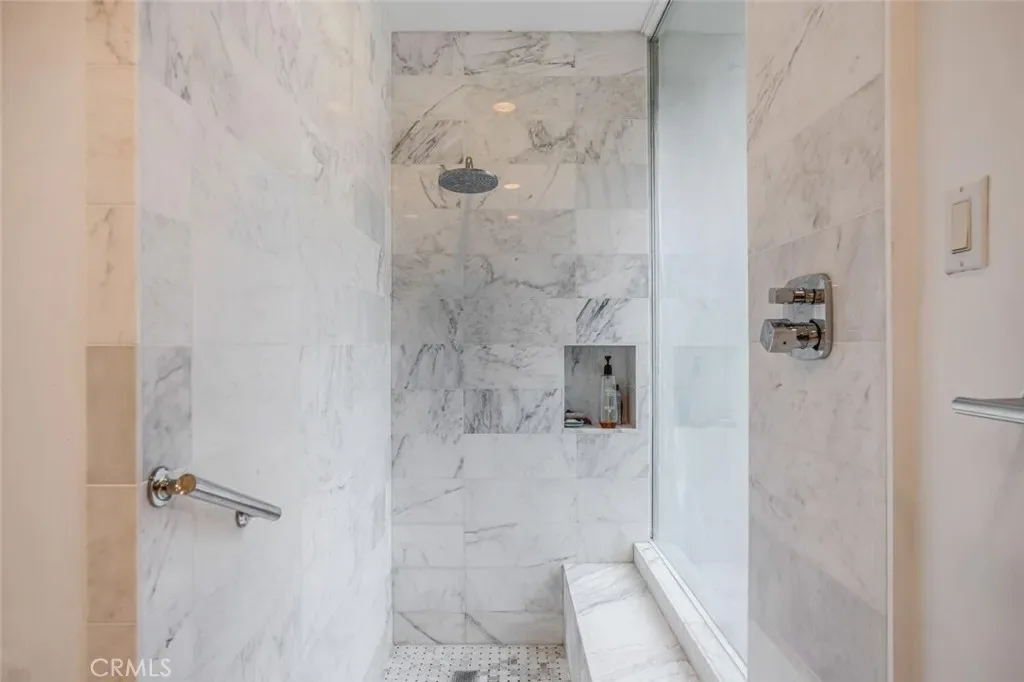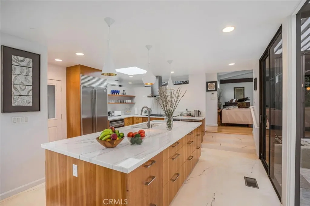 The chef’s kitchen serves as both functional centerpiece and design statement, appointed with bespoke cherrywood cabinetry, marble countertops, designer appliances, and sculptural pendant lighting. Spa-caliber bathrooms feature marble finishes and Hansgrohe fixtures, while the primary suite offers privacy, comfort, and dual walk-in closets. Recent improvements include a new HVAC system, tankless water heating, upgraded electrical infrastructure, an updated fireplace, new picture windows, and a newly installed roof.