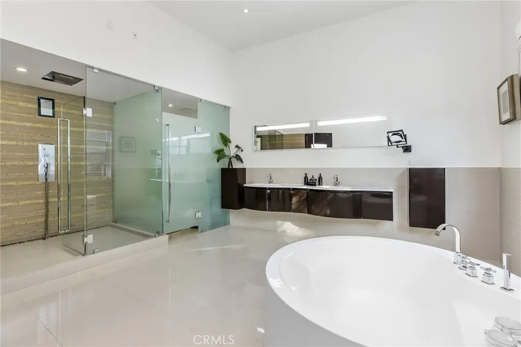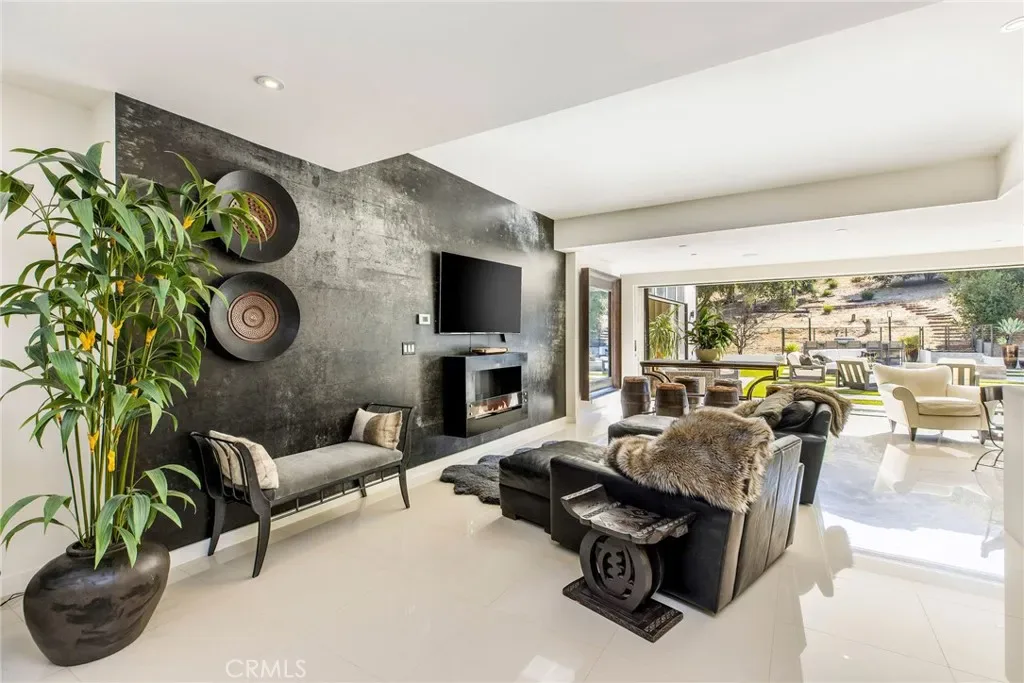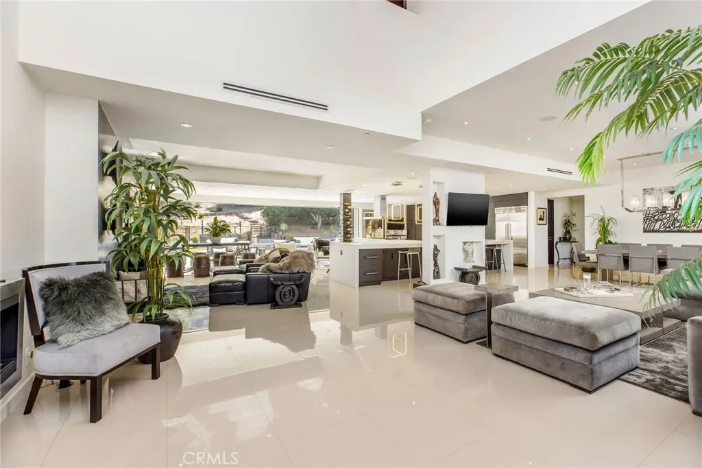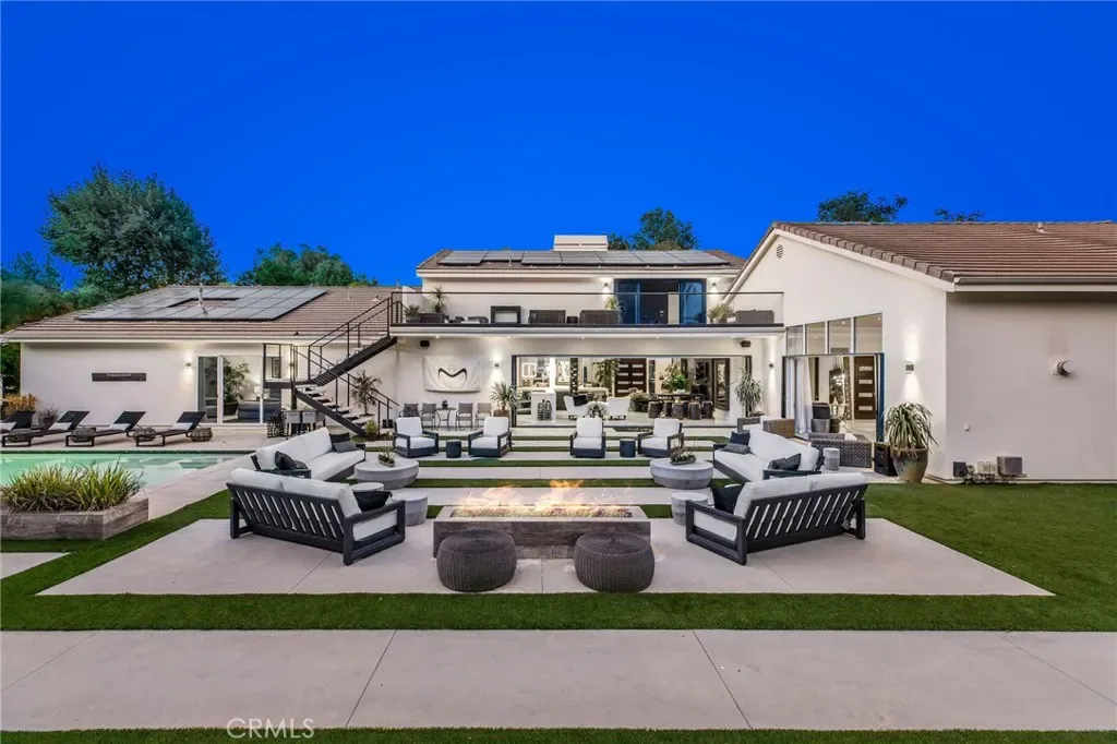 This gorgeous, model sharp home has been beautifully expanded and remodeled throughout. Nestled on a very private 1.23 acre lot in the guard gated community of Bell Canyon, this very sophisticated, yet casually elegant home features a sunny, open floor plan that’s bathed in natural light. Highlights include a superb chef’s kitchen with custom crafted island, leathered stone countertops, contemporary lighting, and an architectural pillar serving as a statement piece for wine lovers, with all flowing seamlessly into the dining area, living room, and great room featuring stunning white stone flooring, a stone fireplace and sliding walls of glass that open to the spacious rear grounds. The downstairs primary suite is one of four bedrooms on the main level and it serves as a private oasis that includes a luxurious bath complete with dual showers, a circular soaking tub, and generous, dual walk-in closets. There are two big upstairs bedrooms, one with its own private veranda and a separate staircase to the rear grounds. The large backyard offers a large sparkling pool & spa, fully equipped barbecue center, big firepit with patio seating, lush landscaping, mature fruit trees, and room for your own farm to table garden, plus loads of space for year-round relaxation or hosting family gatherings, all framed by peaceful views of the surrounding hills & nearby mountains. “Villa Saddlebow” is also served by the highly regarded Las Virgenes School District, which provides convenient bus service for Bell Canyon residents. Don’t miss this home which has much to offer for the discriminating buyer.