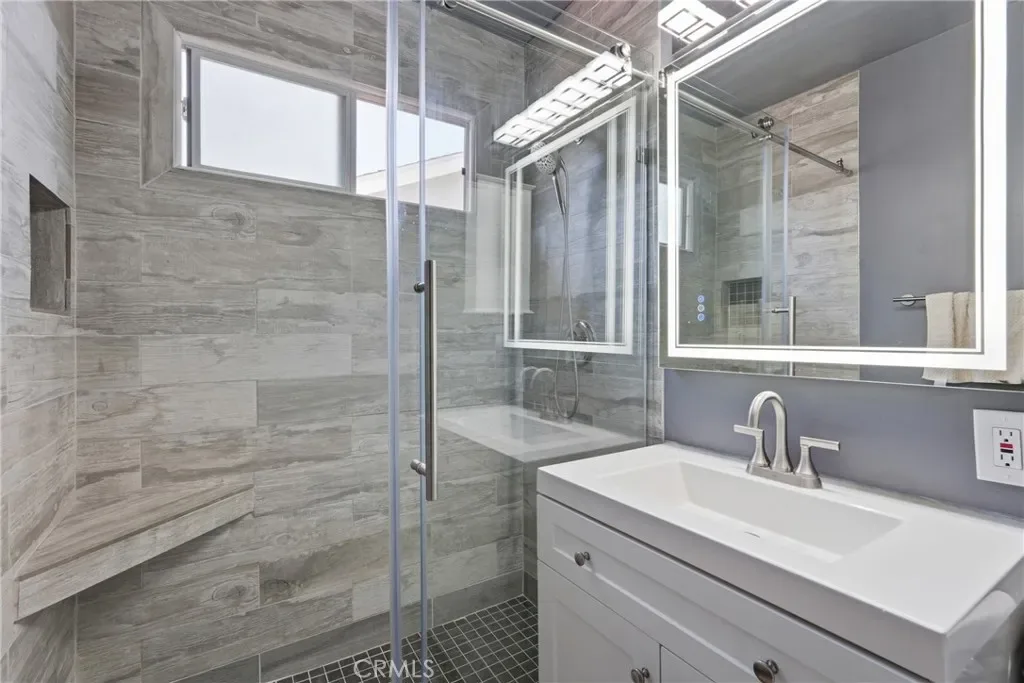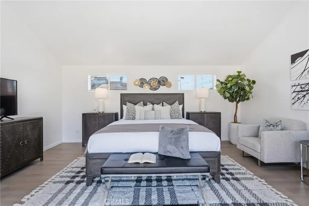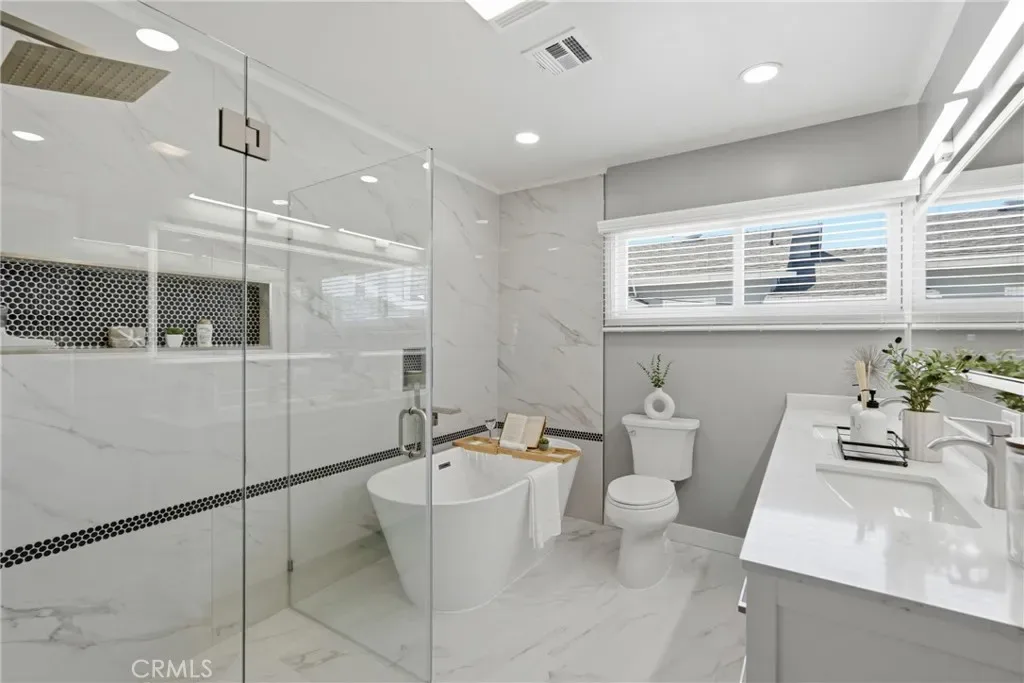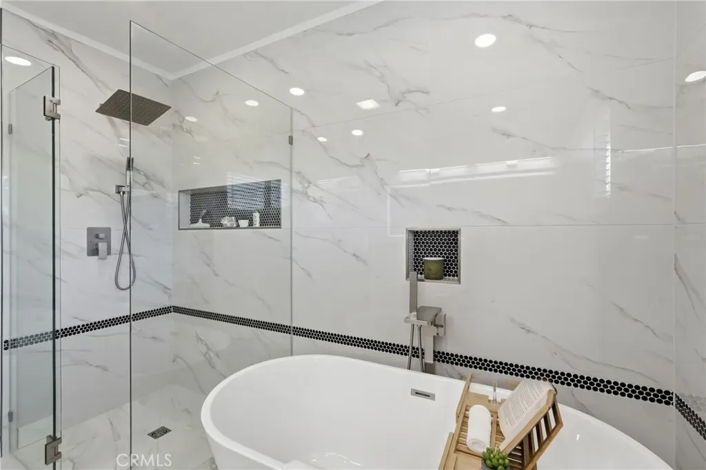 The primary suite offers a true retreat with a beautifully renovated bathroom, complete with a standalone soaking tub, a curb less walk-in shower with a frameless glass enclosure, and a custom oversized walk-in closet with built in storage.