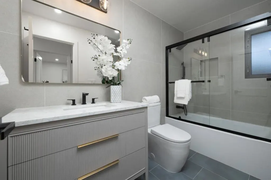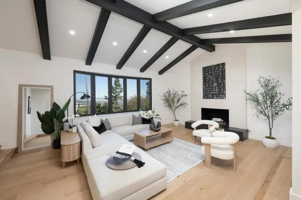 Gorgeous elevated rancher view home with an open floor plan and soaring beamed ceilings. Newly remodeled with designer finishes throughout, the kitchen showcases a large island, Bosch appliances, matte black cabinetry with matte gold hardware, a pot filler, and a spacious pantry, opening to a deck with BBQ area. All bedrooms sit off a central hallway near the laundry room. The hall bath features a sleek shower-over-tub, while the expansive primary suite offers a spa-like bath with a designer double vanity and matte gold fixtures. Additional highlights include a private office, attached 2-car garage, lush new lawn, and beautifully landscaped yard. Improvements include a new roof and gutters, new furnace, upgraded electrical, and fully remodeled kitchen, baths, and lighting. Top schools are just minutes away.
