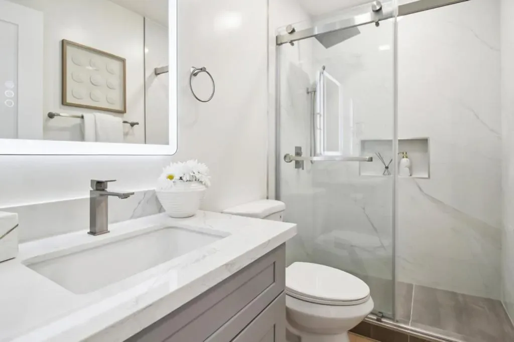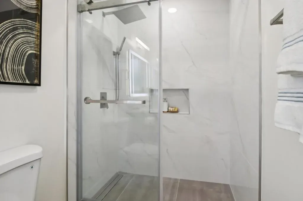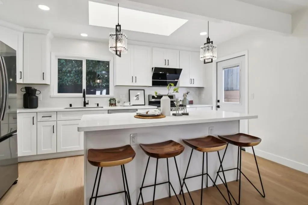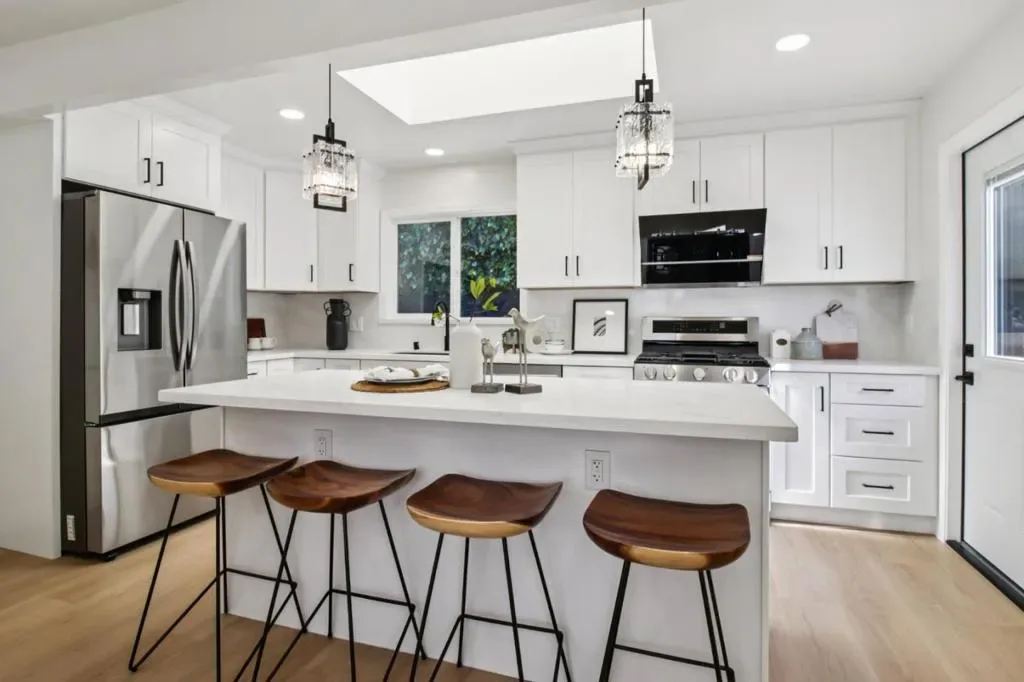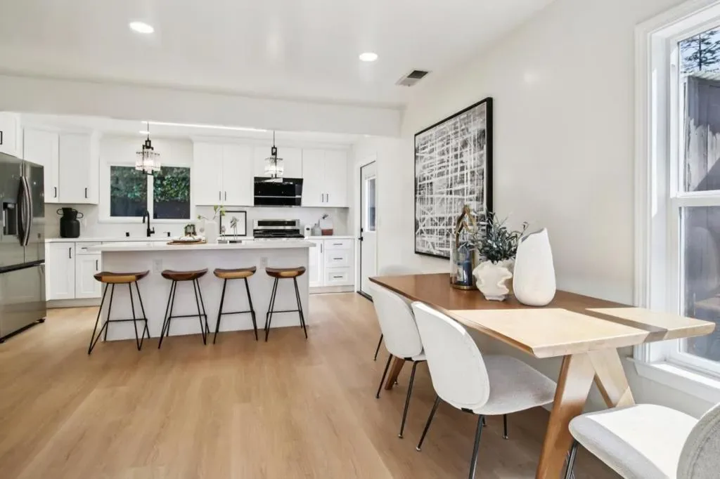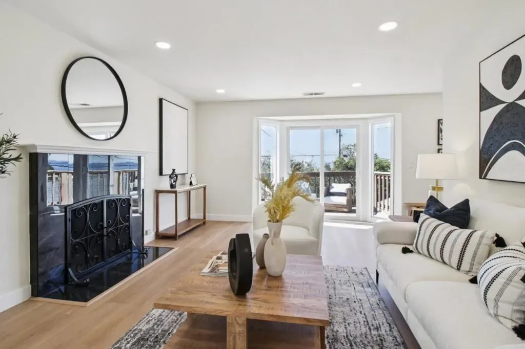 This stunning fully remodeled home offers bay views and exceptional indoor-outdoor living. Renovated with high-quality finishes, it features a bright open floor plan with wide-plank flooring and recessed lighting throughout. The living area includes a sleek fireplace and opens through expansive glass doors to one of two spacious decks, ideal for entertaining, dining, or relaxing with views. The chefs kitchen features white cabinetry, quartz countertops, stainless steel appliances, and a large center island with bar seating. Well-appointed bedrooms provide comfort and flexibility, including a spacious primary suite with dual closets and a beautifully updated bathroom featuring modern vanities, illuminated mirrors, and a frameless glass shower with designer tiles. A sliding door offers direct access to the private backyard, enhancing indoor-outdoor flow. Additional bedrooms are bright and versatile with bay views, complemented by an updated hall bath with modern finishes. Move-in ready with central AC, this home blends style, comfort, and functionality. Close to Tilden Park with easy access to trails, UC Berkeley, downtown, shops, and dining.