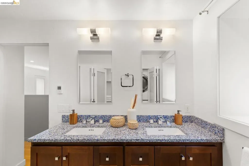 A private sanctuary in the coveted Berkeley Hills, this luxurious retreat offers gorgeous San Francisco and Golden Gate Bridge views from every level. The open and inviting floor plan connects generous living, sitting and dining areas with a balcony, capturing natural light and dramatic vistas from sunrise to sunset. A beautifully modernized chef’s kitchen is colorful and trendy – equipped with top-of-the-line appliances and abundant storage. Double doors open to a deck and garden – perfect for indoor/outdoor living and entertaining. Flexible floorplan is ideal for multi-generational living as each floor has access to the outdoors while still being connected. Each bedroom has it’s own bathroom – 2 bedrooms with stylishly remodeled baths are found on the main level, while the lower-level primary suite or in-law offers direct access to a private deck with hot tub. This luxurious escape comes with another bedroom overlooking the view, a gas fireplace, sitting area, walk-in closet, and laundry. Storage, a 2-car garage on the street level and impeccable maintenance are a testament to convenience and comfort! Ideally located near Tilden Park & the Golf Course, with convenient access to UC Berkeley, this home offers the perfect blend of privacy, style, comfort, and nature. BESO Score 1