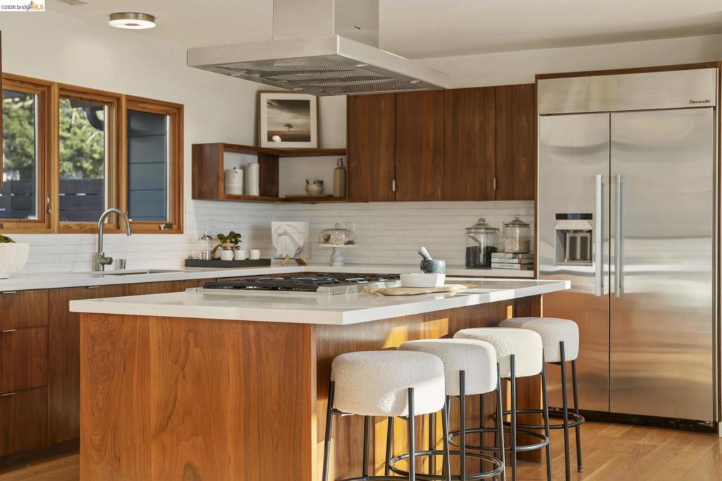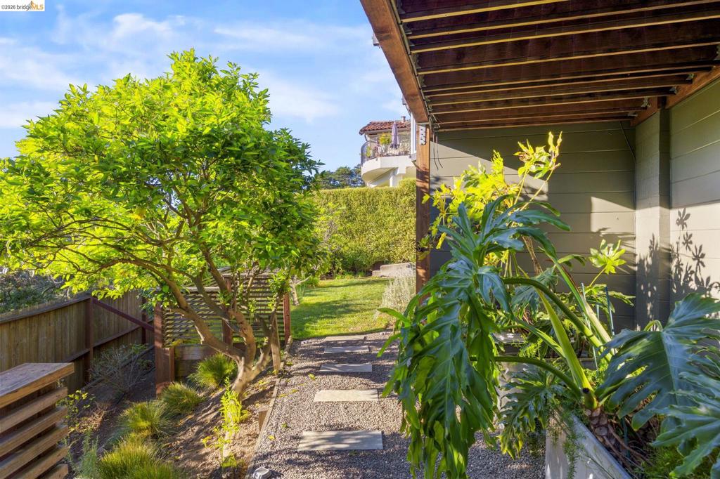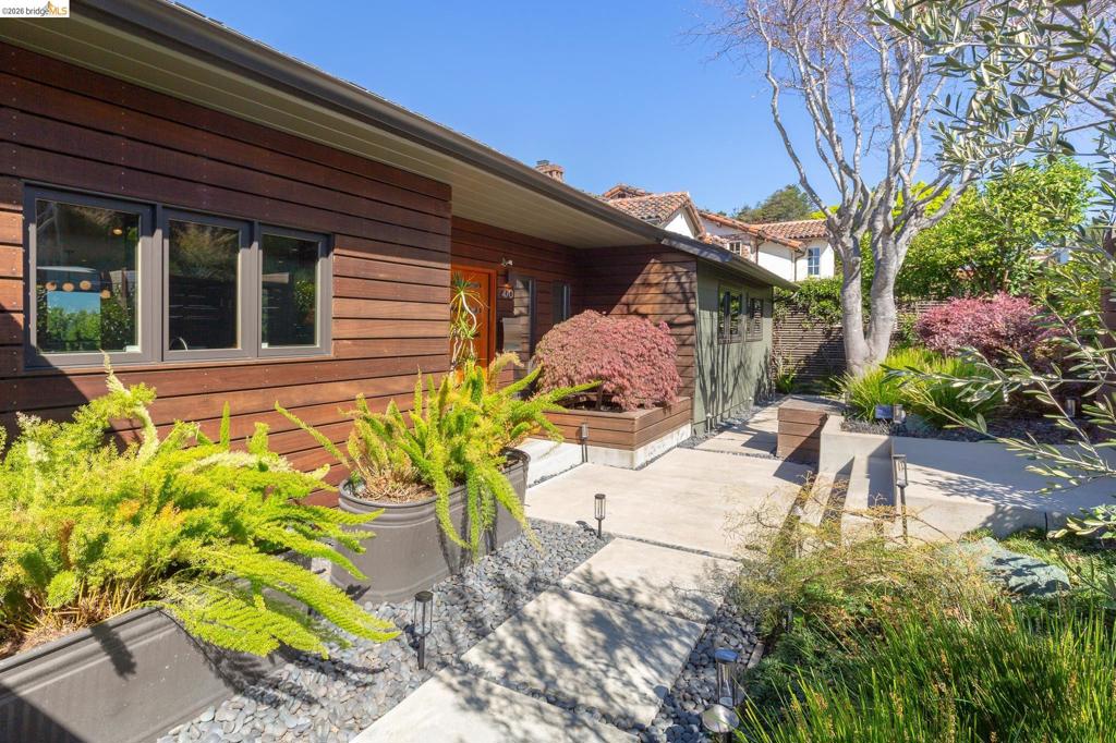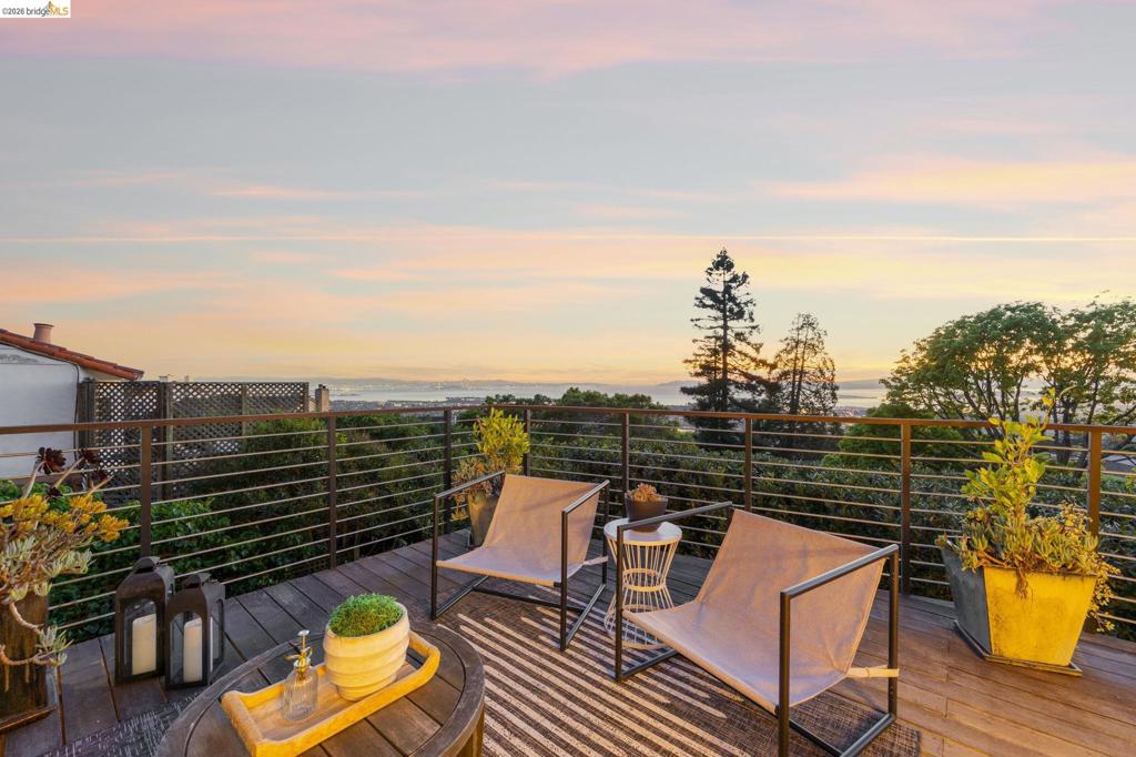 BESO score 10. This stylish MCM home is evolved for today’s lifestyle and crowned by panoramic views of the Bay and Golden Gate Bridges, S.F. skyline, and the shimmering bay. Light, water, and sky draw you into this true sanctuary. Across two levels, the level-in entry, primary suite on the main floor, scale, and accessibility here is uncommon. Exotic hardwood cladding on the facade and wraparound deck complements the warm olive tones in a seamless theme. The open plan connects kitchen, dining, and living in a generous flow, each open to the views. Hardwood floors run into walls of glass, anchored by walnut cabinetry, a full Thermador suite, central island, and breakfast bar. The owner’s suite has bay window views, large closet, and spa-level bath. Two more bedrooms and a marble-tiled bath complete the main floor. Downstairs are two bedrooms, lounge, wet bar, bath, laundry, loggia, and level backyard. A cutting garden, established fruit and other trees, level lawn and succulents compose a productive, low-maintenance landscape. Owned solar (8kW), dual Tesla Powerwalls, EV ready makes contemporary luxury living is effortless. With architectural integrity, multi-generation living options, future proof upgrades, this is simply a peerless lifestyle offering.