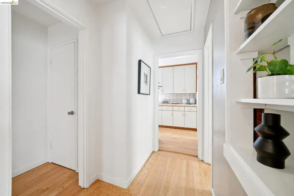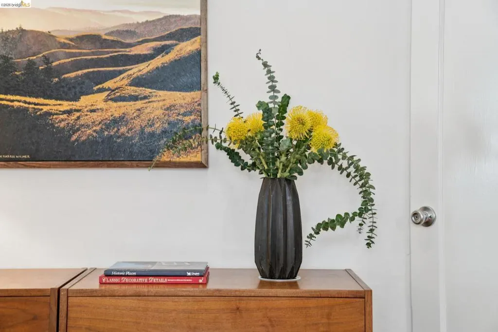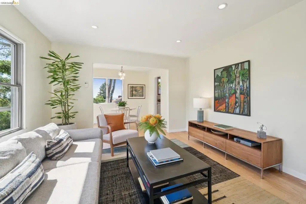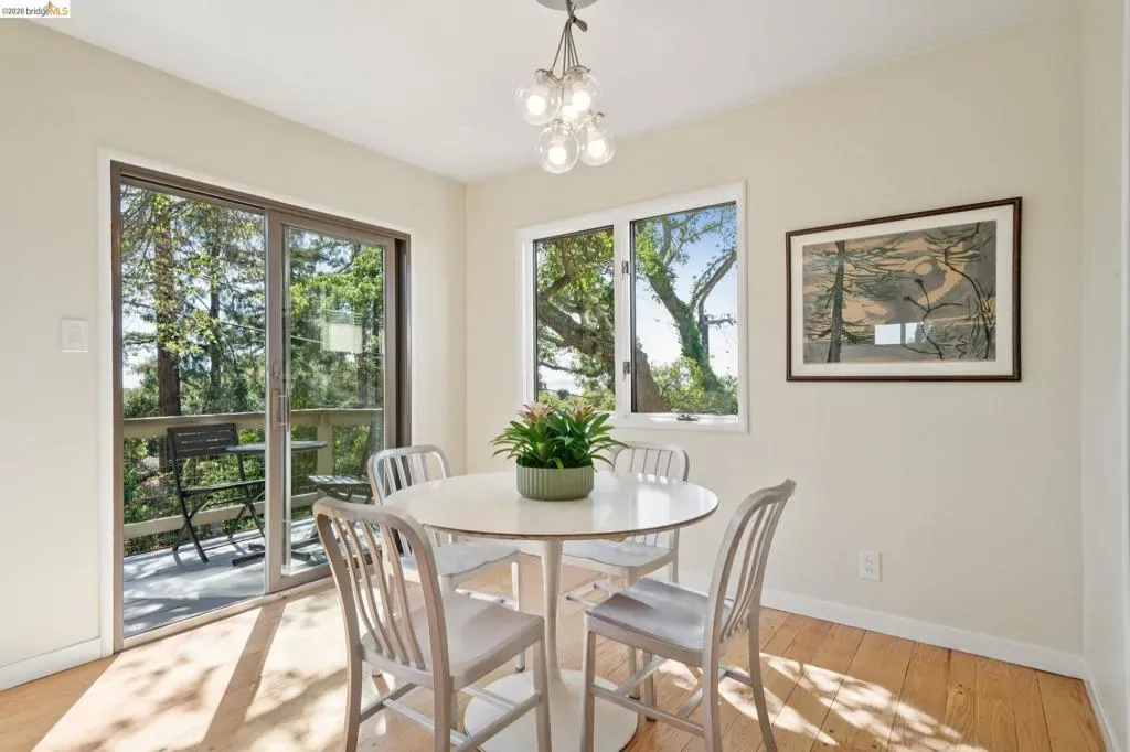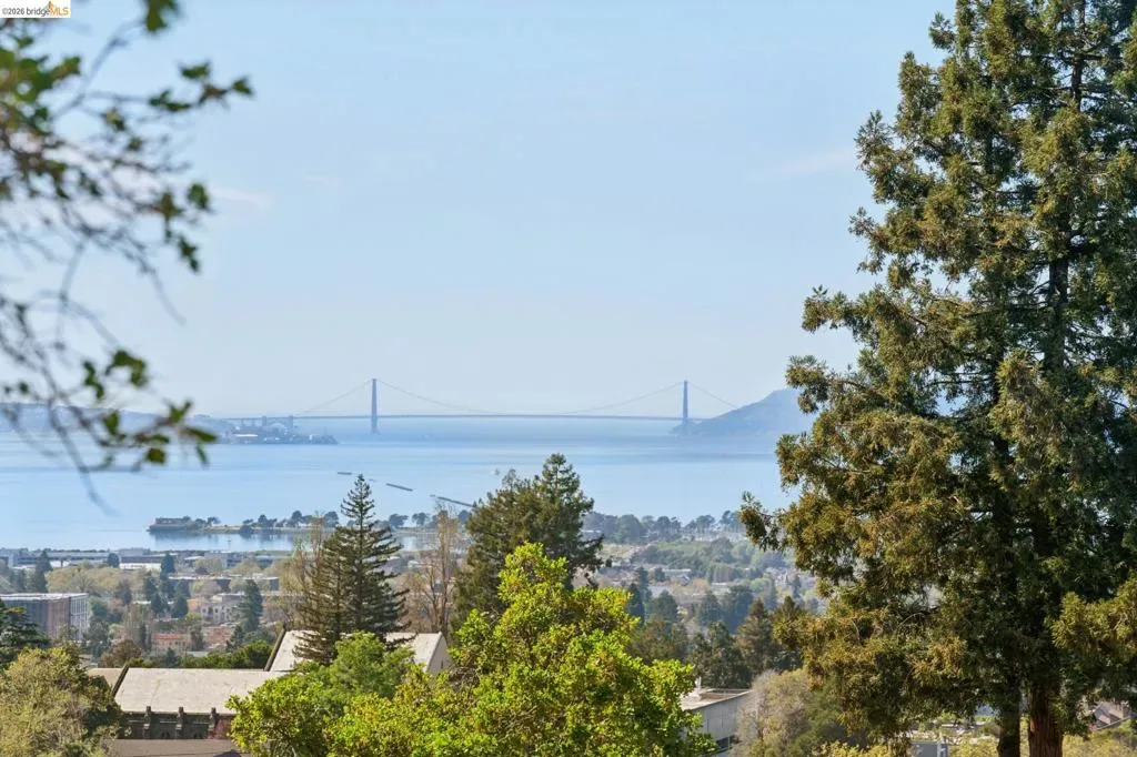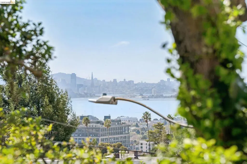 Peacefully perched at the corner of La Loma Ave and Virginia St in the highly sought-after Berkeley Hills Northside neighborhood, this sunlit home evokes the feeling of a serene tree house. The open & airy townhouse-style condo is essentially a free-standing home, with only a shared wall in the garage and no HOA dues. The welcoming living room and dining room are bathed in sunlight from morning till dusk. A seeming wall of windows captures beautiful tree-filtered views of many classic Bay Area treasures: San Francisco, Golden Gate Bridge, UC Berkeley’s Campanile, Oakland, and Alcatraz. The deck spans the length of the front of the home and is a dreamy spot for morning coffee while listening to the springtime chirping of birds, or an evening dinner, enjoying dramatic sunset hues over the Golden Gate. Refinished oak floors and a handsome fireplace flanked by charming built-ins set off the living-room views, creating a restful retreat. A space just off the bedroom is perfect for a cozy second bedroom or office. The prime location offers unbeatable access to North Berkeley shops & fine dining. Only moments from renowned UC Berkeley, providing effortless proximity to campus, this home could also be a highly sought-after rental or pied-à-terre in a peaceful, natural setting.