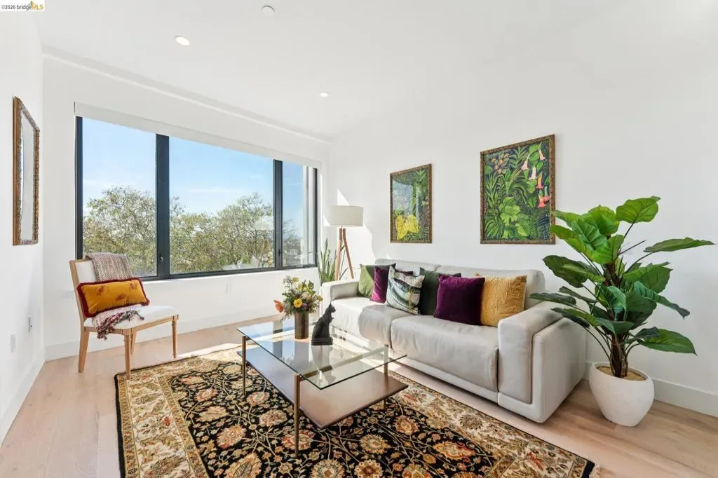 Contemporary, light-filled top-floor condominium built in 2020, featuring filtered bay views from multiple rooms. This 1 bed, 1 bath residence offers a thoughtfully designed open floor plan with expansive windows that flood the space with natural light, creating a bright and airy living environment. The modern layout is ideal for everyday living and entertaining. Radiant heat throughout. Dedicated parking adds everyday convenience. Residents enjoy access to a shared rooftop garden with sweeping views of the bay, 2 bridges, surrounding hills, and The Campanile—a perfect setting for relaxing, gathering with friends, or taking in the sunset. Located in vibrant Southwest Berkeley, 2747 San Pablo Ave places you in the heart of a dynamic neighborhood. Just moments away, Berkeley Bowl West is a local favorite. The surrounding San Pablo Avenue corridor is lined with cafes, restaurants, and everyday conveniences, reflecting the area’s diverse and creative spirit. With easy access to I-80/580, nearby transit options, and proximity to West Berkeley’s thriving arts and maker scene, this location offers a rare blend of connectivity, culture, and comfort—making it an ideal place to call home. Views: Downtown