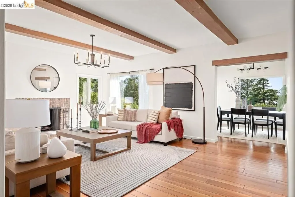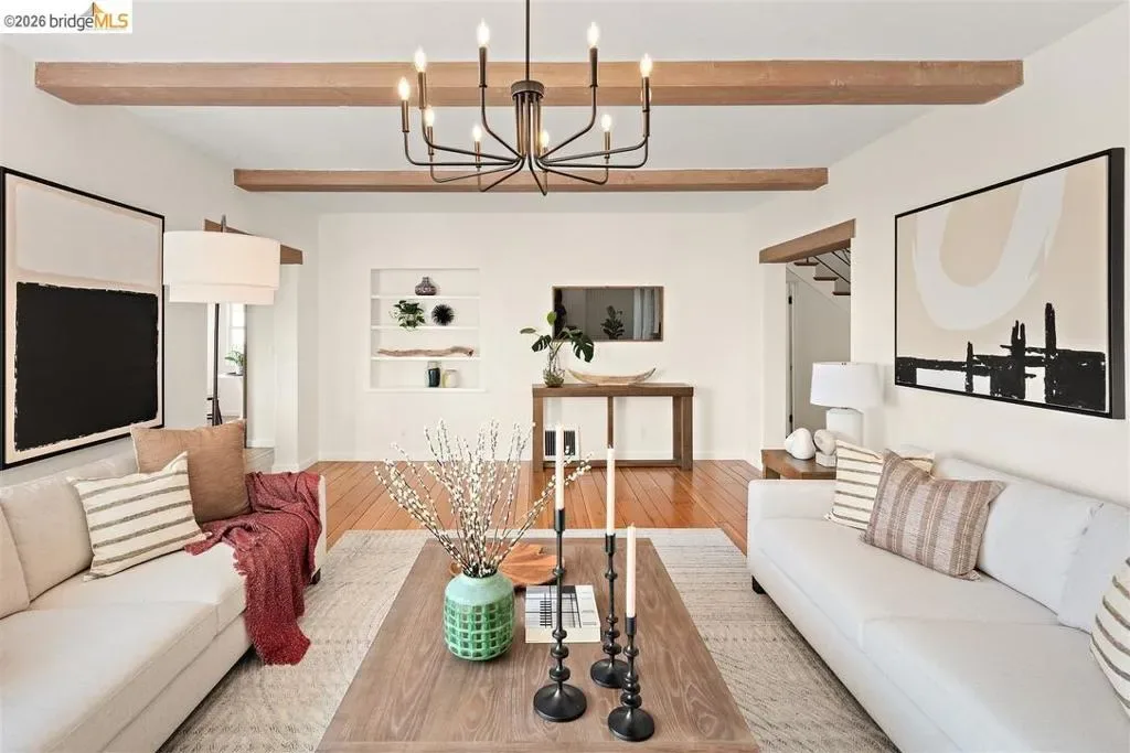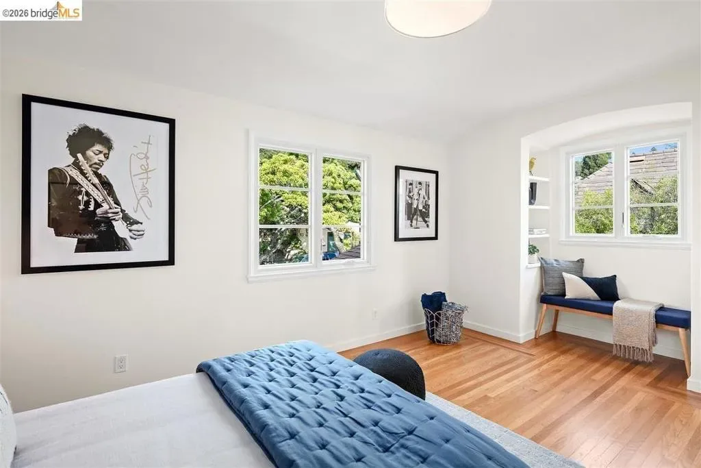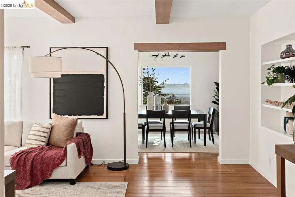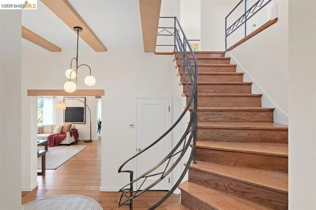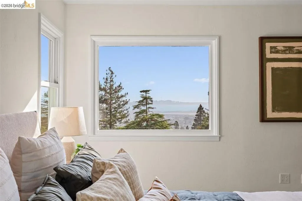 Located on a quiet, tree-lined street in Upper Thousand Oaks, this striking 5-bedroom, 4.5-bath home offers magnificent views. Timeless architectural details—hardwood floors, beamed ceilings, built-ins, and alcoves—are complemented by modern updates. Large living and dining rooms and a well-appointed kitchen create an easy flow for relaxation and entertaining. A graceful, curved staircase leads to the first landing, where an ensuite bedroom offers comfort and privacy. Upstairs, the primary suite features an updated bathroom and a sitting room opening to a deck with Bay views. Two additional bedrooms, a playroom, and an updated bathroom complete the upper level. The lower level includes a large family room with wet bar, ensuite bedroom, and garden access. Laundry, storage, and a two-car garage with interior access add functionality. The backyard is a private oasis with mature landscaping and room to garden, lounge, or play. Upgrades include electrical, helical pier foundation, Andersen windows, and solar. Close to Arlington shops, Solano Avenue, transportation, and Tilden Park. BESO energy score 2.