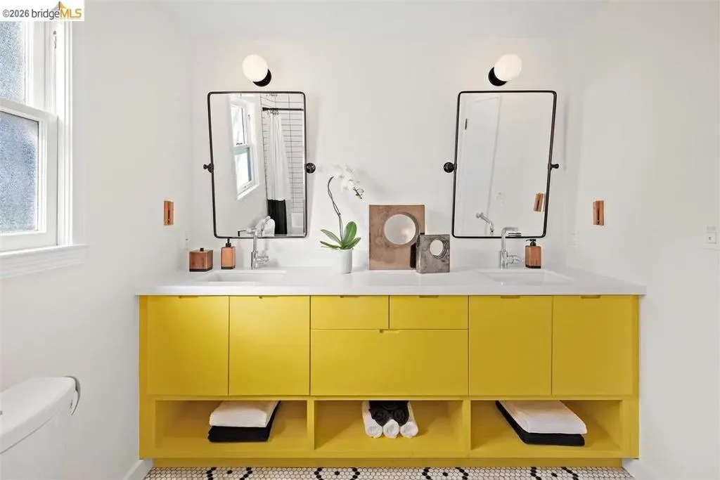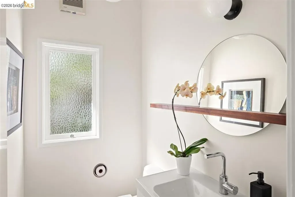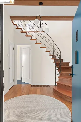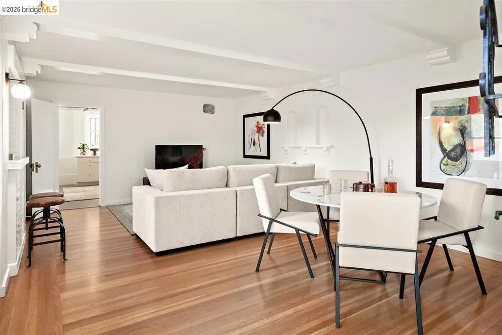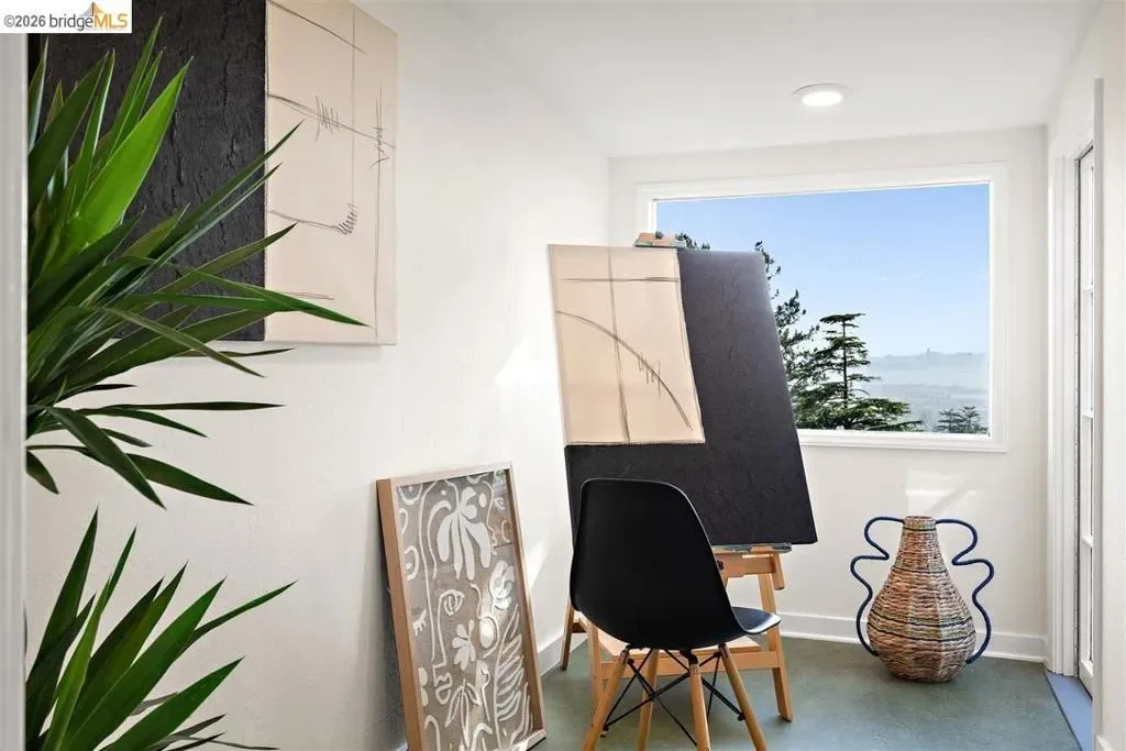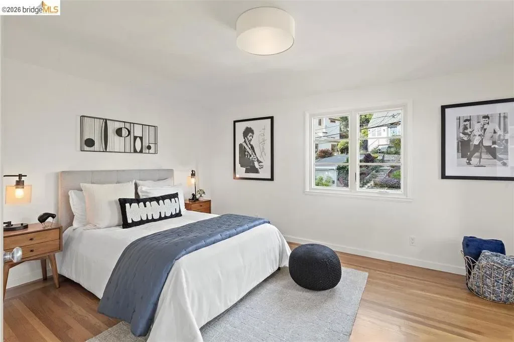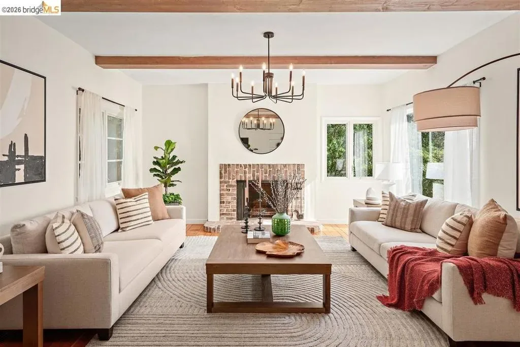 Located on a quiet, tree-lined street in Upper Thousand Oaks, this striking 5-bedroom, 4.5-bath home offers magnificent views. Timeless architectural details—hardwood floors, beamed ceilings, built-ins, and alcoves—are complemented by modern updates. Large living and dining rooms and a well-appointed kitchen create an easy flow for relaxation and entertaining. A graceful, curved staircase leads to the first landing, where an ensuite bedroom offers comfort and privacy. Upstairs, the primary suite features an updated bathroom and a sitting room opening to a deck with Bay views. Two additional bedrooms, a playroom, and an updated bathroom complete the upper level. The lower level includes a large family room with wet bar, ensuite bedroom, and garden access. Laundry, storage, and a two-car garage with interior access add functionality. The backyard is a private oasis with mature landscaping and room to garden, lounge, or play. Upgrades include electrical, helical pier foundation, Andersen windows, and solar. Close to Arlington shops, Solano Avenue, transportation, and Tilden Park. BESO energy score 2.