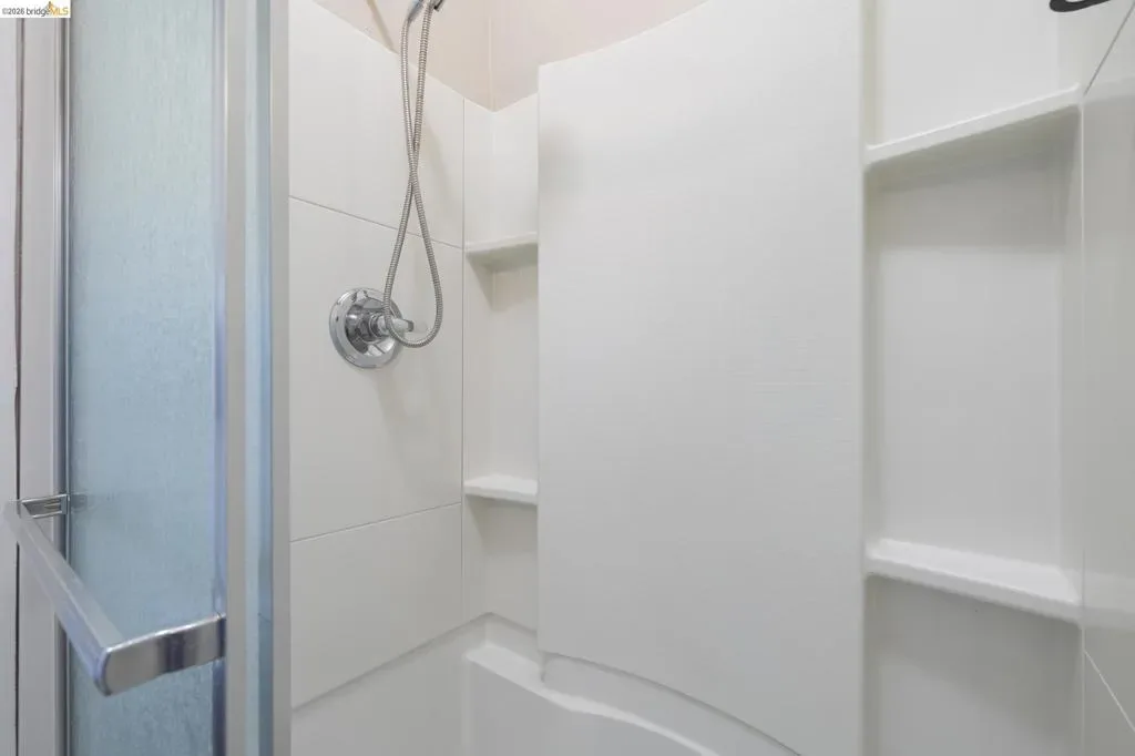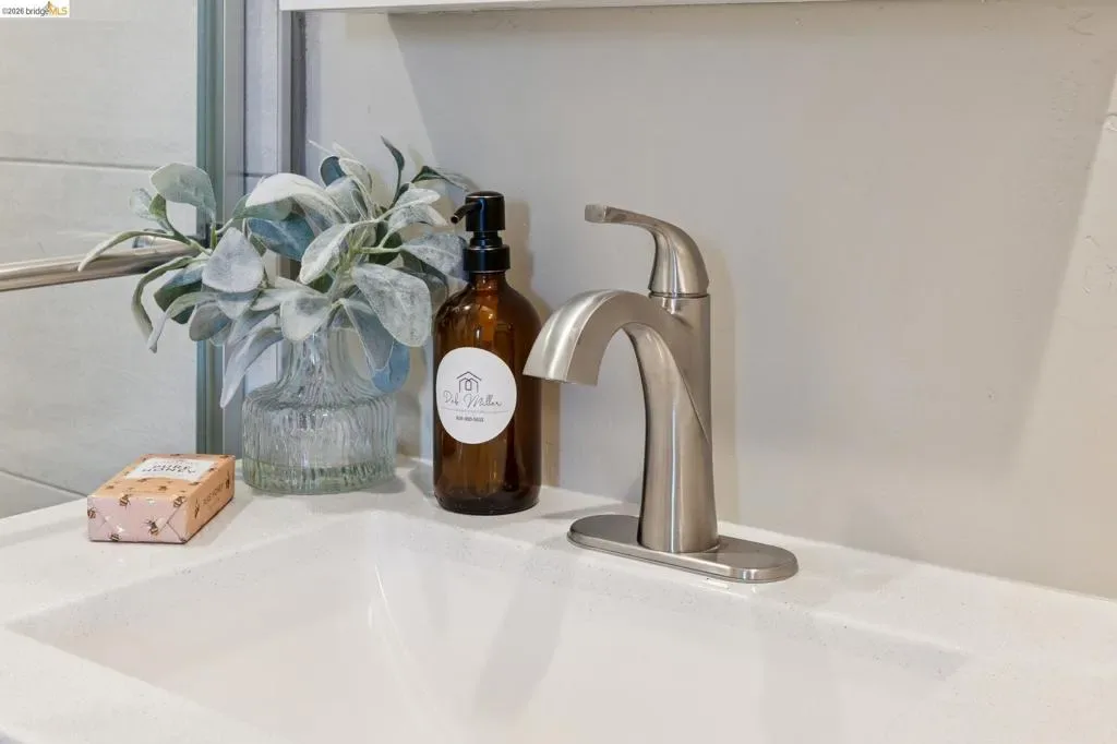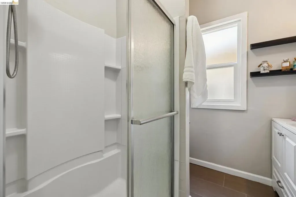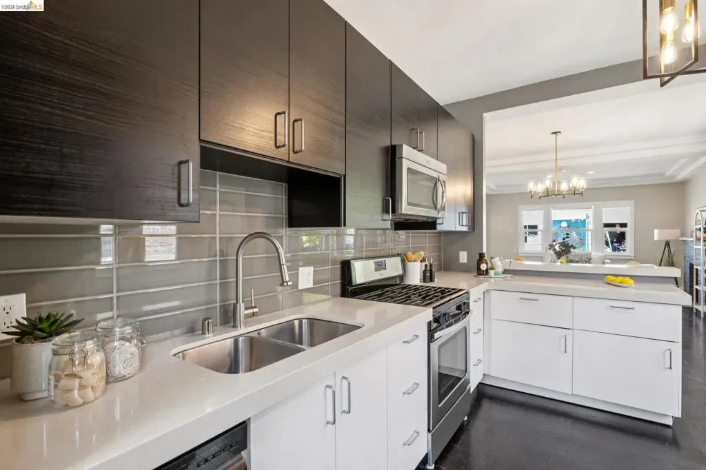 Berkeley Bungalow w/ Modern Flow, close to Berkeley Bowl West. Picket fence says “modern Craftsman-style,” – Layout & upgrades say “contemporary East Bay living.” Located in highly walkable/bikeable W. Berkeley, this 2-bed, 2-bath bungalow combines timeless character w/ thoughtful updates designed for today’s lifestyle. Remodeled inside & out, the home invites you up a landscaped path to a brick porch. Open-concept living, dining, & kitchen area flows seamlessly to private, low-maintenance yard w/ flexible sitting area for relaxing or secure parking pad. Office nook for additional work space off kitchen. Remodeled kitchen features SS appliances, gas range, dishwasher, breakfast bar & stacked washer/dryer. 2 well-sized bedrooms include true primary suite w/ generous closet & updated en-suite bath w/ walk-in shower. 2nd full guest bath w/ modern finishes & floating shelves. Interior details w/ engineered wood flooring throughout, dual-pane windows w/ coverings, trayed ceilings, & stylish designer lighting. Long shared driveway leads to private parking pad behind wide gate for vehiclular access. Walk & Bike Score of 93. Steps from neighborhood faves like Caffe Chiave, Anchalee Thai, Tipsy Yeti. 10-min bike ride to Ashby BART or UC Berkeley or B.Bowl West. BESO Energy Score = 4