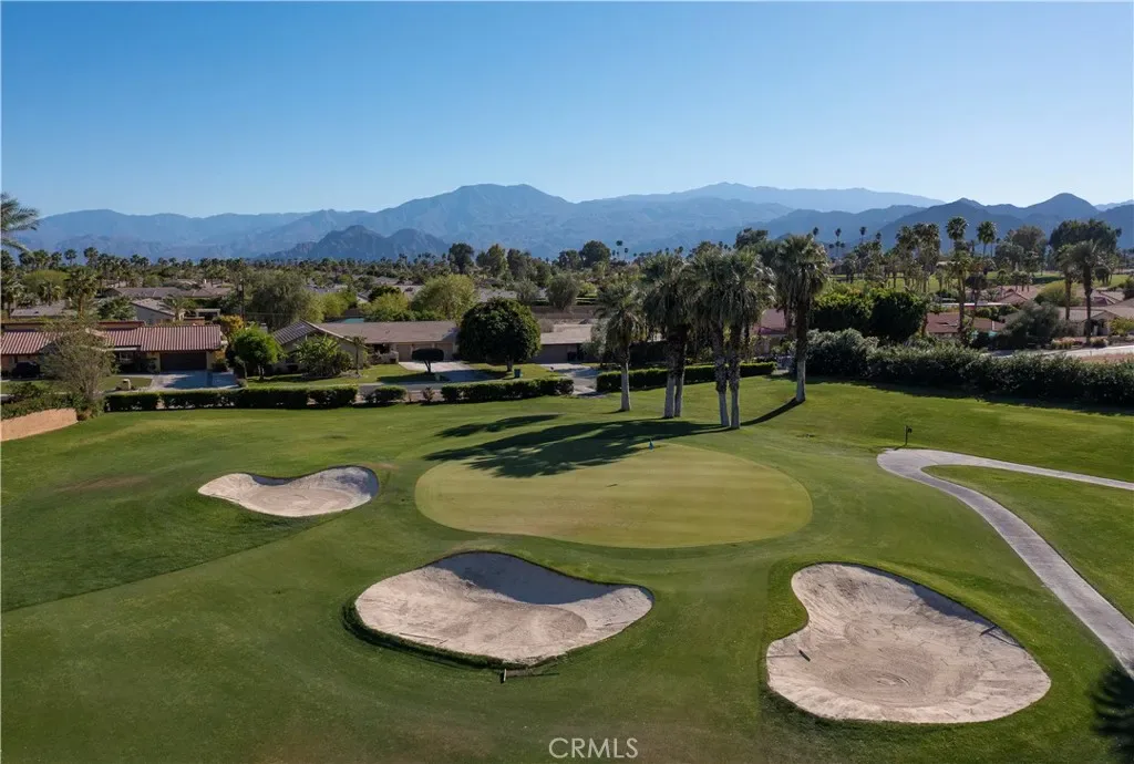 Bermuda Dunes CC – Castle Harbour. This residence occupies a truly rare position, defined by approximately 309 feet of golf course frontage spanning two fairways and a highly sought after south facing orientation, delivering all-day natural light and warm sun filled rear exposure across the pool, outdoor living areas, and primary interior spaces. Set on a premier corner lot overlooking the par-3, 7th hole of the Classic Course, the home captures an ever changing canvas of multiple fairways, the 7th green, and the Santa Rosa Mountains. The home is intentionally designed so that every primary living space opens to golf course views, creating a seamless connection between interior spaces and the surrounding landscape. Recently refreshed with a curated palette of new interior paint and updated flooring, the home presents a renewed sense of cohesion and sophistication, allowing its architectural scale and setting to take center stage.