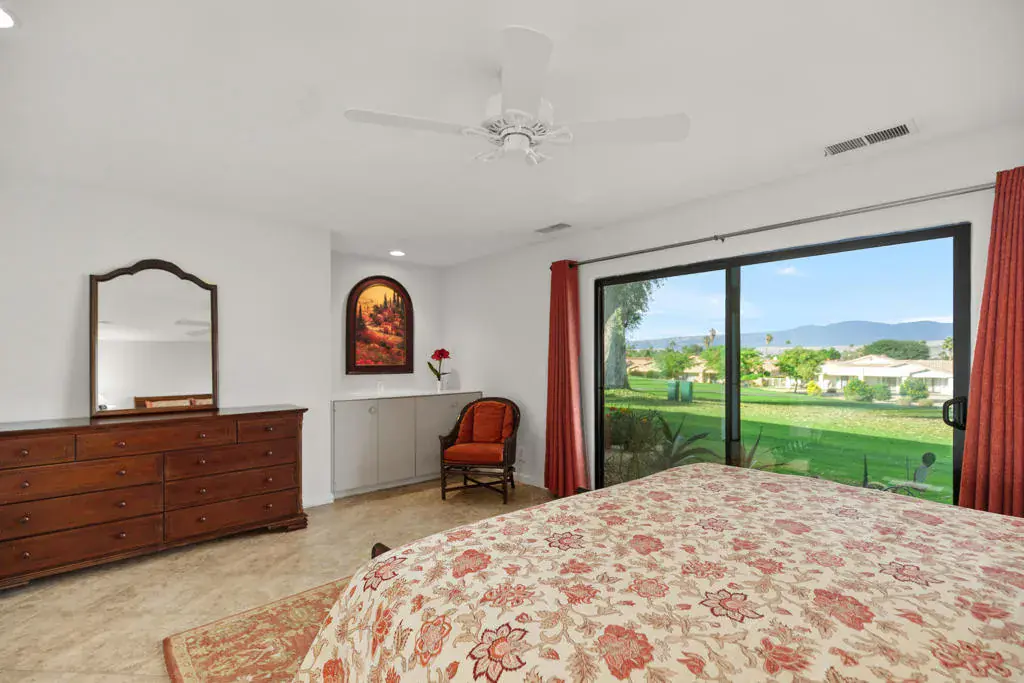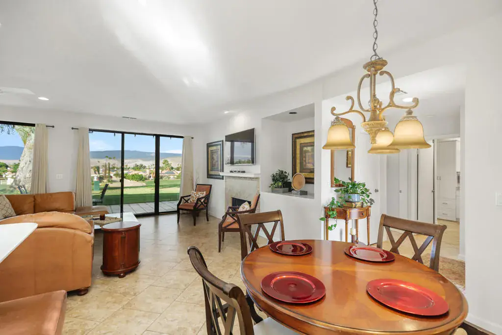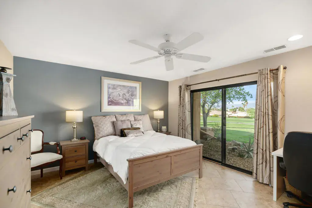 Currently leased November 15 thru January 31, 2027. Available Feb 1, 27 for Seasonal lease at $5,500 per month. This two-bedroom, two-bathroom furnished condo offers 1,644 square feet of living space. The home features stunning mountain views and overlooks the second hole of the famous Bermuda Dunes Country Club, providing a serene and picturesque setting. The great room seamlessly integrates the living room, dining room, and kitchen, creating a warm and inviting atmosphere. Large windows throughout the home allow natural light to flood the space, enhancing the overall sense of brightness and openness. The kitchen has a newer stainless steel refrigerator and a built-in wine cooler. The adjacent dining area offers a comfortable setting for enjoying meals, entertaining guests, or simply gathering with loved ones. The primary bedroom is a comfortable space, offering ample room for a variety of furnishings. The attached bathroom includes an updated vanity, and a walk-in closet creating a private retreat. The additional bedroom is versatile, with an en-suite bathroom. The outdoor space includes views of the golf course where you can enjoy a glass of wine with your friends. The previous owner replaced all sliders and re-tiled the floors with porcelain tile throughout. The condo was freshly painted in 2024. Attached two-car garage/golf cart garage offering lots of storage. IID for lower electric bills. Come and view this lovely property today!