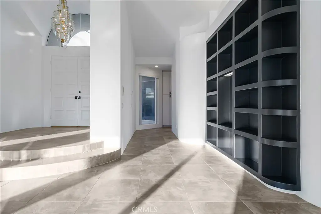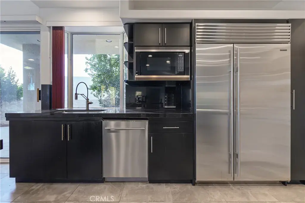 A private gated courtyard and double-door entry lead into a light-filled great room designed for both everyday living and entertaining. The open floor plan is enhanced by a spacious sit-down wet bar that connects the living and dining areas while framing the golf course views. The remodeled kitchen is thoughtfully appointed with an eight-burner Viking gas range, dual electric ovens, Sub-Zero refrigerator, black quartz countertops, and an oversized island ideal for casual dining and gatherings.