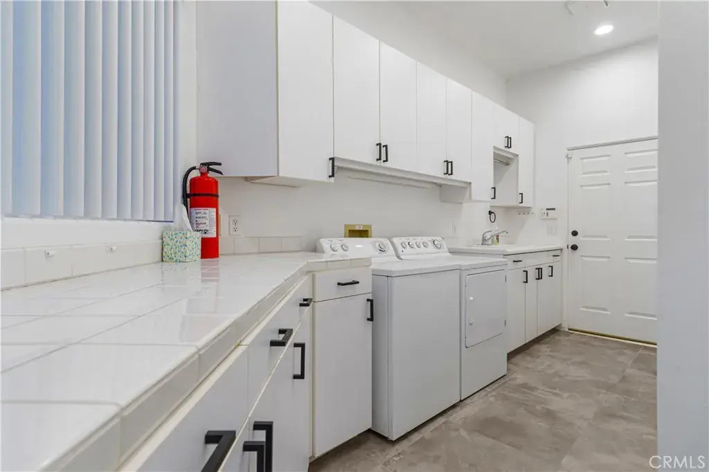 Additional highlights include 24″ x 24″ porcelain tile flooring throughout, newly installed ceiling fans, and a spacious laundry room with extended cabinetry and folding counter space. The three-car garage features its own dedicated air-conditioning unit and polished epoxy flooring. A circular driveway provides added parking and curb appeal.