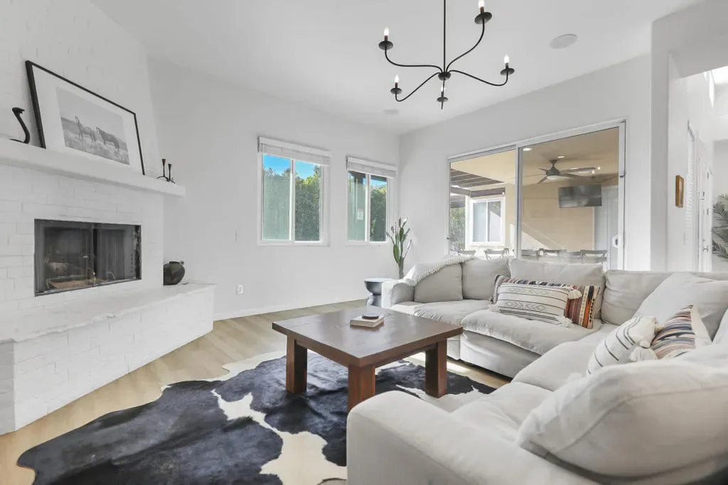 A private retreat, this beautifully redesigned fully furnished home blends classic Spanish Mission with the refined touches of modern desert living. Mature ficus hedges create a secluded outdoor setting featuring a sparkling pool and spa, fire pit with plush seating, hotel-style chase lounges under a shaded pergola, and a generous banquet dining area with bistro lighting, an ideal backdrop for quiet relaxation or hosting guests. Inside, an open kitchen, dining, and living area showcases warm earth tones, custom Spanish tile, exposed wood rafters, and thoughtfully selected furnishings. The circular parlor room offers 14-foot ceilings, a striking chandelier, a dry bar with wine fridge, and comfortable lounge seating. Five well-appointed bedrooms, two with ensuite baths featuring independent climate control, smart TVs, generous closet space, and convenient bedside lighting. The kitchen is designed for the cook with new stainless steel appliances, ample counter space, and additional seating. The living room includes a large sofa, gas fireplace, and custom lighting, while the dining room hosts a long banquet-style table. With its fully automated pool and spa, lush landscaping, and a floor plan that balances style with comfort, this home delivers a private, resort-like experience in the heart of the Coachella Valley.