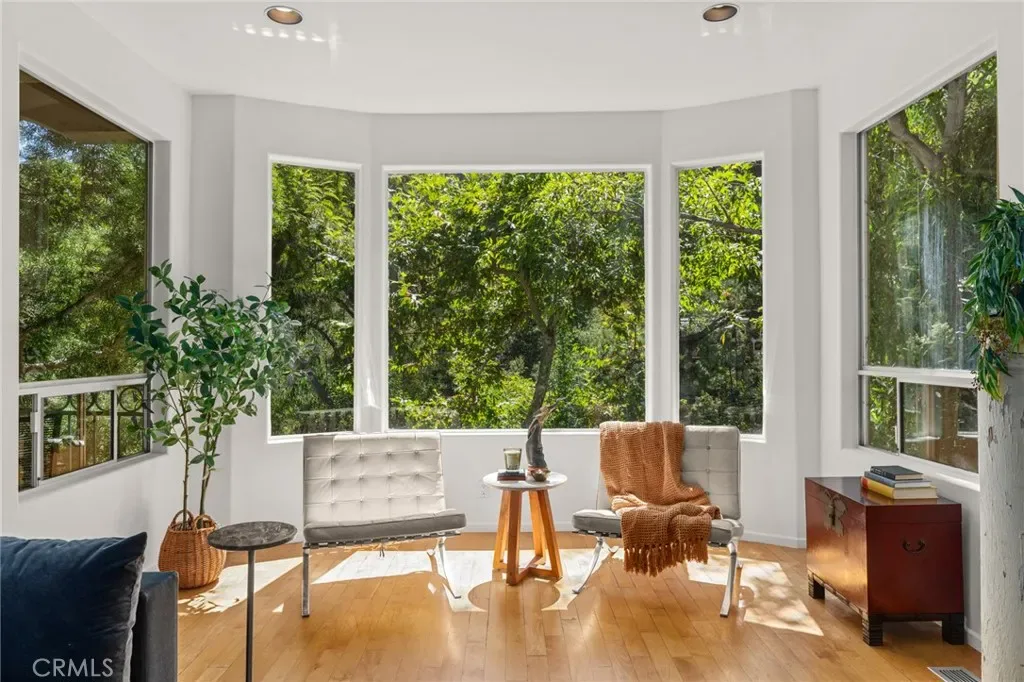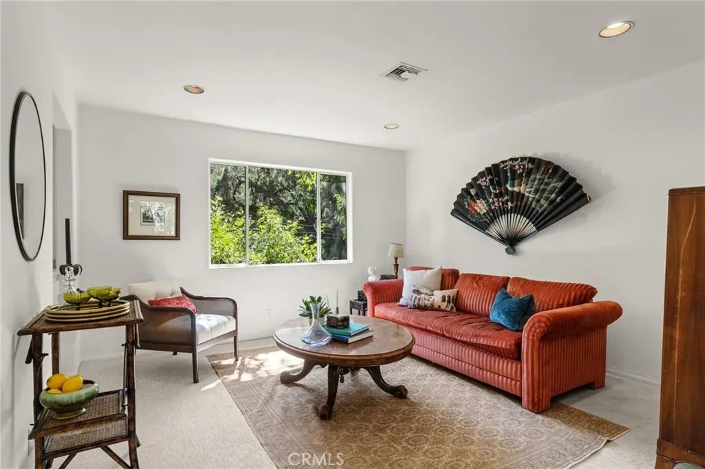 The main level is built for easy entertaining: an open living and dining great room with expansive west-facing windows framing lush hillside views, wood-burning fireplace, and a chef’s kitchen that keeps everyone connected while you host. Also on this floor, a generous second bedroom, bath and private courtyard – an intimate outdoor nook ideal for morning coffee or yoga.