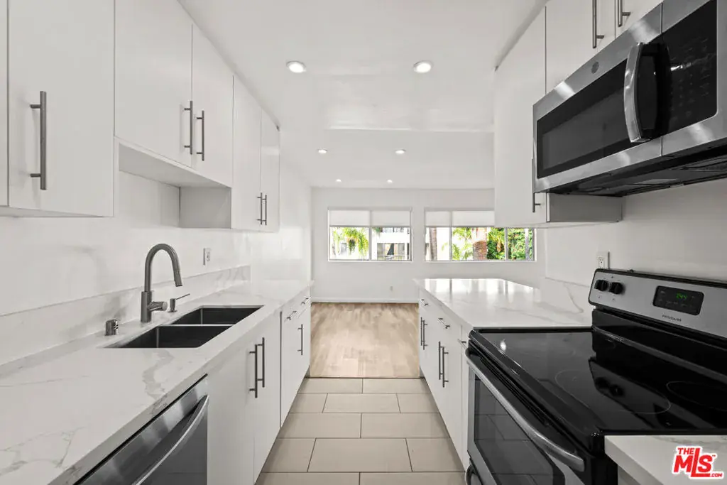 Perched on the 3rd floor in the heart of Beverly Hills, this fully remodeled 2-bedroom, 2-bath residence is bright, airy, and move-in ready. The expansive living and dining area is flooded with natural light from a wall of oversized windows, creating an ideal space for both relaxing and entertaining. The updated kitchen features sleek modern cabinetry, quartz-style countertops, and stainless steel appliances, with a clean, contemporary finish throughout. Both bathrooms have been thoughtfully renovated with designer-style fixtures, modern vanities, and crisp tilework for a spa-like feel. The spacious primary suite offers great scale and comfort, plus direct access to a private balcony perfect for morning coffee or evening downtime. Additional highlights include recessed lighting, wide-plank flooring, and a fresh, modern palette that complements the home’s abundant light.