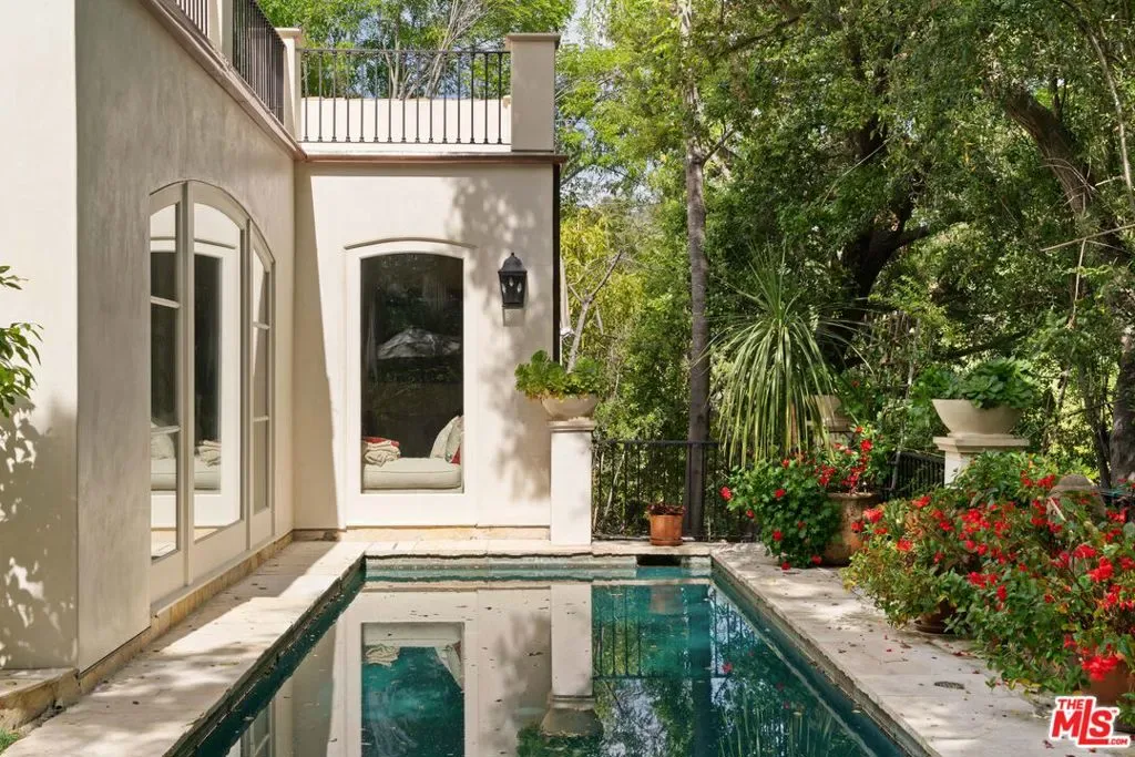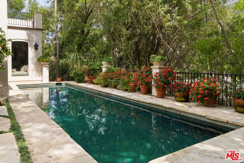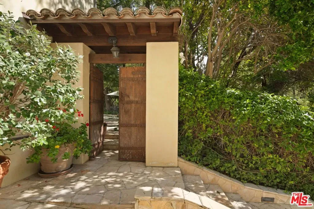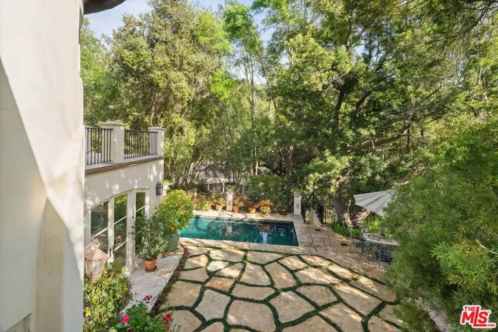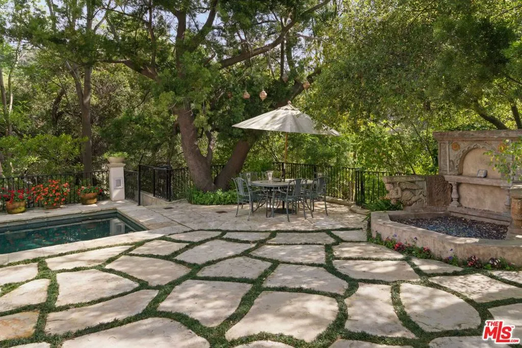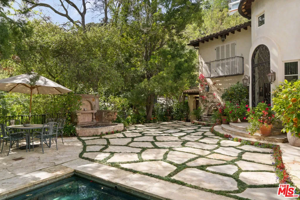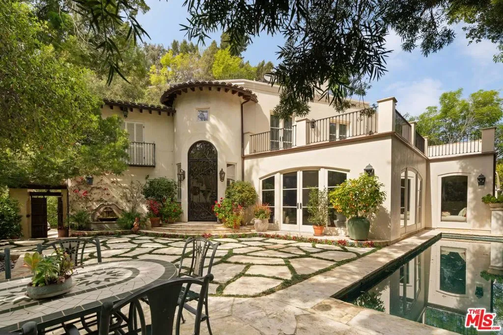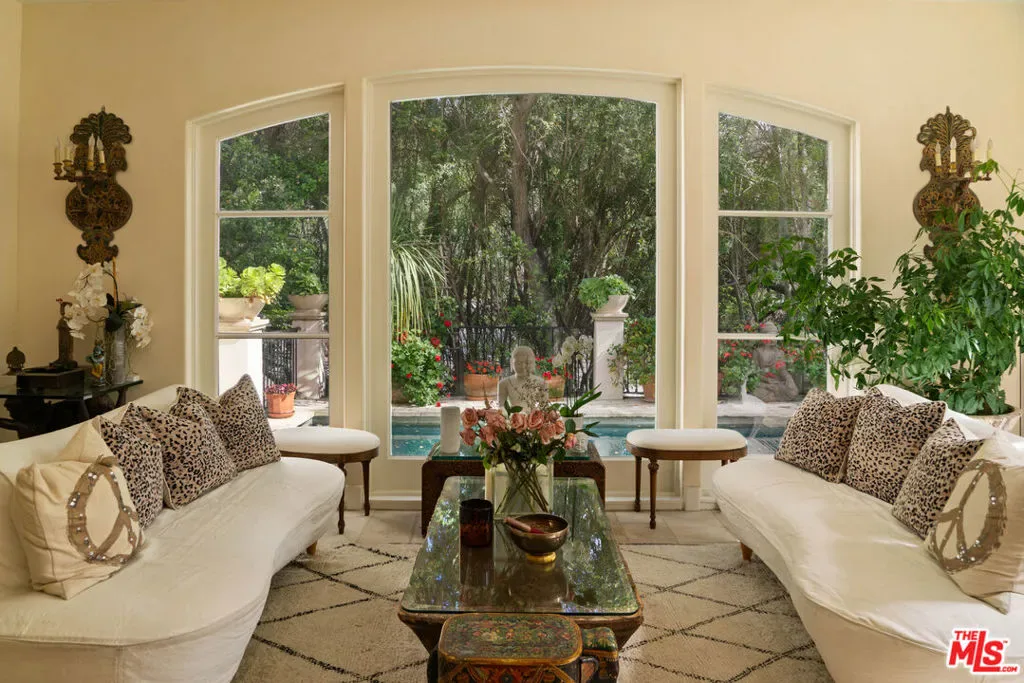 Expansive Estate in BHPO with Art Studio and Pool. Nestled on a semi-private drive in the foothills of Beverly Hills Post Office, enter through the gate to a stunning courtyard complete with a waterfall, pool, firepit and generous space to dine and entertain under open sky. The custom iron door opens to a soaring foyer where the step-down living room is generous and light-filled, anchored by a double-sided fireplace shared with the chef’s kitchen. The kitchen features a large island, cozy breakfast nook, and French doors that open to a serene canyon garden. Off the kitchen, a private maid’s quarters with a full ensuite bath adds rare practicality. The living room flows into a generous screening room which leads to a skylit art studio with bonus basement storage. A separate den/office and laundry room complete the downstairs. Upstairs, two guest suites share a connected bath, while the primary suite is its own world: a large terrace overlooking the pool, luxurious bath, massive closet, and a private meditation room. A home built for epic gatherings where a sweeping floorplan flows from indoors to out, with surround sound speakers in every room and outside that take your hosting to the next level. A canyon retreat of extraordinary character and privacy, entirely one of a kind.