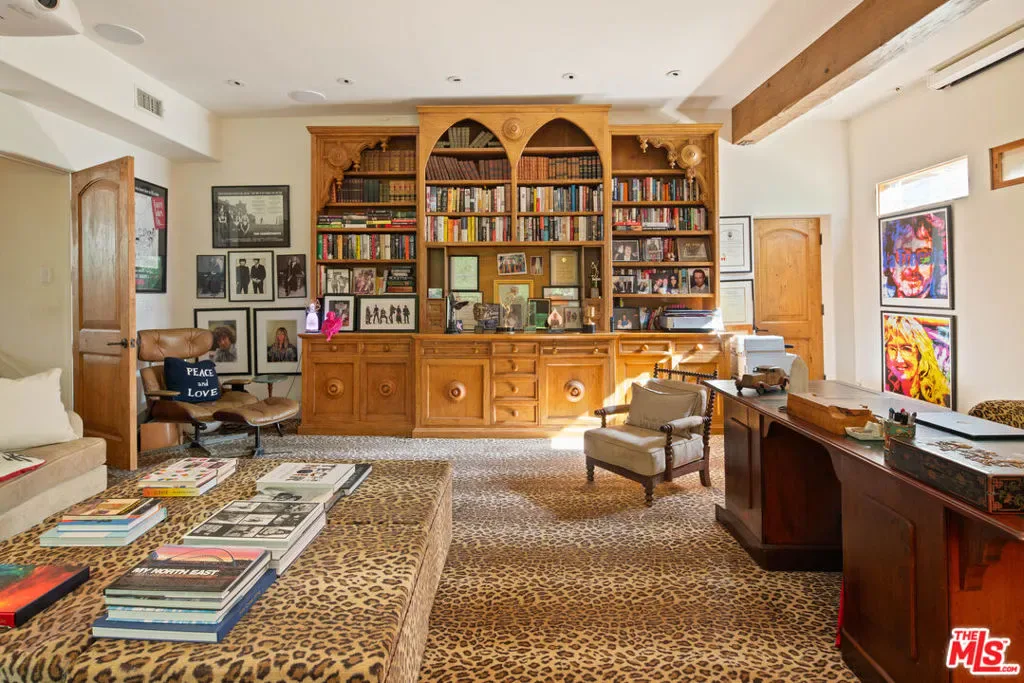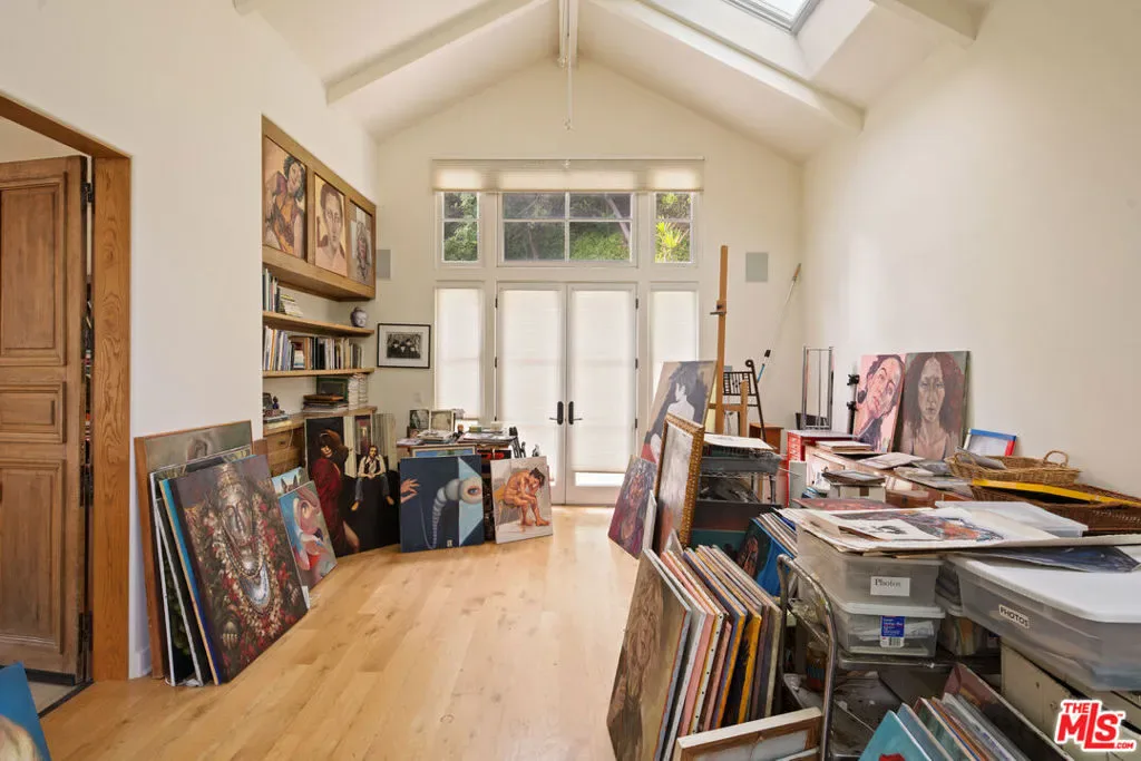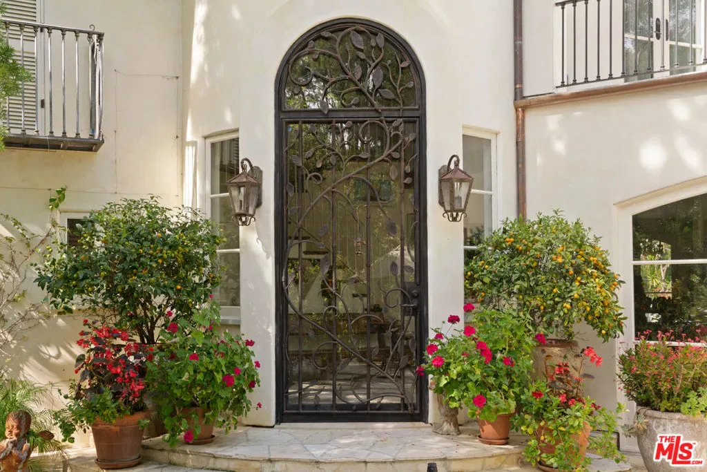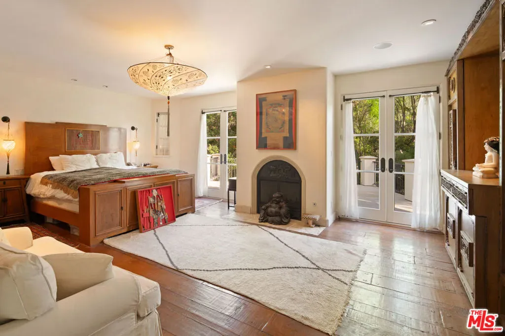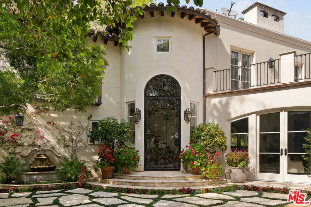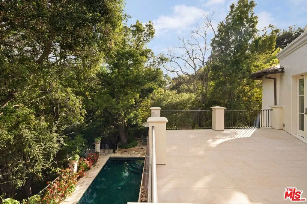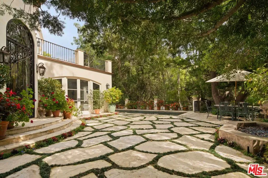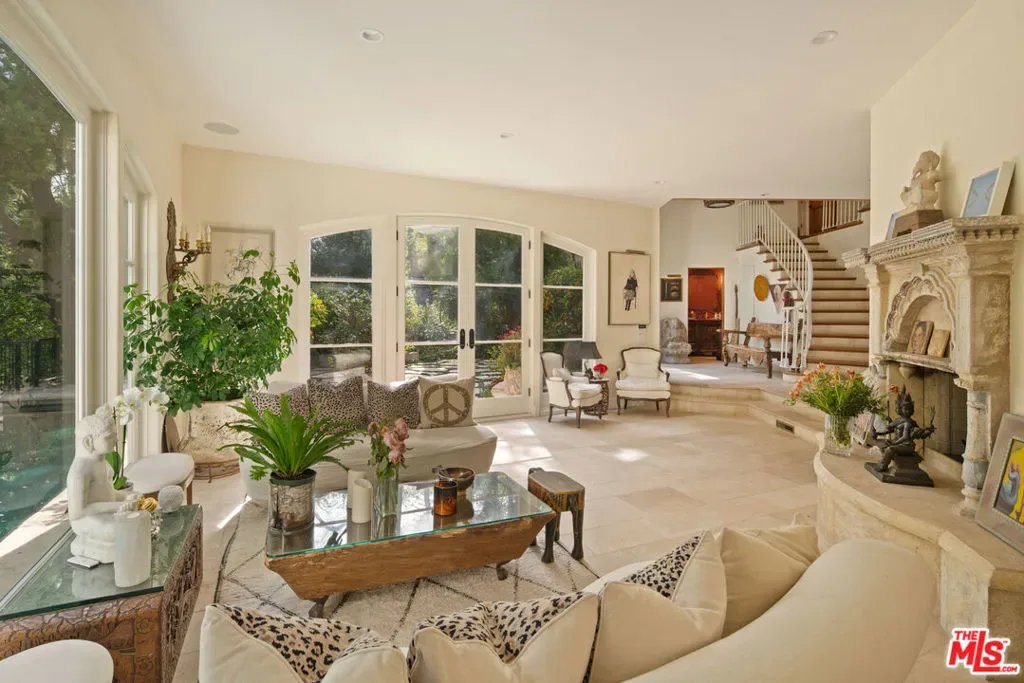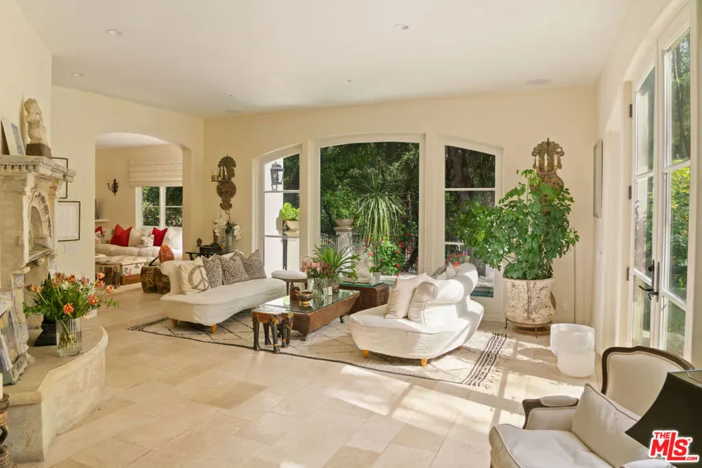 Expansive Estate in BHPO with Art Studio and Pool. Nestled on a semi-private drive in the foothills of Beverly Hills Post Office, enter through the gate to a stunning courtyard complete with a waterfall, pool, firepit and generous space to dine and entertain under open sky. The custom iron door opens to a soaring foyer where the step-down living room is generous and light-filled, anchored by a double-sided fireplace shared with the chef’s kitchen. The kitchen features a large island, cozy breakfast nook, and French doors that open to a serene canyon garden. Off the kitchen, a private maid’s quarters with a full ensuite bath adds rare practicality. The living room flows into a generous screening room which leads to a skylit art studio with bonus basement storage. A separate den/office and laundry room complete the downstairs. Upstairs, two guest suites share a connected bath, while the primary suite is its own world: a large terrace overlooking the pool, luxurious bath, massive closet, and a private meditation room. A home built for epic gatherings where a sweeping floorplan flows from indoors to out, with surround sound speakers in every room and outside that take your hosting to the next level. A canyon retreat of extraordinary character and privacy, entirely one of a kind.
