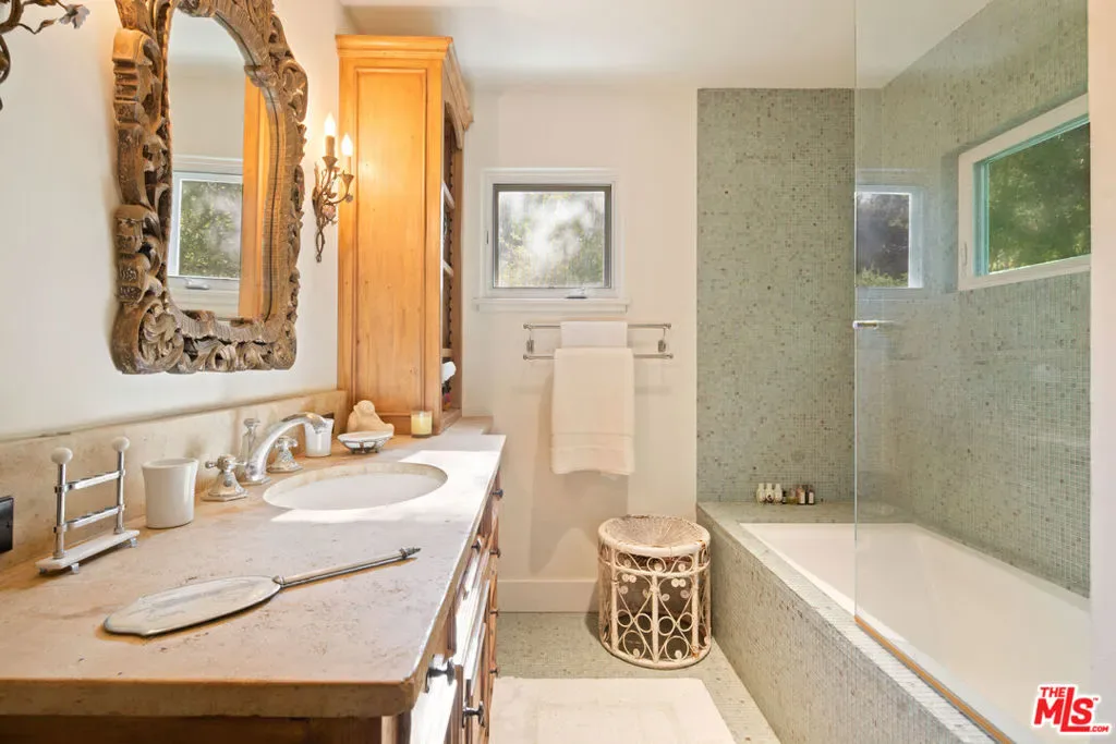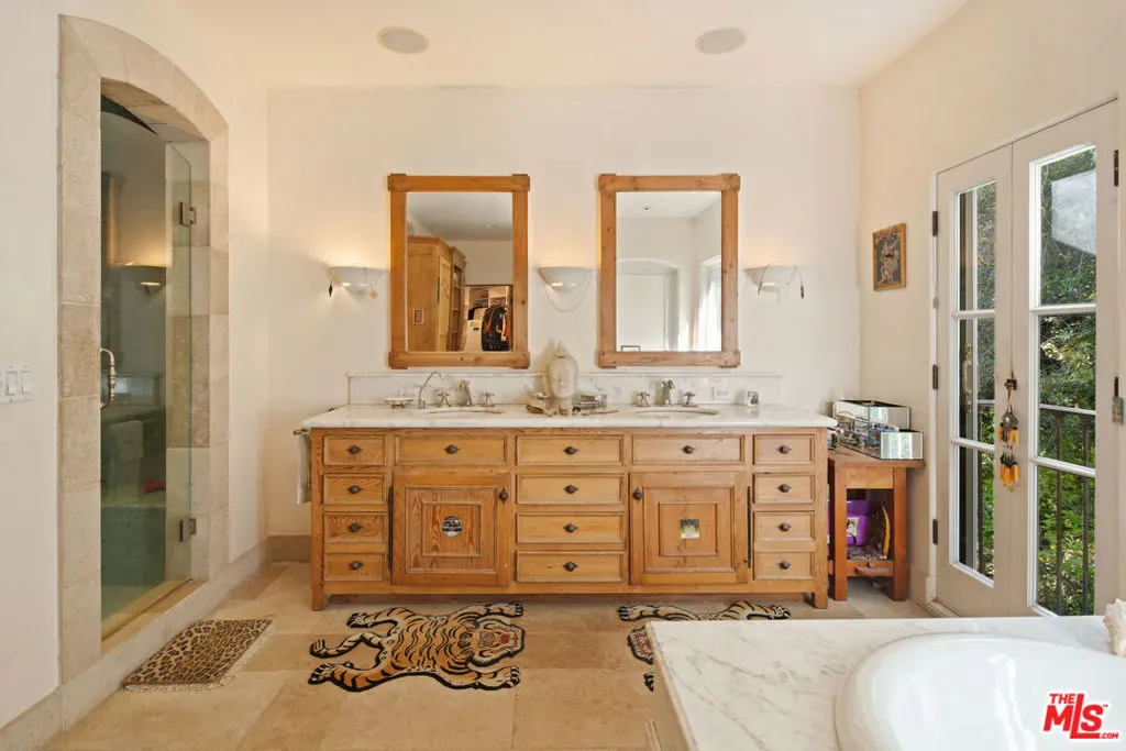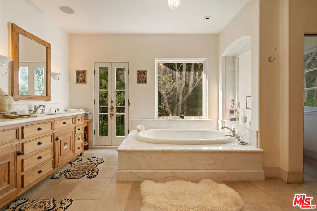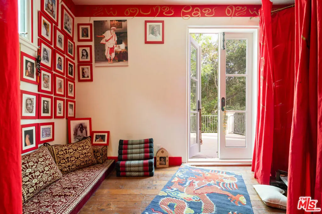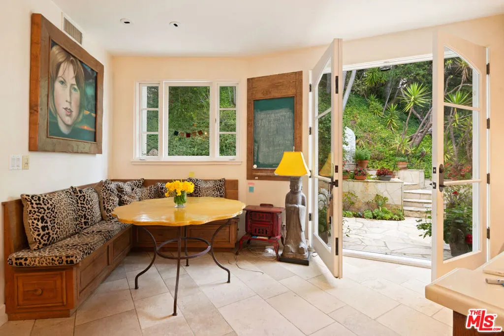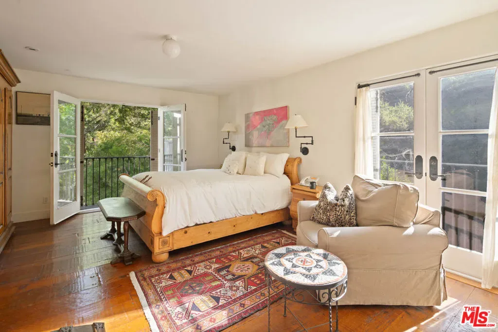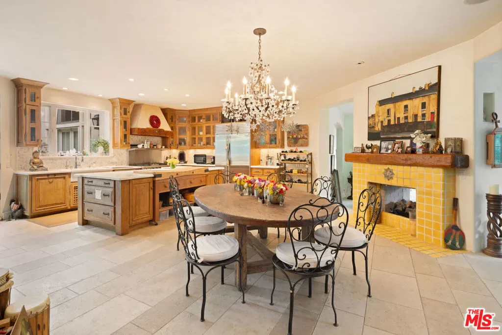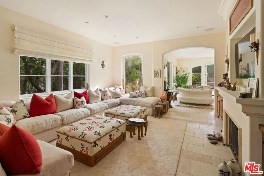 Expansive Estate in BHPO with Art Studio and Pool. Nestled on a semi-private drive in the foothills of Beverly Hills Post Office, enter through the gate to a stunning courtyard complete with a waterfall, pool, firepit and generous space to dine and entertain under open sky. The custom iron door opens to a soaring foyer where the step-down living room is generous and light-filled, anchored by a double-sided fireplace shared with the chef’s kitchen. The kitchen features a large island, cozy breakfast nook, and French doors that open to a serene canyon garden. Off the kitchen, a private maid’s quarters with a full ensuite bath adds rare practicality. The living room flows into a generous screening room which leads to a skylit art studio with bonus basement storage. A separate den/office and laundry room complete the downstairs. Upstairs, two guest suites share a connected bath, while the primary suite is its own world: a large terrace overlooking the pool, luxurious bath, massive closet, and a private meditation room. A home built for epic gatherings where a sweeping floorplan flows from indoors to out, with surround sound speakers in every room and outside that take your hosting to the next level. A canyon retreat of extraordinary character and privacy, entirely one of a kind.