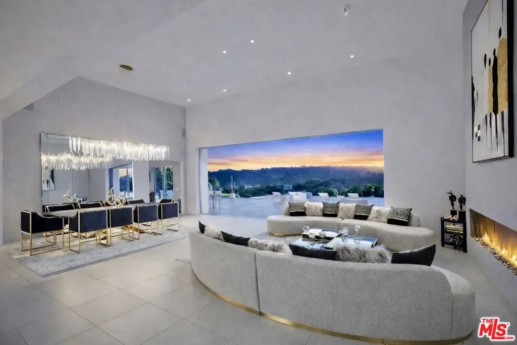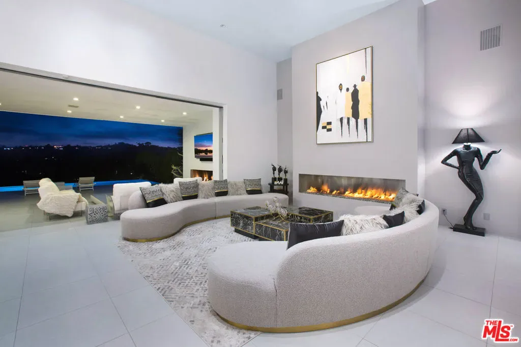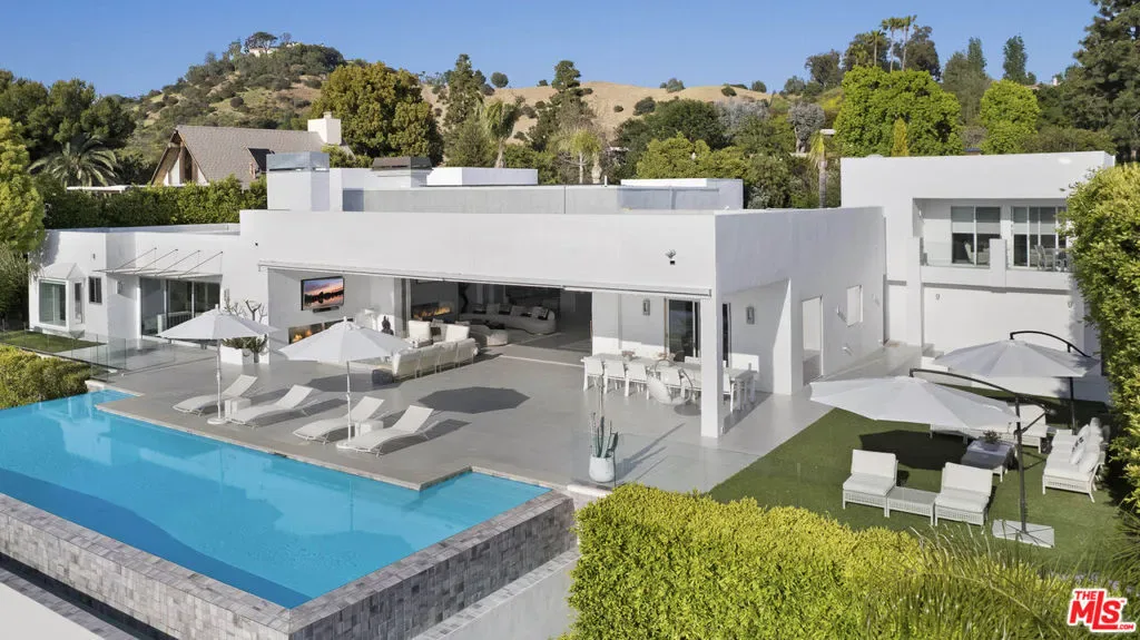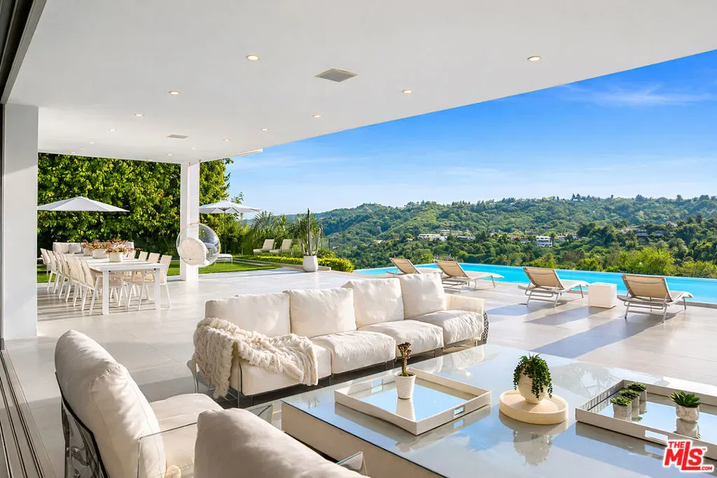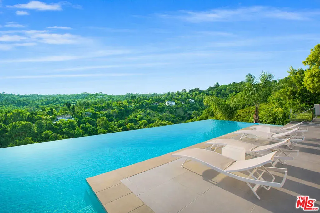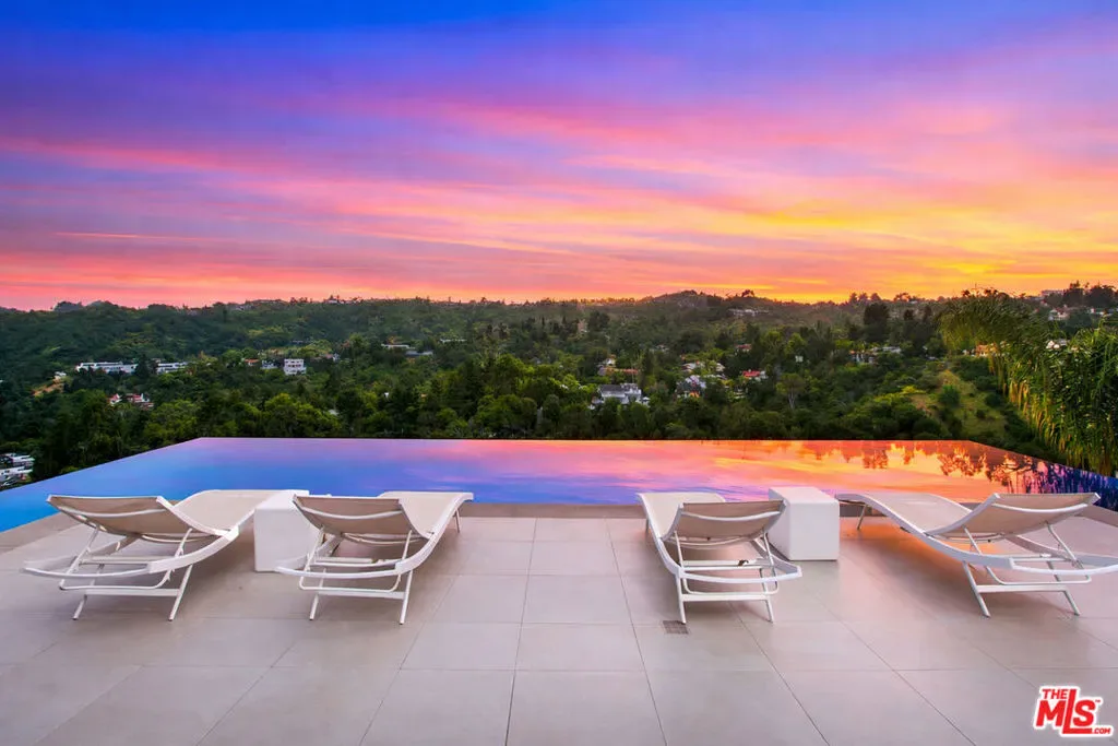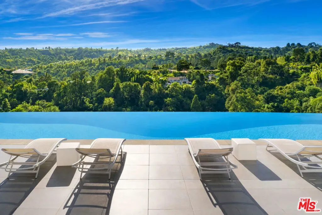 Privately gated and positioned at the top of a quiet Beverly Hills cul-de-sac, this refined architectural contemporary residence offers exceptional privacy, with sweeping 180-degree panoramic canyon and sunset views with no roofline obstruction. Soaring approximately 15-foot ceilings open seamlessly through Fleetwood pocket doors to an infinity-edge pool and expansive outdoor living areas, creating a true indoor-outdoor experience with direct access from every principal space. Designed for both elegant entertaining and everyday living, the home captures natural light, air, and expansive views throughout, enhanced by a retractable skylight in the hallway. The home offers two primary suites. The primary suite features two full bathrooms, two separate walk-in dressing rooms, and dual sitting areas, serving as a private retreat with motorized blackout and daytime shades. Four additional en-suite bedrooms are thoughtfully positioned for comfort and discretion, including a separate guest wing and lower-level suites. Additional highlights include a powder room, custom chef’s kitchen with professional-grade Miele appliances, media room, executive office, entertaining bar, staff quarters, multiple covered outdoor living and dining areas complete with a fireplace, and two solar panel systems. The infinity-edge pool, grassy terrace, and covered loggia are perfectly oriented to maximize the serene hillside setting and unobstructed sunset outlooks. Finished with custom limestone and hardwood flooring, curated designer details, and a state-of-the-art security system with cameras and alarm, this architectural estate offers a rare combination of privacy, views, and refined modern living just minutes from Rodeo Drive, The Beverly Hills Hotel, and the city’s most prestigious dining and shopping destinations.