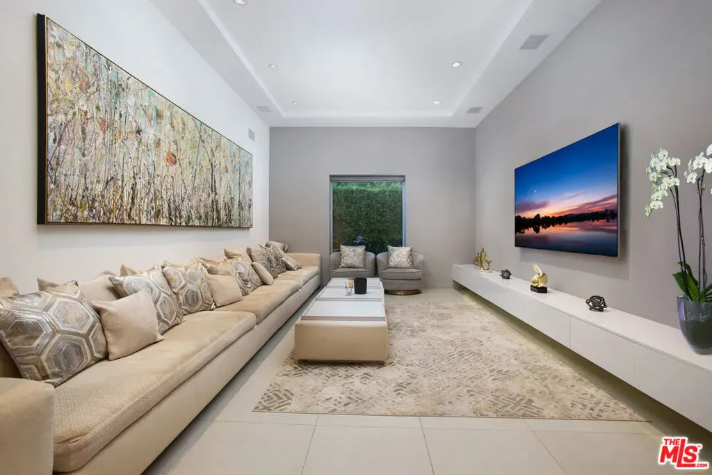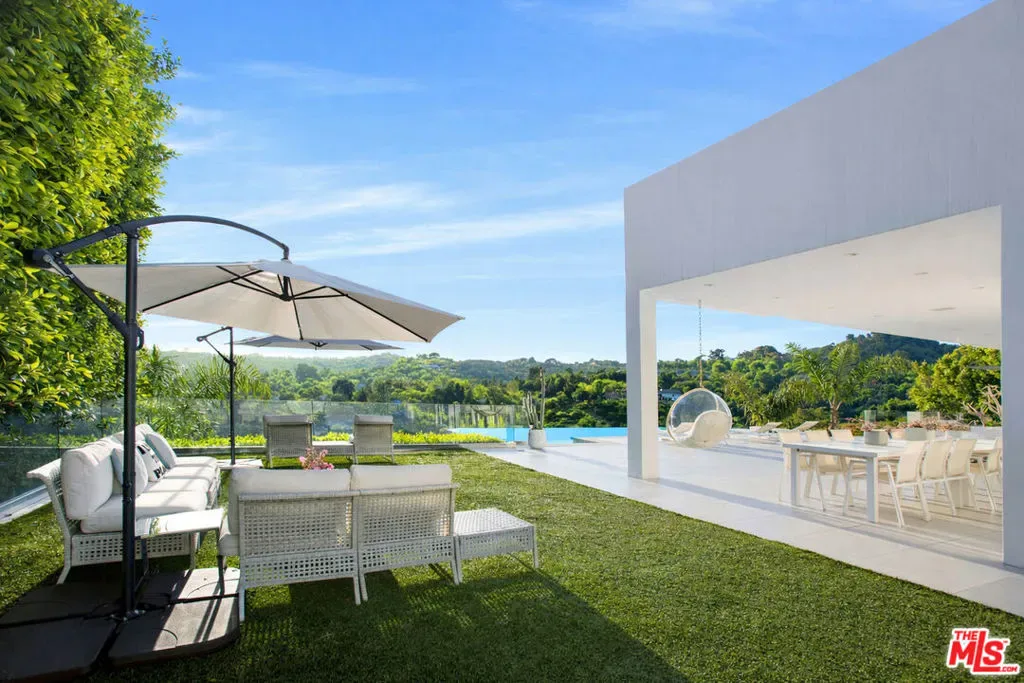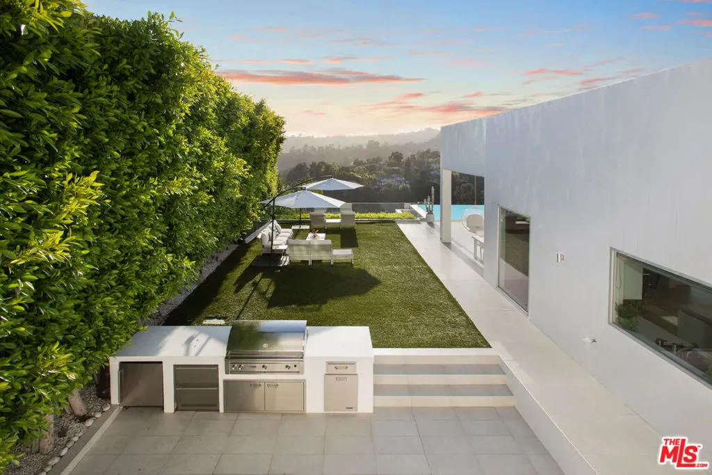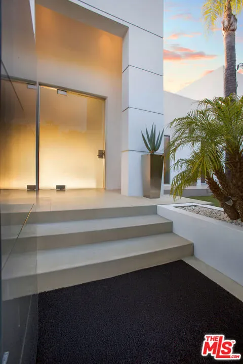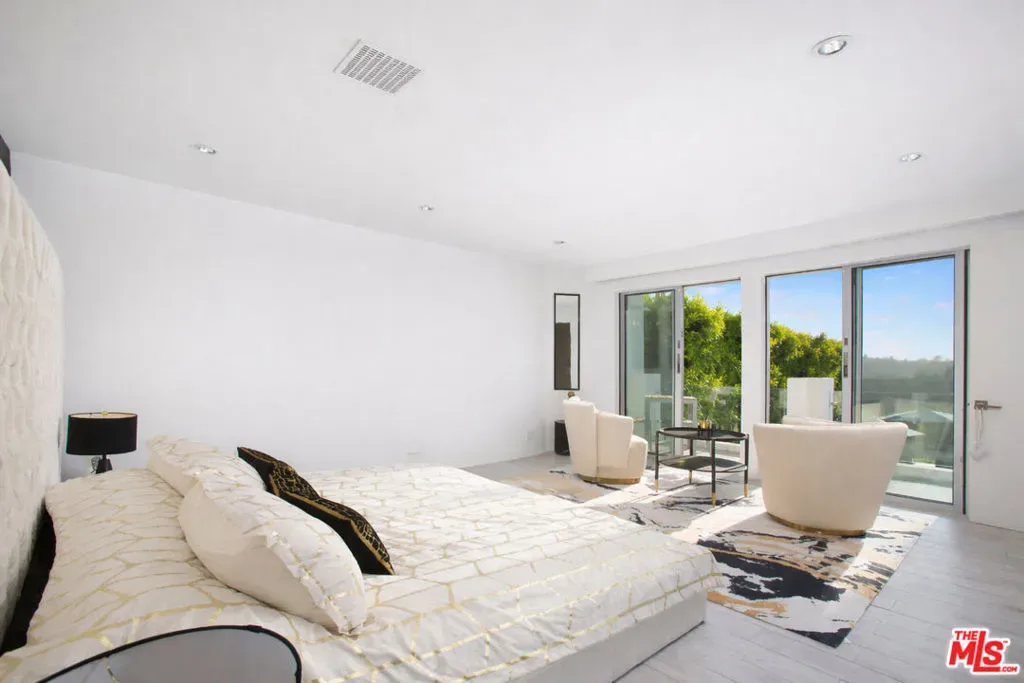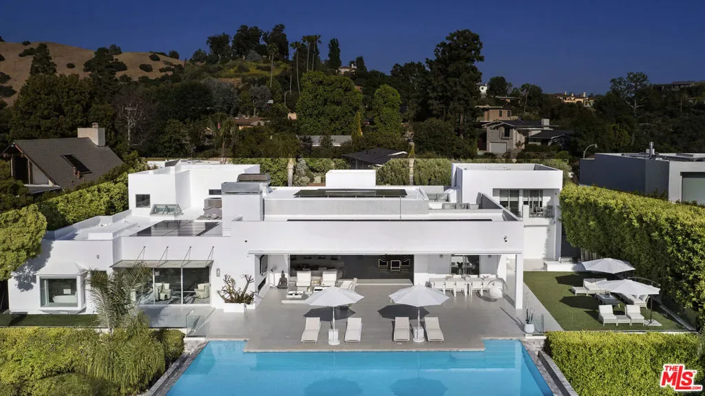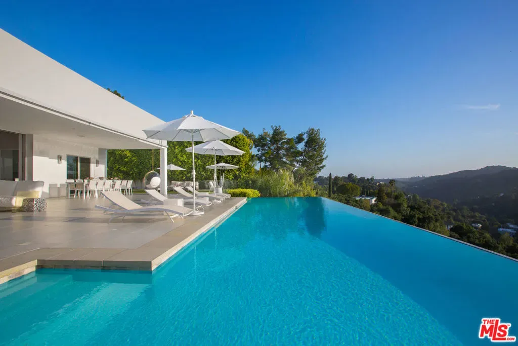 Privately gated and positioned at the top of a quiet Beverly Hills cul-de-sac, this refined architectural contemporary residence offers exceptional privacy, with sweeping 180-degree panoramic canyon and sunset views with no roofline obstruction. Soaring approximately 15-foot ceilings open seamlessly through Fleetwood pocket doors to an infinity-edge pool and expansive outdoor living areas, creating a true indoor-outdoor experience with direct access from every principal space. Designed for both elegant entertaining and everyday living, the home captures natural light, air, and expansive views throughout, enhanced by a retractable skylight in the hallway. The home offers two primary suites. The primary suite features two full bathrooms, two separate walk-in dressing rooms, and dual sitting areas, serving as a private retreat with motorized blackout and daytime shades. Four additional en-suite bedrooms are thoughtfully positioned for comfort and discretion, including a separate guest wing and lower-level suites. Additional highlights include a powder room, custom chef’s kitchen with professional-grade Miele appliances, media room, executive office, entertaining bar, staff quarters, multiple covered outdoor living and dining areas complete with a fireplace, and two solar panel systems. The infinity-edge pool, grassy terrace, and covered loggia are perfectly oriented to maximize the serene hillside setting and unobstructed sunset outlooks. Finished with custom limestone and hardwood flooring, curated designer details, and a state-of-the-art security system with cameras and alarm, this architectural estate offers a rare combination of privacy, views, and refined modern living just minutes from Rodeo Drive, The Beverly Hills Hotel, and the city’s most prestigious dining and shopping destinations.