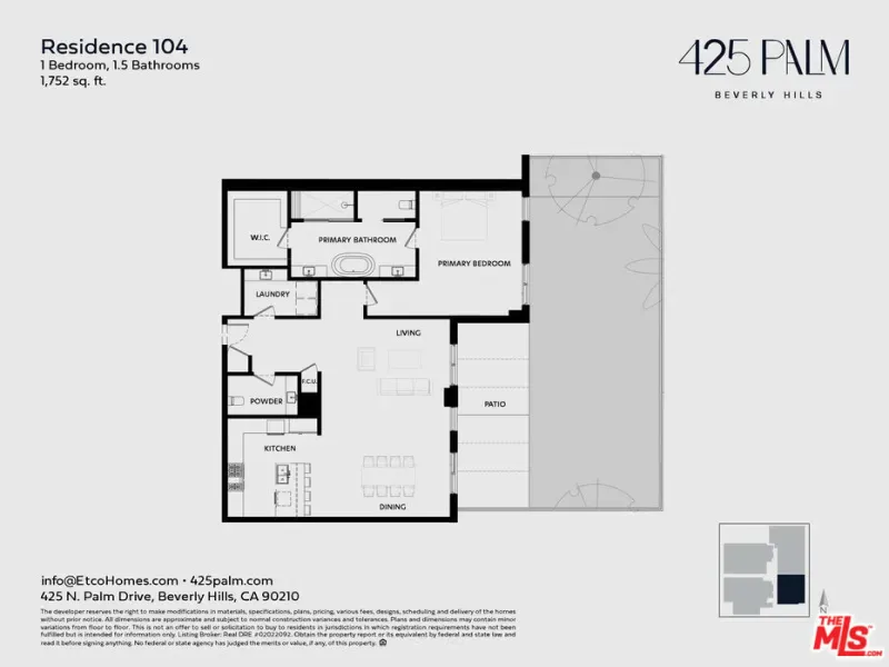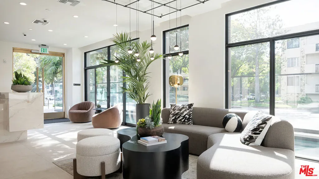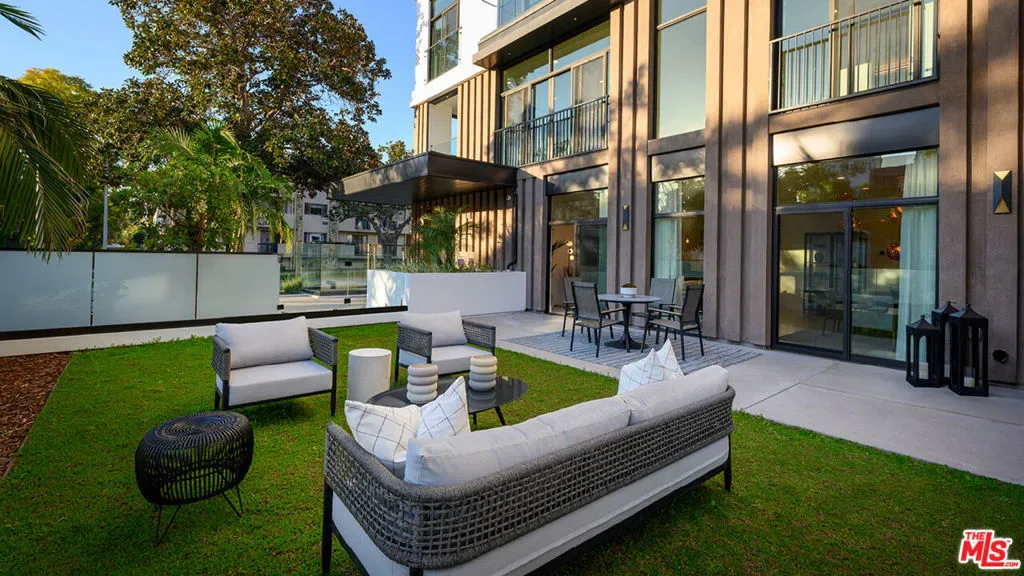 Welcome to 425 Palm in prime Beverly Hills. Residence 104 offers an expansive one-bedroom, one-and-a-half-bath floor plan with 1,752 interior SF and 1,194 exterior SF. The thoughtfully designed open-concept layout flows seamlessly from the gourmet kitchen to the formal dining and living areas, extending to an expansive patio ideal for indoor-outdoor living. Impeccably designed interior finishes feature Wolf and Sub-Zero appliances, a Miele built-in coffee system, Caesarstone countertops in the kitchen and baths, Italian Gessi fixtures, and custom imported Linea Quattro European cabinetry. Additionally, the residence offers two side-by-side parking spaces. 425 Palm provides an on-site fitness center with top-of-the-line equipment, an outdoor gourmet kitchen, wood decking with sunken spa, a dedicated lobby with 24-hour on-site staff, and controlled access.