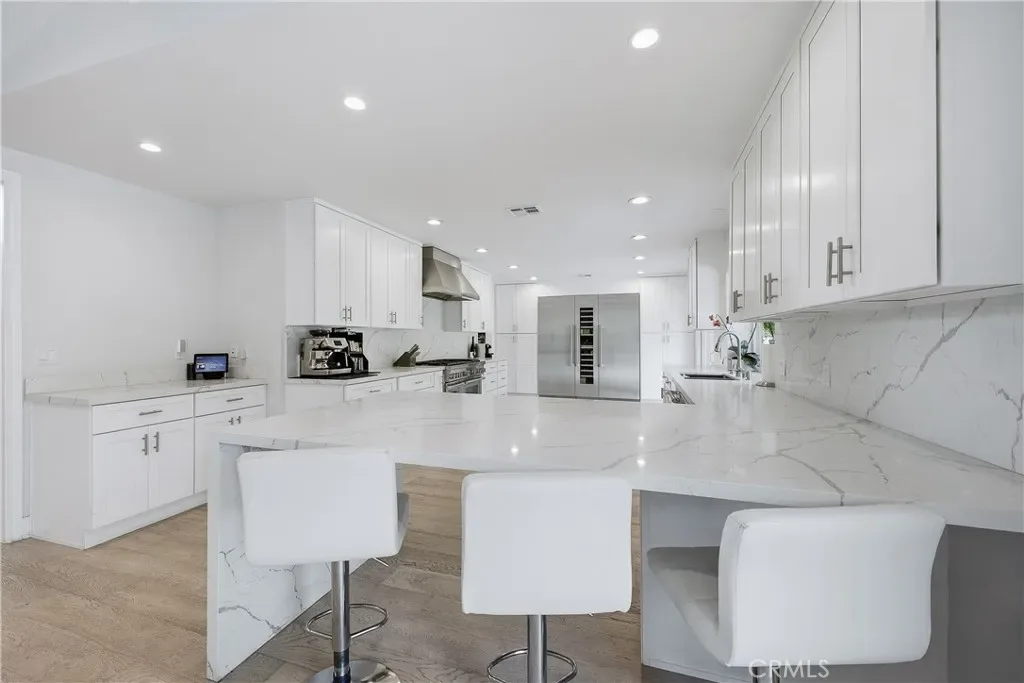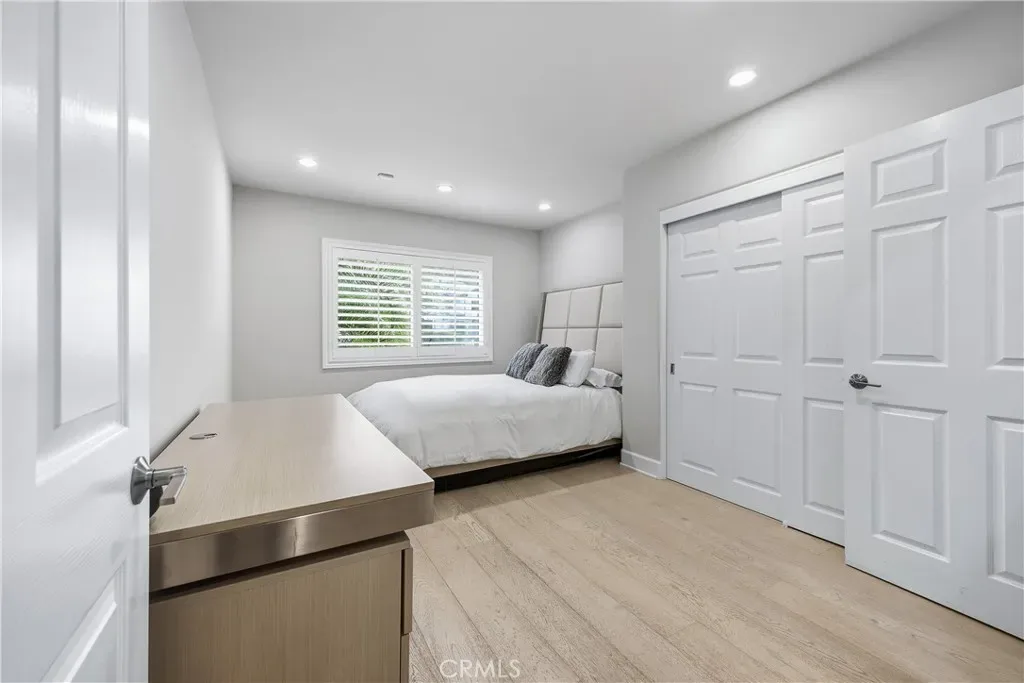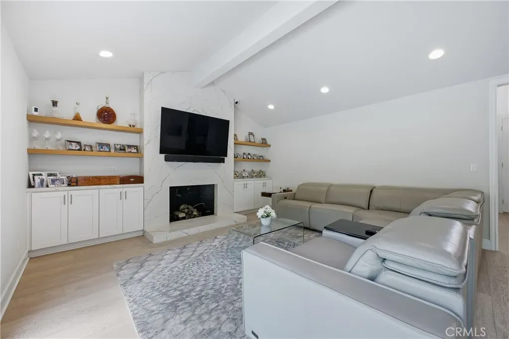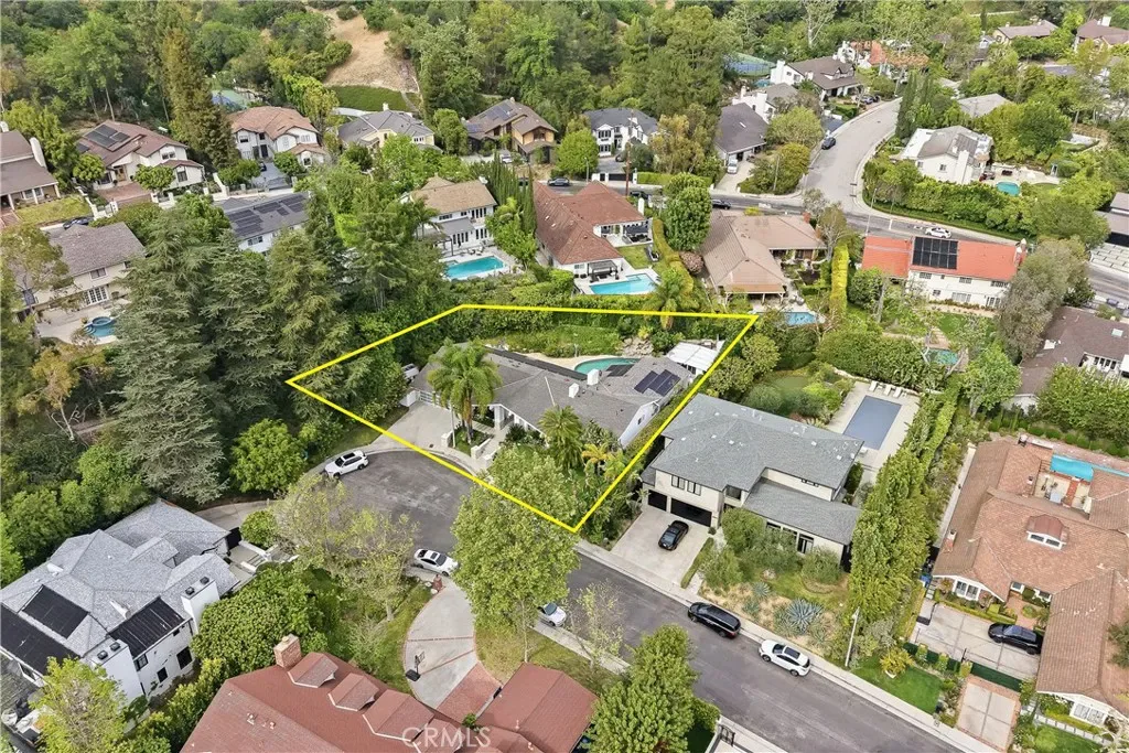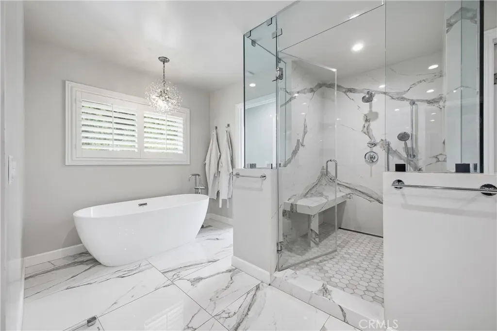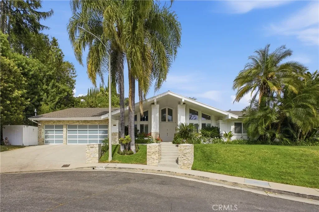 Discover this stunning and spacious 5-bedroom, 5.5-bathroom family home, ideally positioned at the end of a quiet and highly sought-after cul-de-sac. Step inside to a bright, airy interior featuring beautiful European oak flooring throughout and a thoughtfully designed open-concept layout, perfect for both everyday living and effortless entertaining. The expansive kitchen and family room seamlessly lead to a private, low-maintenance backyard oasis, complete with a sparkling pool and spa, as well as an inviting outdoor patio and lounge area featuring a fireplace and outdoor shower, ideal for enjoying outdoor living year-round. The kitchen is equipped with sleek countertops, high-end appliances, and a wine refrigerator, blending style with functionality. Both the formal living room and family room showcase elegant fireplaces with dramatic floor-to-ceiling marble feature walls, adding warmth and sophistication. The luxurious primary suite serves as a serene retreat, highlighted by French doors that open to the backyard and a newly remodeled, spa-inspired bathroom. This elegant space features porcelain tile throughout, dual vanities, dual separate toilet rooms, a walk-in shower, a freestanding soaking tub, and a spacious walk-in closet. Three additional bedrooms offer en-suite bathrooms, including one privately situated on the opposite side of the home, perfect for guests or multigenerational living. An additional hallway bathroom is beautifully finished with marble flooring, porcelain tile, and a steam shower, creating a true at-home spa experience. Additional highlights include newer solar panels, a well-appointed garage with built-in storage, and an overall sense of peace and privacy that makes this home truly exceptional. Located in a prime area, this is a must-see property you won’t want to miss.