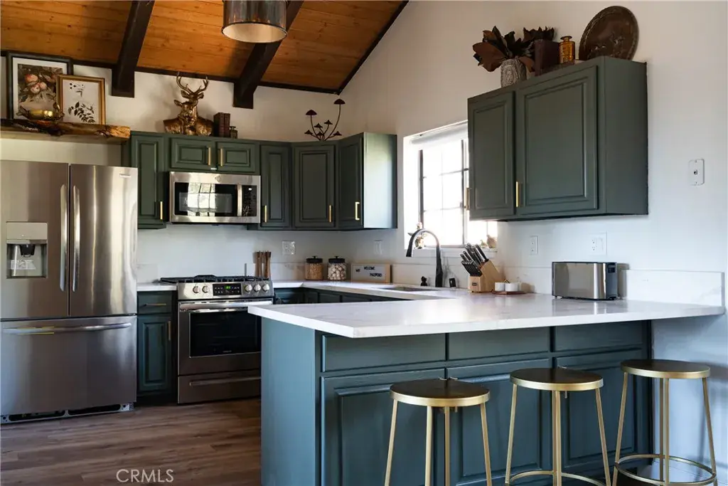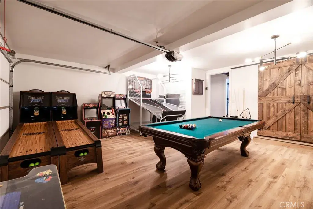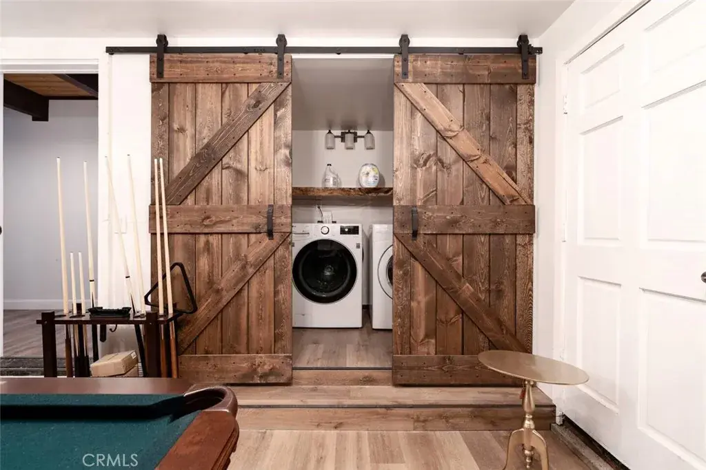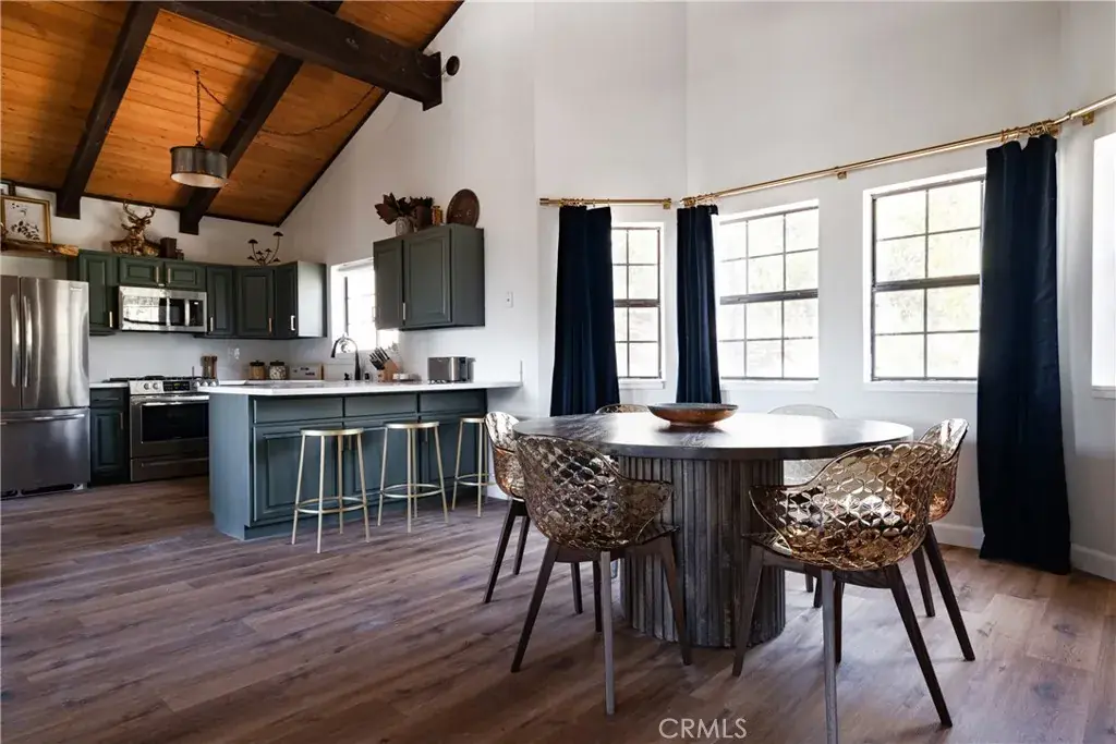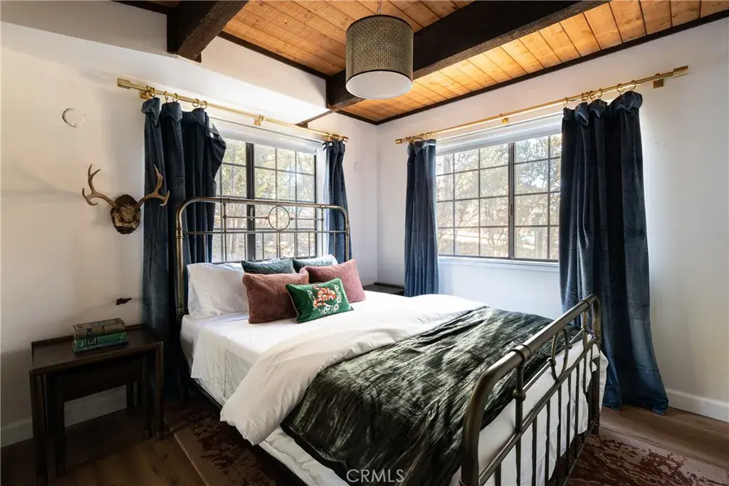 On a quiet Big Bear City street, this thoughtfully remodeled and professionally designed mountain home blends architectural character with modern comfort in a way that feels elevated and inviting. Vaulted, wood-beamed ceilings, rich textures, and curated design moments create a space that feels warm, expressive, and welcoming, ideal for those who value creativity, connection, and a slower mountain rhythm. The main level is designed for gathering and everyday living, anchored by a striking stone fireplace and filled with natural light. An open kitchen with generous prep space, breakfast bar seating, and modern appliances flows easily into a spacious dining area, perfect for long dinners, creative work sessions, or hosting friends and family. Multiple living areas offer flexibility for conversation, quiet moments, or settling in after a day outdoors. With four bedrooms and two bathrooms, the layout comfortably accommodates families and guests while still allowing separation between living and sleeping spaces. The lower level offers additional living space and a large recreation area, creating room for games, hobbies, or a flexible studio-style setup depending on your needs. Throughout the home, finishes and details strike a balance between warmth and refinement, with a palette that feels grounded, calm, and timeless. Outdoor spaces include a dedicated fire pit area and a spa tucked into a private setting, ideal for evenings under the stars or slow mornings surrounded by trees. Practical upgrades include air conditioning, an EV charger, and a two-car attached garage that has functioned as a versatile game and recreation space, supporting both full-time living and extended mountain stays. Conveniently located near trails, the lake, ski resorts, and local amenities, this home offers a rare combination of privacy, proximity, and personality. A place to create, recharge, and make memories without sacrificing comfort or style.