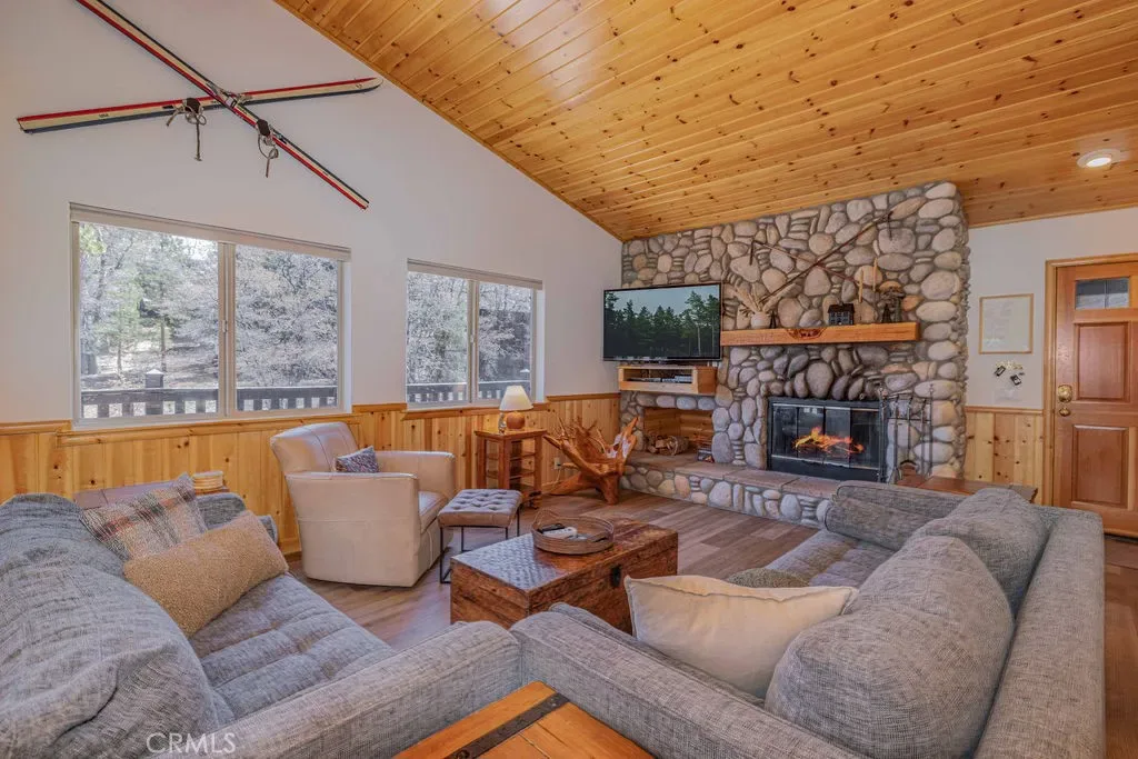 Welcome to your dream retreat in Moonridge! This turnkey home offers the perfect blend of rustic charm and with a modern stylistic touch. Nestled in a peaceful alpine setting, this ideal escape features 3 bedrooms, including a spacious master suite, and 2 baths. As you step inside, you’re greeted by vaulted cedar-lined ceilings and a cozy river rock fireplace, creating a warm and inviting atmosphere. Tasteful updated flooring throughout and don’t miss the expansive decking with a new spa that allows you to soak in the mountain air among the pines. With a spacious 2-car garage, complete with an added game room, you’ll have plenty of space for storage and entertainment. Whether you’re looking for a serene getaway or an investment opportunity as a successful Airbnb, this property offers it all. Don’t miss out on the chance to own your own piece of paradise!