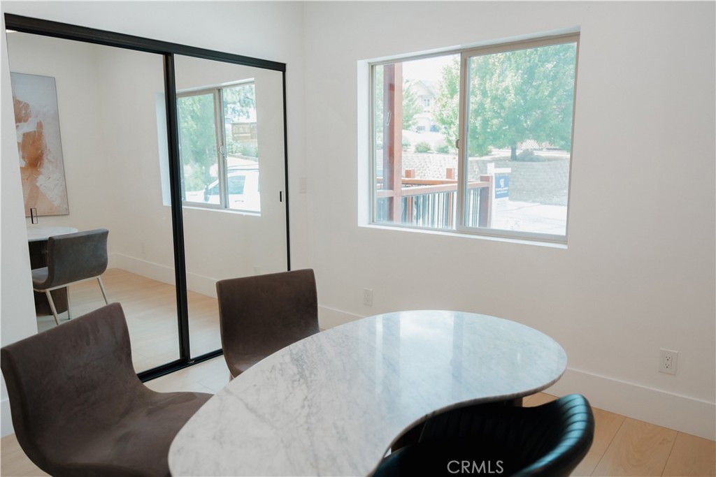 The adjacent living and dining area is anchored by a stunning fireplace finished in Roman Clay from Portola Paints, offering a soft, matte texture that adds warmth and artisan character. Glass railings add a modern architectural touch, enhancing the home’s open feel while allowing views to flow freely.
