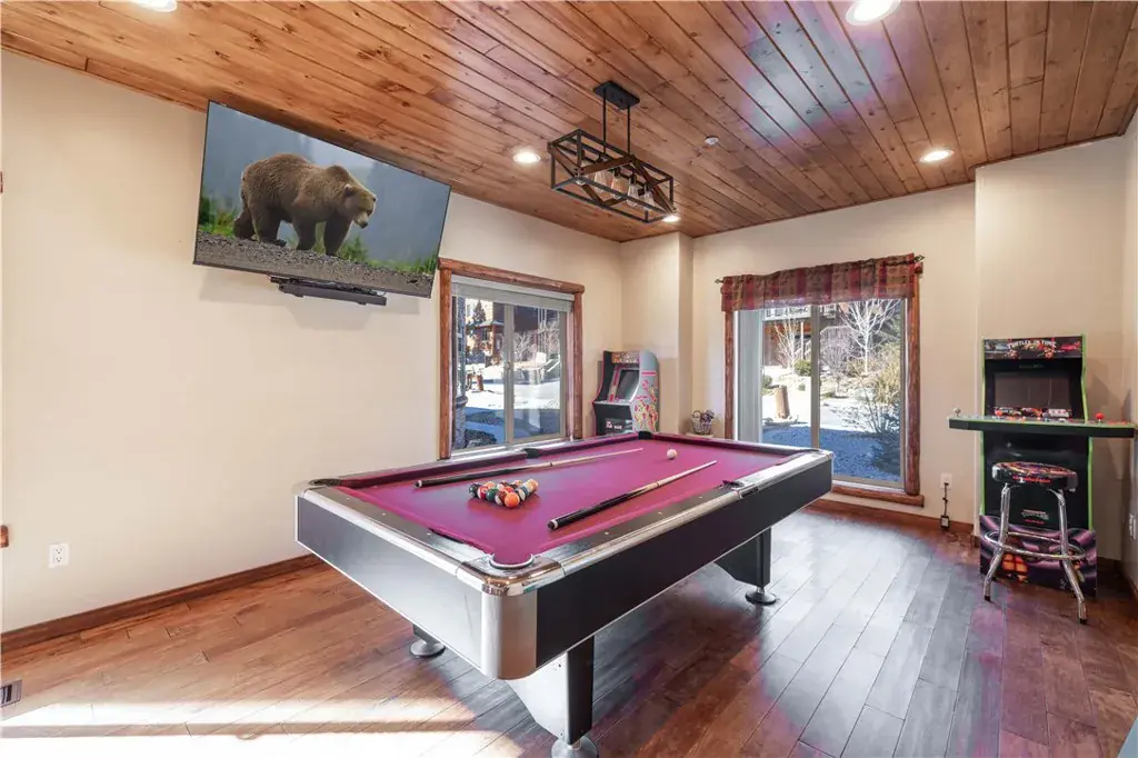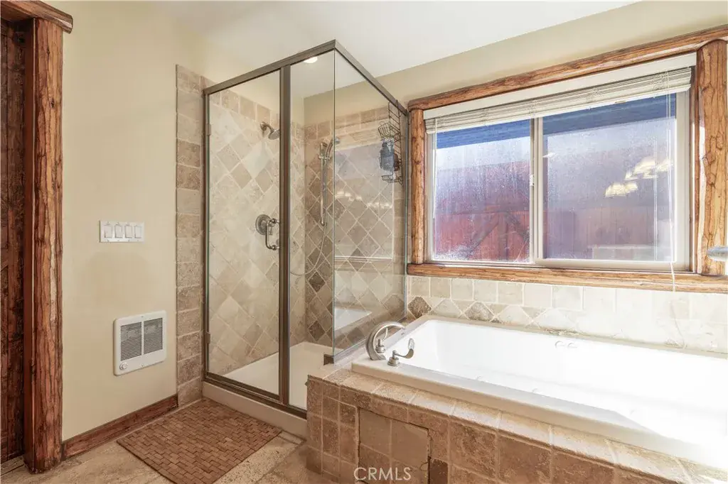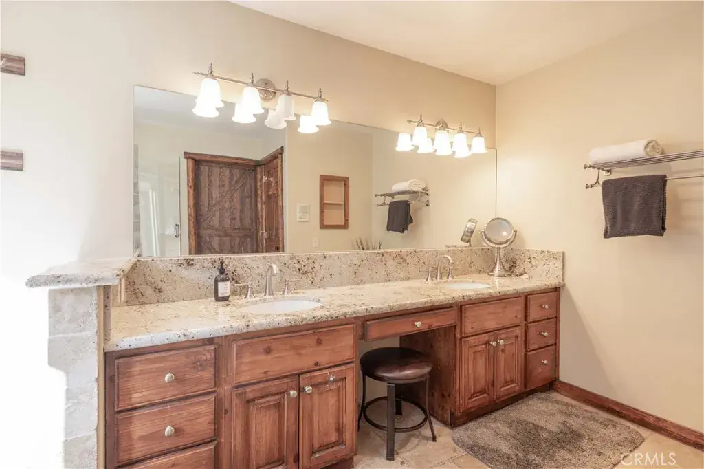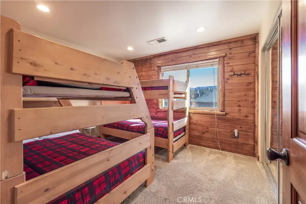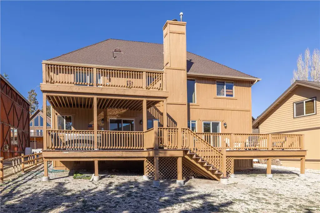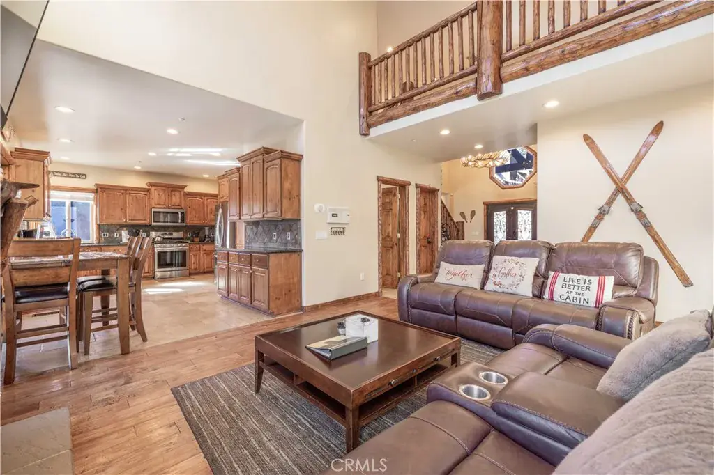 Custom log-style mountain home on Bear Loop with sweeping views of Baker’s Pond, the ski slopes, and Sugarloaf Mountain. This 4-bedroom, 4-bath residence features two true primary suites—one on each level—ideal for hosting, multi-generational living, or STR flexibility. The lodge-inspired living room showcases vaulted ceilings, a dramatic two-story rock fireplace, and an open catwalk loft, all framed by oversized windows and rich log and stone accents that deliver a true mountain feel. The open kitchen offers custom cabinetry, expansive granite countertops, and newer stainless steel appliances, flowing seamlessly into a spacious game room and dining area. Upstairs, the primary suite includes a walk-in closet, private balcony, and a spa-style bath with travertine finishes and soaking tub. Every bedroom features its own accent wall, adding warmth and character throughout. Dual forced-air heating zones serve both upper and lower levels for year-round comfort. Multiple decks invite you outdoors to take in the views, unwind in the new spa, and enjoy mountain living at its best. Located in a neighborhood with underground utilities and pride of ownership throughout. Minutes to everywhere you’d want to be in Big Bear!