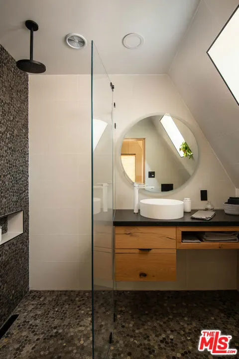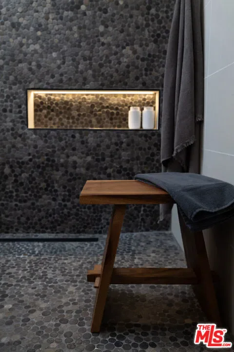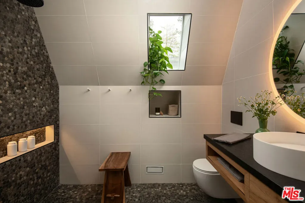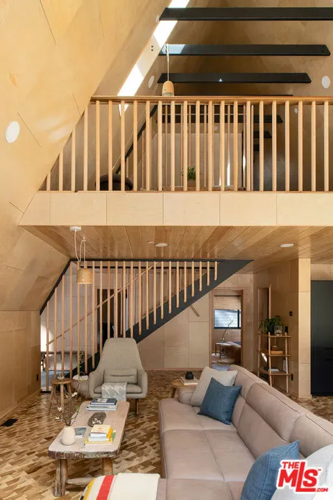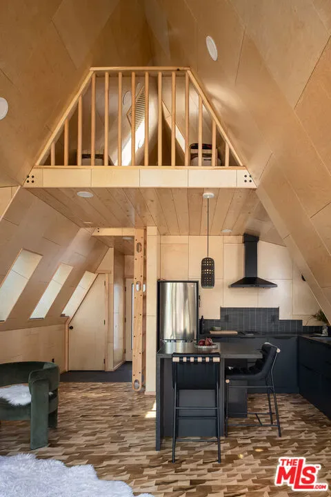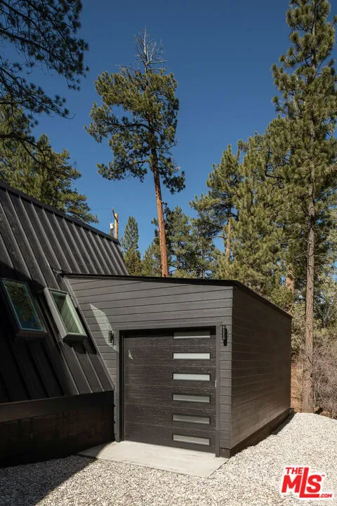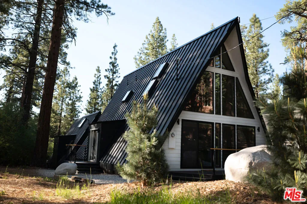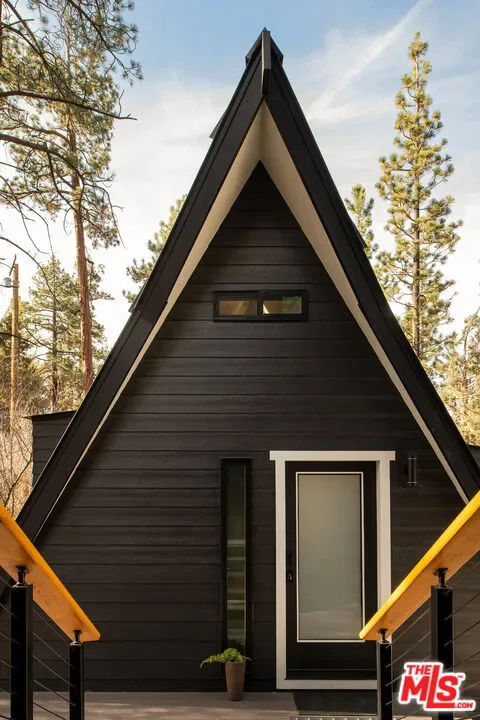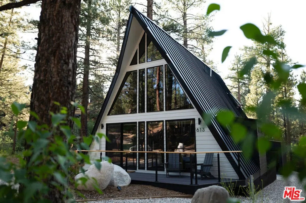 Tucked among the old-growth trees in the mountains of Big Bear, this striking Scandinavian retreat blends stone, hardwood, and thoughtful design into a truly one-of-a-kind alpine escape. Newly constructed and exuding extraordinary attention to detail, the property features two separate A-frame cabins, offering a rare combination of architectural beauty, flexibility, and peaceful mountain living. The main A-frame showcases a spacious design with soaring ceilings, clean lines, and an open, light-filled interior. Crafted from natural materials, the home pairs precision Baltic Birch walls with handmade Poplar end-grain floors, creating a warm and soulful interior that feels both modern and timeless. Large windows frame views of the surrounding forest, bringing in soft natural light during the day and moon lit trees by night. The central living area features dramatic vaulted ceilings and an open layout connecting the living, dining, and kitchen spaces, with a kitchen bar ideal for casual meals and entertaining. On the main level, a spacious guest bedroom sits alongside a beautifully finished British inspired wet bathroom featuring natural stone tile and a rain shower. A generous laundry and utility room offers the perfect place to drop skis, boots, and gear after a day on the slopes. Upstairs, a loft area provides additional flexible sleeping space, while the primary suite offers vaulted ceilings and a spa inspired bathroom, creating a peaceful retreat above the main living areas. A second A-frame at the rear of the property mirrors the concept design of the front home but with arguably more charm. With its own lofted bedroom, kitchen, and full bathroom, it is perfect for guests, extended family, or a private owner’s retreat if the front cabin is used as a rental. Towering Jeffrey pines and native willows surround the seasonal creek behind the property, forming a natural privacy buffer that beautifully frames the A-frame homes and can be best enjoyed from the private back patio. This home has a spacious attached, heated garage with an elevated sleeping loft. Perfect for boat and activity storage, or convert to an additional living space with included utility hookups. Every element of this wall to wall hardwood mountain hideaway was intentionally crafted, creating a peaceful retreat where minimalist design meets Nordic alpine charm. Set in a quiet neighborhood at the end of the street, the property offers direct access to miles of serene forest trails. Despite its tranquil setting, the home is ideally located just minutes from ski resorts, outdoor recreation, local grocery stores, restaurants, and coffee shops.