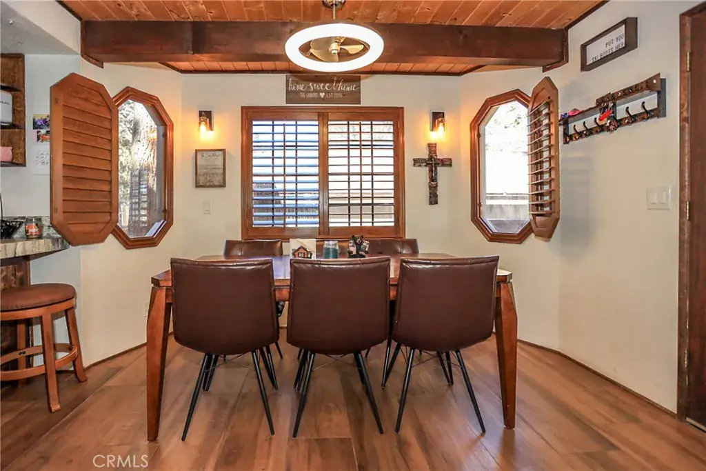 This cabin has been thoughtfully updated with quality improvements throughout. Recent upgrades include a new water heater, stunning marble kitchen countertops, high-end flooring throughout the home, beautiful wooden shutters, insulated walls for added efficiency, dual pane windows, and fresh interior and exterior paint. The backyard is perfect for entertaining, featuring a large built-in picnic table designed for gatherings with family and friends.