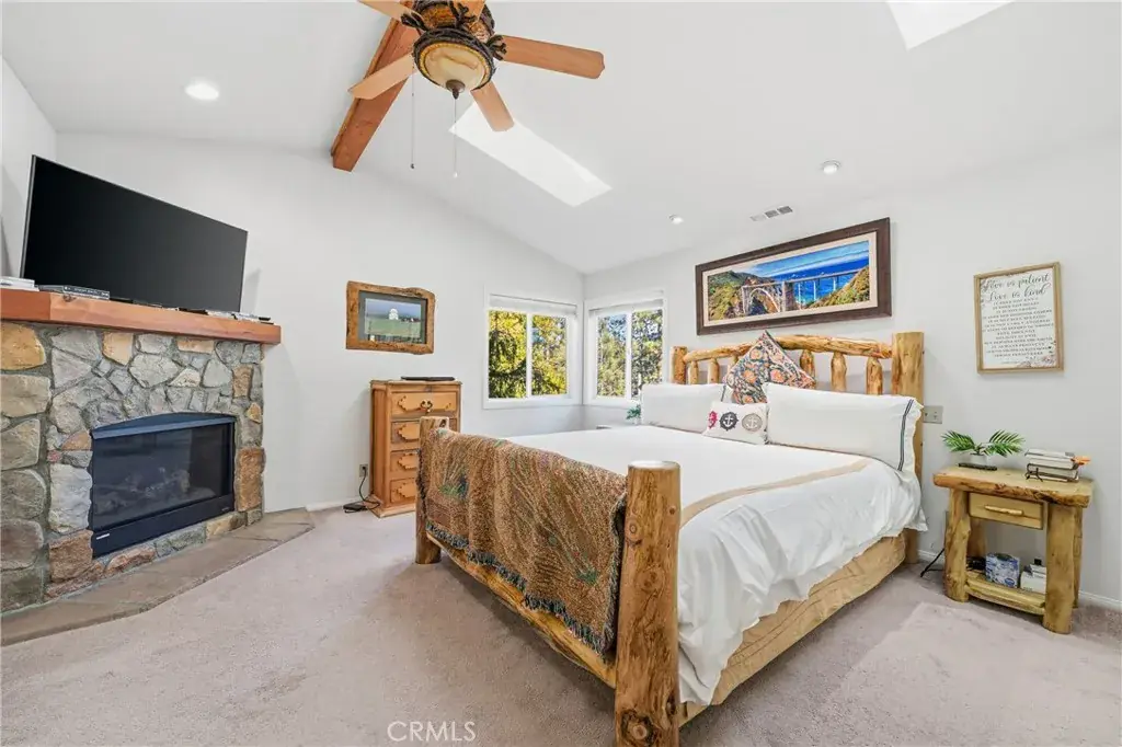 Main living areas are open and inviting, highlighted by three fireplaces throughout the home, creating warmth and ambiance year-round. A spacious family/game room with a wet bar and fireplace opens to an outdoor deck, enhancing indoor-outdoor living and providing an ideal setting for entertaining or relaxing while taking in the serene lake environment. The kitchen is designed for both everyday living and hosting, featuring a walk-in pantry, wine refrigerator, granite countertops, and stainless steel appliances. The upper-level primary suite offers vaulted ceilings, a fireplace, and lake views. The primary bathroom includes heated floors and a heated toilet seat, along with remotely operated skylights that provide excellent natural ventilation during warmer months. An additional upstairs bedroom and half bath complete the upper level.The lower level includes the original portion of the home, offering two bedrooms and one full bathroom, well suited for guests, extended family, or private use. With its deep-water frontage, prime Gilner Point location, substantial newer construction, and functional floor plan. this property represents a rare opportunity to own a premier lakefront home in the Big Bear Lake market.