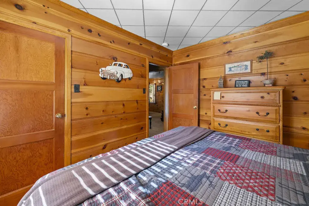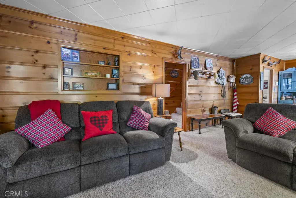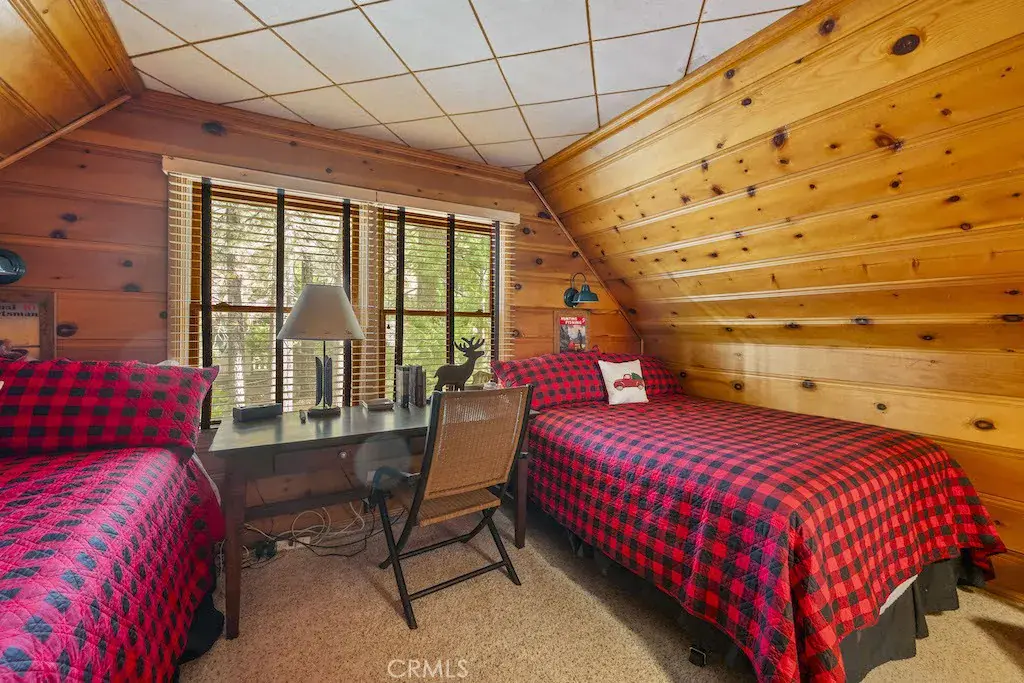 Introducing a charming 1,226 sq ft log cabin nestled in a serene, heavily treed area of Big Bear Lake! This inviting 3-bed, 2-bath retreat blends classic mountain character with rustic elegance. Warm Knotty Pine accents and a striking native rock fireplace create a cozy lodge feel, while the country-style kitchen—complete with a generous pantry—offers great functionality for everyday living or weekend escapes. A separate laundry area adds convenience. The well-designed layout includes a main-level bedroom, with additional bedrooms upstairs for added privacy. Step outside to a spacious back deck, perfect for relaxing among the pines or entertaining guests. Situated on a 9,000 sq ft lot, the property provides a peaceful, wooded setting, and the detached garage offers excellent storage for mountain toys! Located close to the lake and just a short drive to the Village, restaurants, shops, and ski resorts, this home is ideally positioned for year-round enjoyment. A wonderful opportunity to own an authentic Big Bear retreat in one of the area’s most desirable neighborhoods.