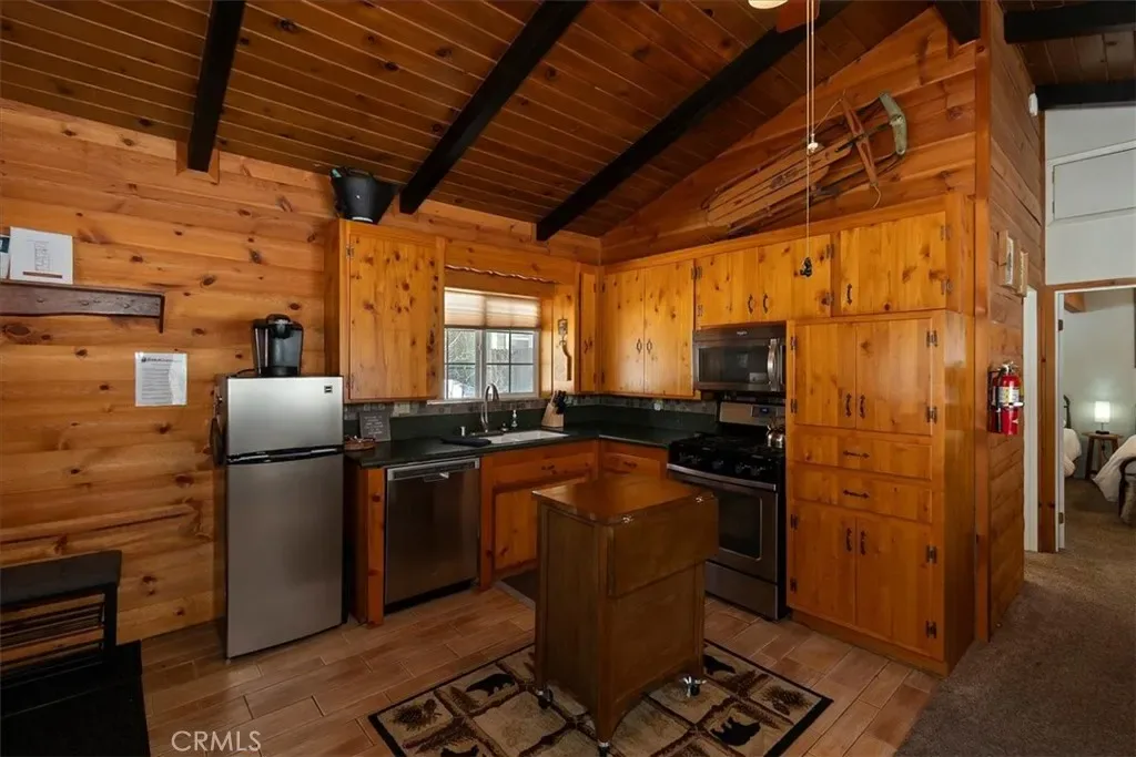 include knotty pine cabinetry, granite countertops, newer SS appliances, wood grain porcelain tile