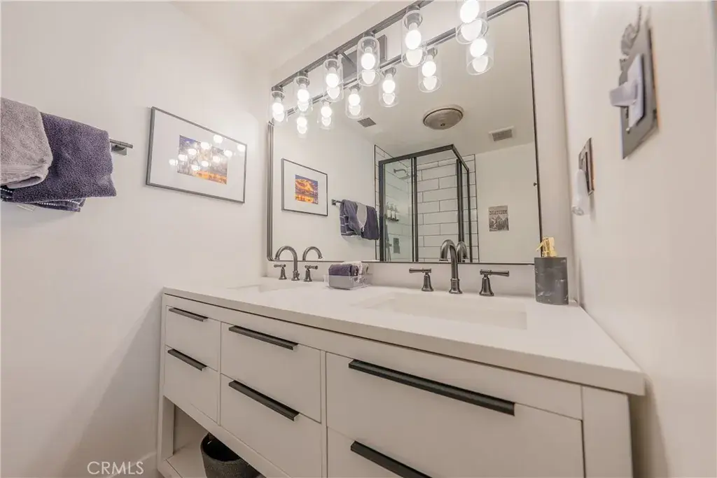 The Primary Suite offers direct deck access, a sleek en-suite Bathroom with dual vanities, and a glass walk-in shower. Each Bedroom features built-in wardrobes and spacious drawer storage, and the second full Bathroom includes dual sinks and a tub/shower combo. Two of the three Bedrooms open directly to the expansive deck with an 8-person hot tub.