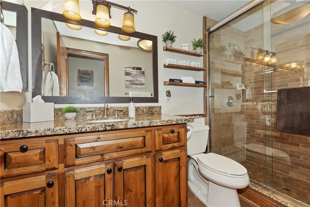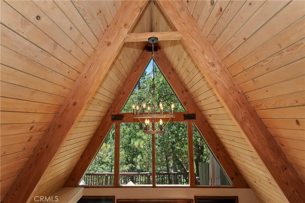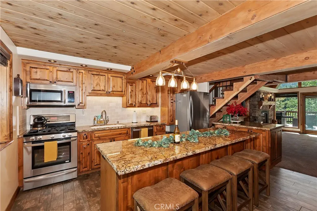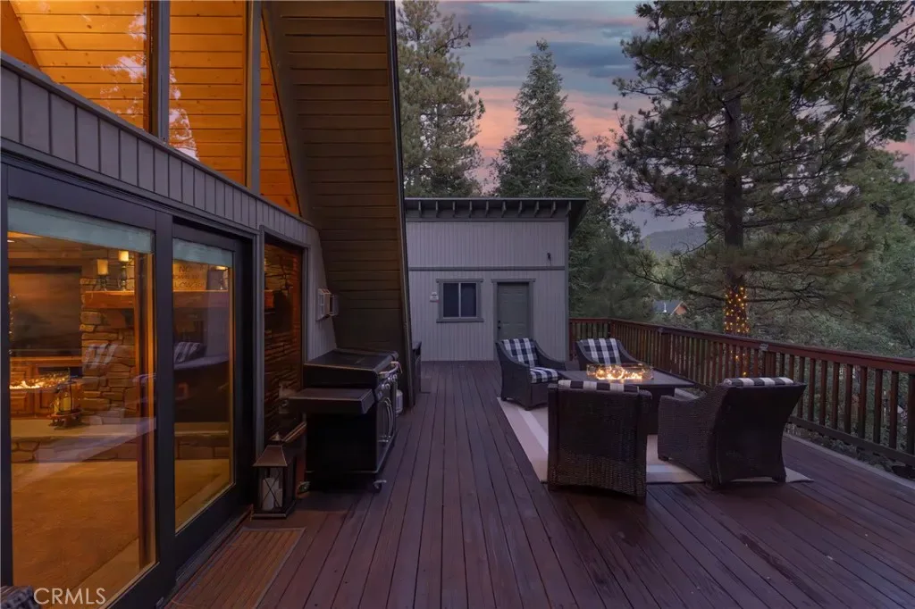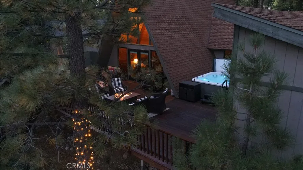 Discover the charm of this beautifully upgraded A-frame home, perfectly positioned in a convenient Moonridge location. This home has been a standout Airbnb, consistently receiving high reviews and generating excellent rental income. Offering breathtaking views of Bear Mountain and the nearby ski slopes, this property is ideally situated for skiing, golfing, and a range of outdoor activities just under a mile away. The interior of this home has been thoughtfully remodeled, blending modern upgrades with cozy mountain aesthetics. The fully equipped kitchen is a standout feature, boasting elegant granite countertops, new flooring, appliances, and a fully stocked coffee bar, making it a perfect space for entertaining or relaxing after a day on the slopes. Step into the living area and be greeted by soaring ceilings and a warm, inviting fireplace, creating a comfortable atmosphere for unwinding. The large sliding glass doors open to a private rear deck, where you can soak in the sunny mornings, enjoy peaceful afternoons, and take in the serene views of the ski slopes. Or enjoy soaking in the large hot tub tucked away with that feeling of privacy. You are truly amongst the trees. Additional conveniences of this home include a washer and dryer, recessed lighting, and a detached single-car garage. Whether you’re looking for a turn-key vacation rental or a personal mountain retreat, this property is ready to offer comfort and style in a stunning setting.