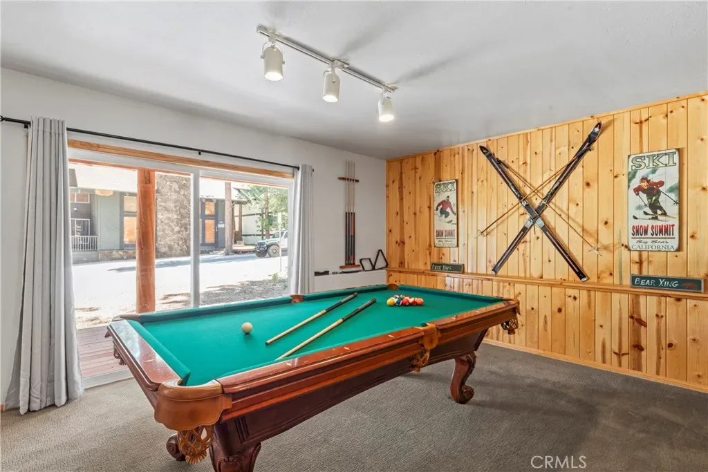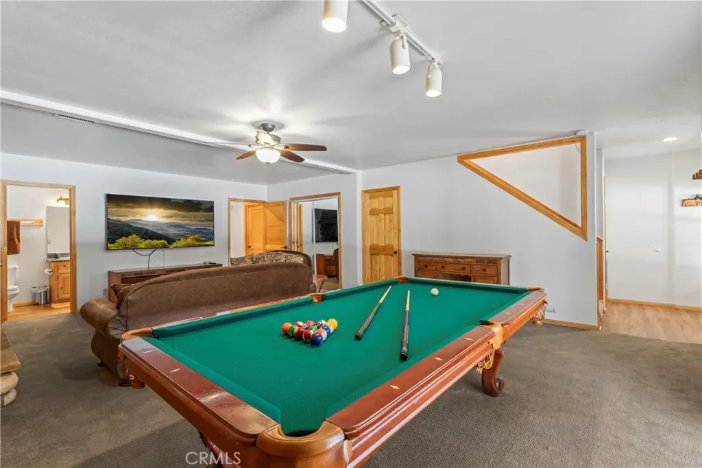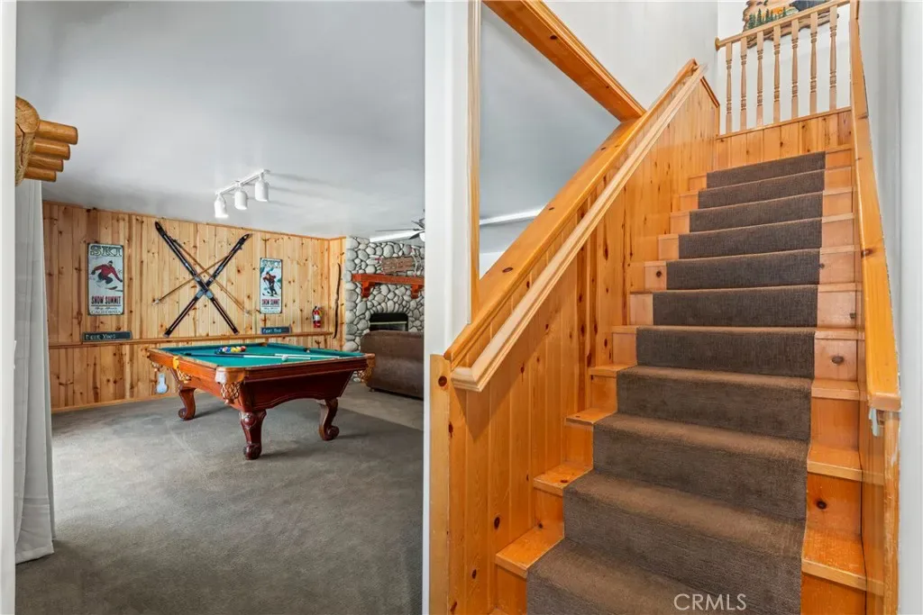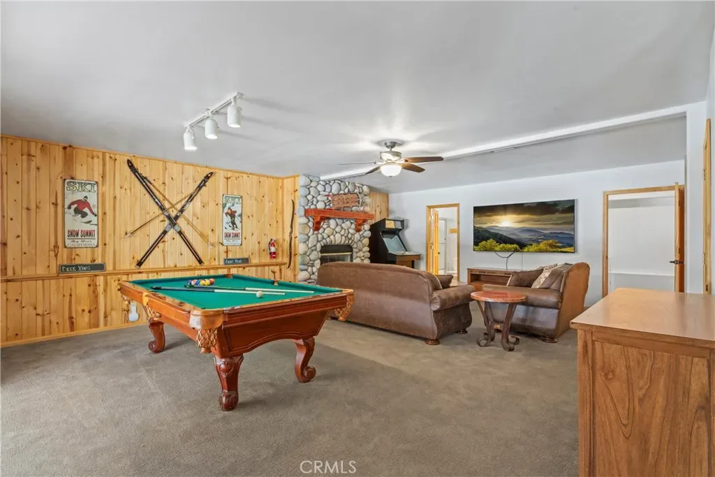 Downstairs, you’ll find a HUGE game/media room that’s a total showstopper—complete with a 75” cinema-style TV, pool table, arcade game, stone fireplace, and a full bathroom. It’s the perfect space to entertain or unwind after a day on the slopes.