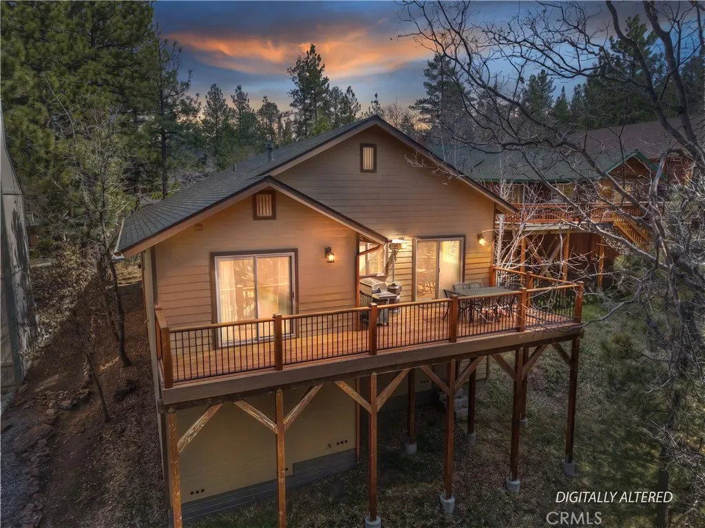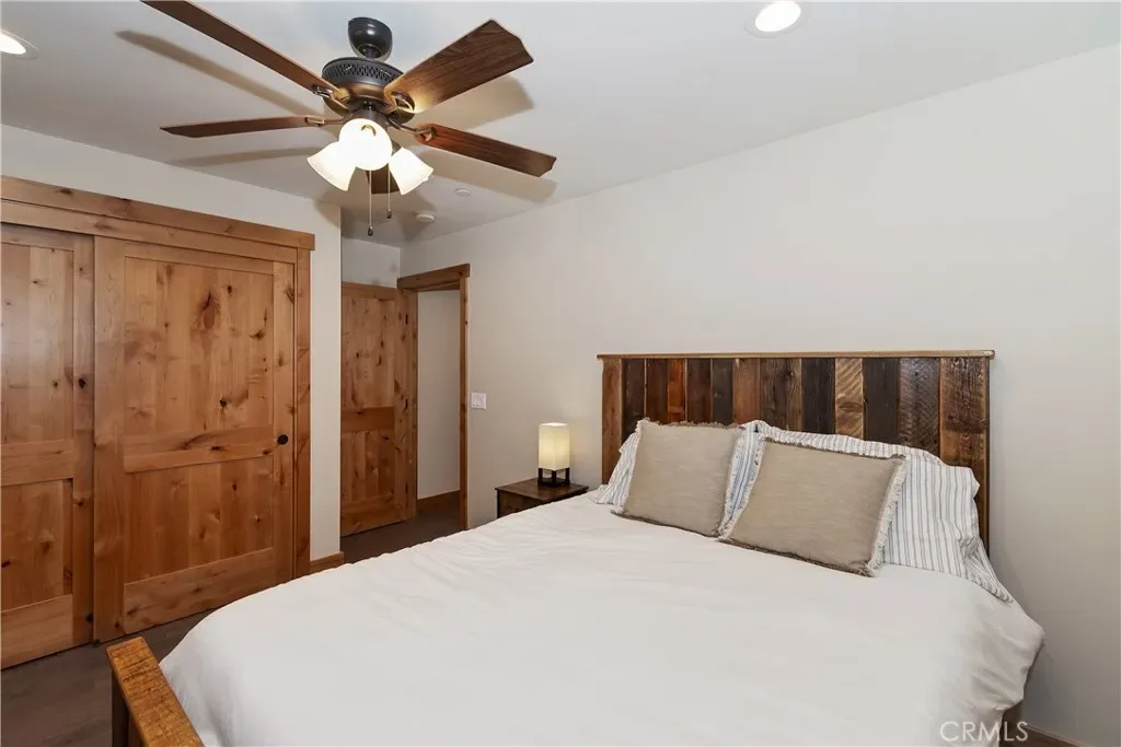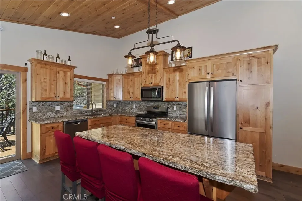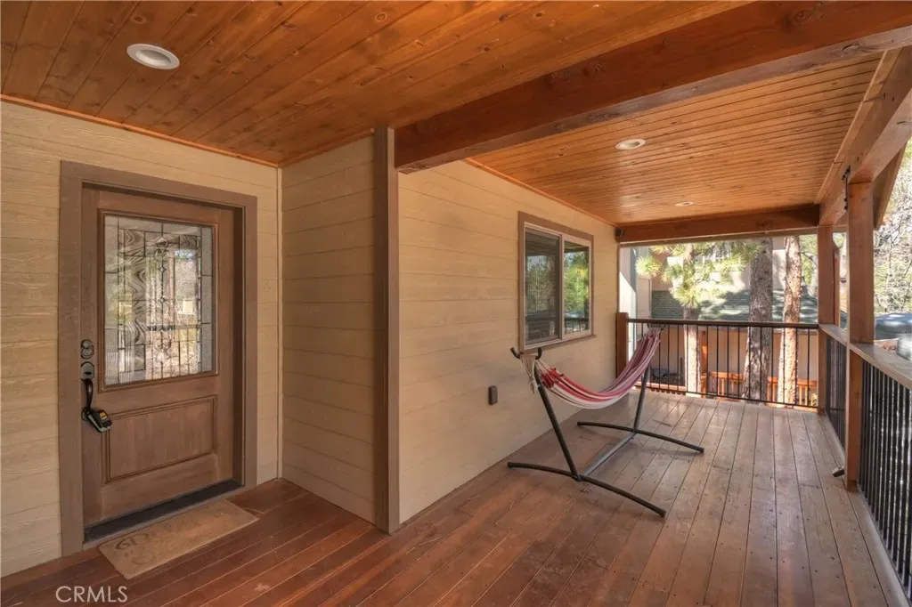 Stunning 2019 built, single story, level entry, mountain retreat in a prime central Big Bear Lake location ~ Experience refined mountain living in this exceptional custom-built home ~ It’s had one loving owner and is ideally situated close to the top of a street that ends at the access to Town Trail and other Snow Summit trails, is just minutes from the ski slopes, Big Bear Lake, and walking distance to the Village ~ Featuring 1,613 square feet of open, light and bright living space, this home has 3 bedrooms and 2 bathrooms, and is thoughtfully designed with high-end finishes ~ The expansive great room showcases soaring vaulted Alderwood ceilings, rich engineered hardwood flooring, and an impressive floor-to-ceiling rock fireplace—creating a warm gathering space ~ The large kitchen is both elegant and functional, appointed with granite countertops with a live edge, large center island with lots of cabinets, custom Alderwood cabinetry, and stainless steel appliances, even has a dishwasher ~ It’s perfect for entertaining or quiet evenings at home ~ The primary suite offers a slider out to the deck, large closet and ceiling fan ~ The master bath has double sinks, a beautifully tiled walk-in shower featuring a flat pebble stone floor and granite accents, and more gorgeous Alderwood cabinets ~ Step outside to enjoy the serene mountain setting from the covered front porch or the private rear deck, both redwood with wrought iron accents—ideal for entertaining beneath the pines ~ This home offers year-round recreation and luxury mountain living at its finest ~ Additional amenities include a tankless water heater, fully finished insulated garage with electric vehicle charging capability, and a striking exterior of low-maintenance siding accented by stone and shake detailing ~ This comfortable and solid home would make a wonderful primary residence or vacation home, and with its exceptional location and layout, it has a lot of short term rental potential.