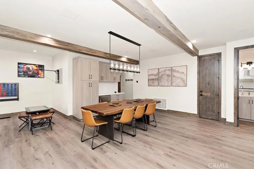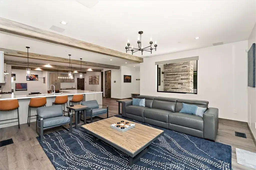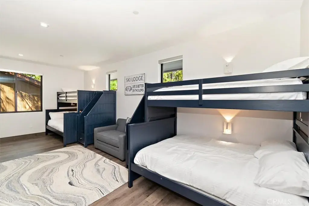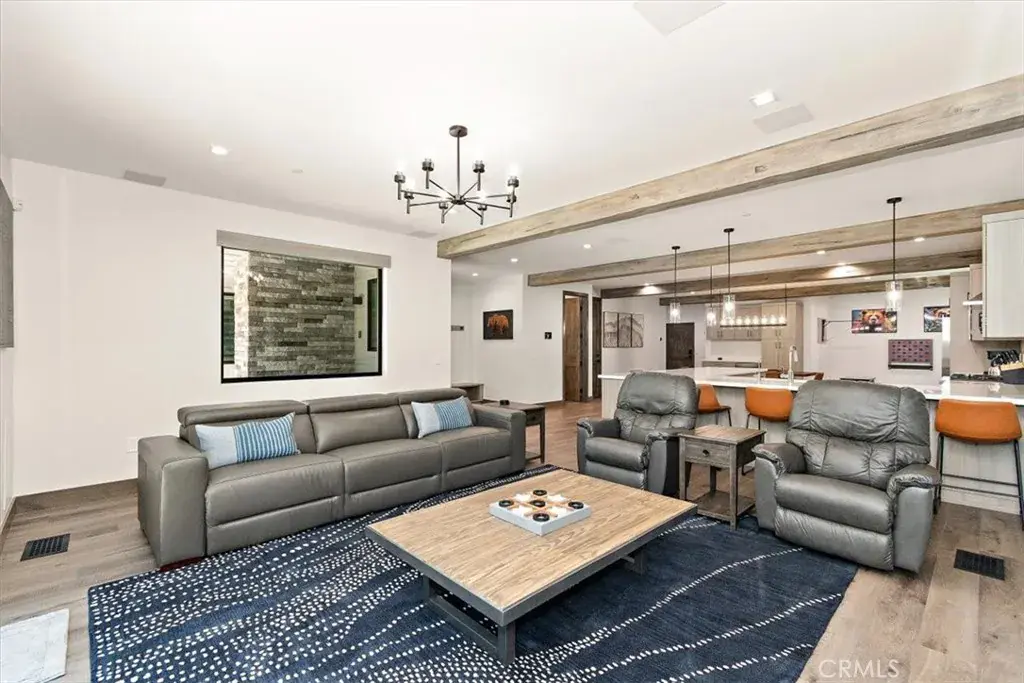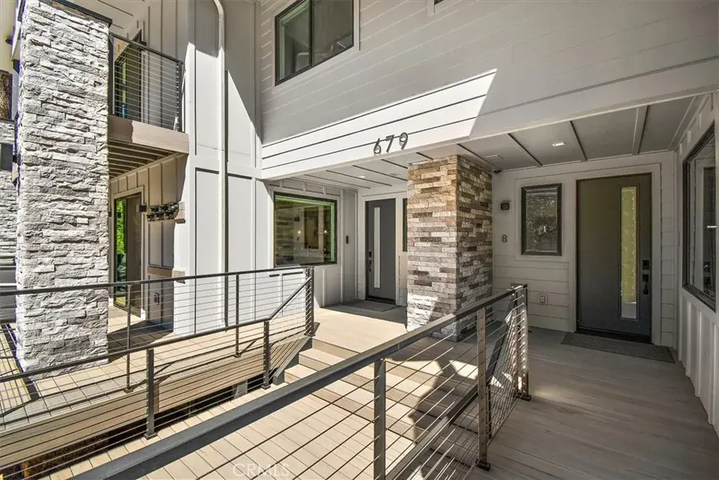 LOCATION, LOCATION, LOCATION! This stunning, modern, brand new single family residence laid out in versatile duplex fashion is only a 5 MINUTE WALK from Snow Summit Mountain Resort! Able to be split into multi-units, use it for income-producing vacation rentals, live in one and rent the other, or use them both for yourself and family; the possibilities are endless! The open floor plan blends game room, dining, and living room and has something for everyone – shuffleboard, electronic gaming table, cozy fireplace and oversized large screen TV, and a gourmet kitchen complete with custom cabinets, sleek quartz countertops, high-end stainless steel appliances, and reverse osmosis water filtration. In addition, this custom designed home features separate, dedicated central heating and air conditioning systems for each unit, ensuring year-round comfort. Both units feature dual primary suites, each with its own en-suite bathroom, ensuring ample space and privacy. As well, both sides are equipped with touchscreen smart units and all rooms have motorized shades and one touch light control. Each unit has an oversized 2-car attached garage with epoxy-coated floor, and ample, lockable storage, commercial-grade tankless water heaters and universal EV charging stations installed. Experience the perfect blend of modern amenities and mountain charm in this exceptional duplex, masterfully designed and no expense spared to cater to your every need and to surround you in comfort and luxury.