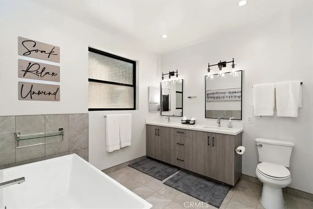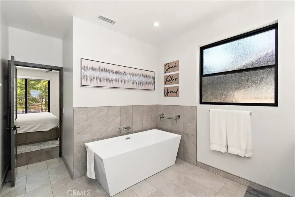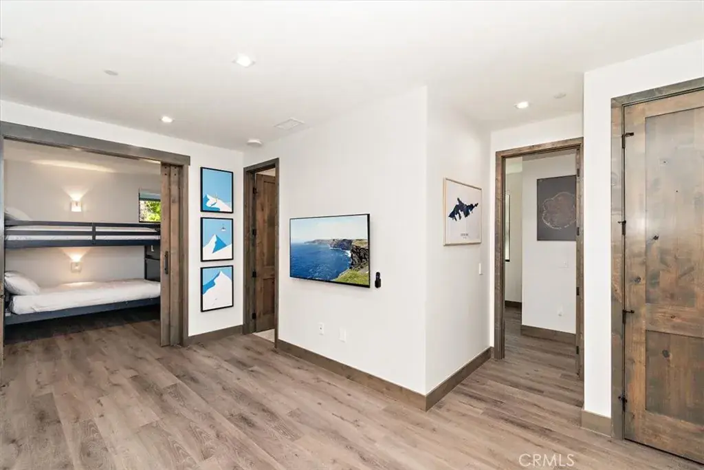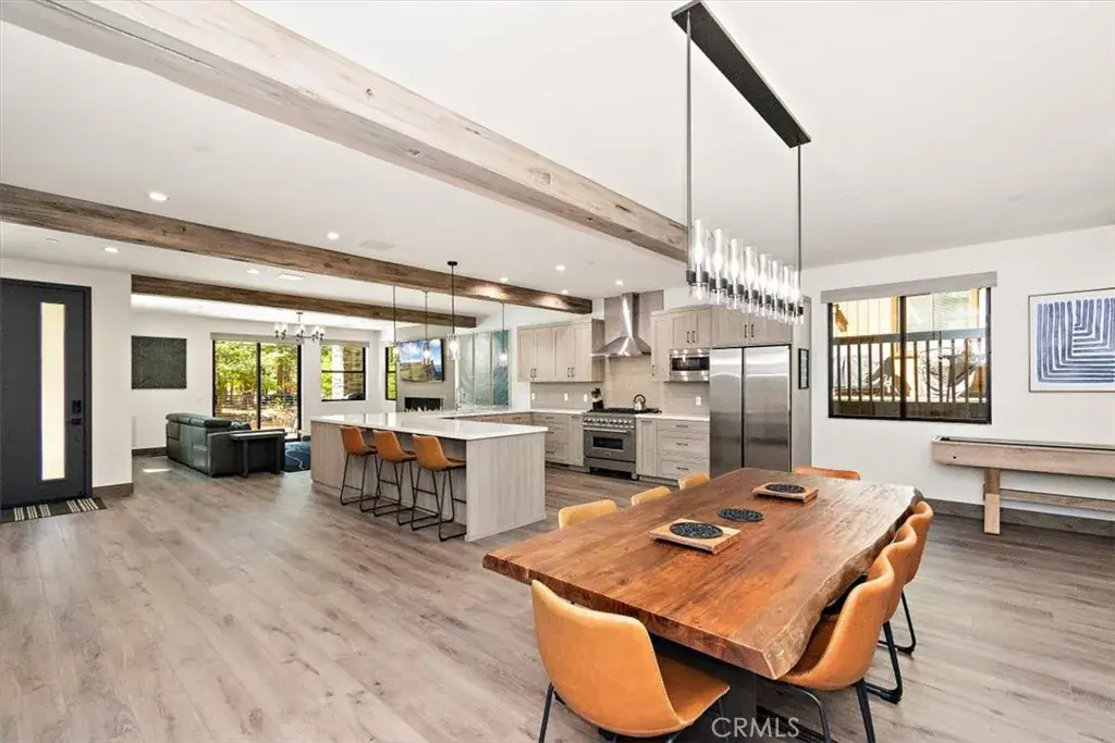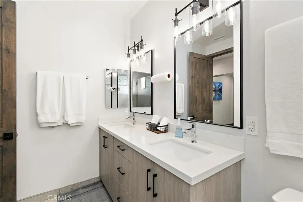 LOCATION, LOCATION, LOCATION! This stunning, modern, brand new single family residence laid out in versatile duplex fashion is only a 5 MINUTE WALK from Snow Summit Mountain Resort! Able to be split into multi-units, use it for income-producing vacation rentals, live in one and rent the other, or use them both for yourself and family; the possibilities are endless! The open floor plan blends game room, dining, and living room and has something for everyone – shuffleboard, electronic gaming table, cozy fireplace and oversized large screen TV, and a gourmet kitchen complete with custom cabinets, sleek quartz countertops, high-end stainless steel appliances, and reverse osmosis water filtration. In addition, this custom designed home features separate, dedicated central heating and air conditioning systems for each unit, ensuring year-round comfort. Both units feature dual primary suites, each with its own en-suite bathroom, ensuring ample space and privacy. As well, both sides are equipped with touchscreen smart units and all rooms have motorized shades and one touch light control. Each unit has an oversized 2-car attached garage with epoxy-coated floor, and ample, lockable storage, commercial-grade tankless water heaters and universal EV charging stations installed. Experience the perfect blend of modern amenities and mountain charm in this exceptional duplex, masterfully designed and no expense spared to cater to your every need and to surround you in comfort and luxury.