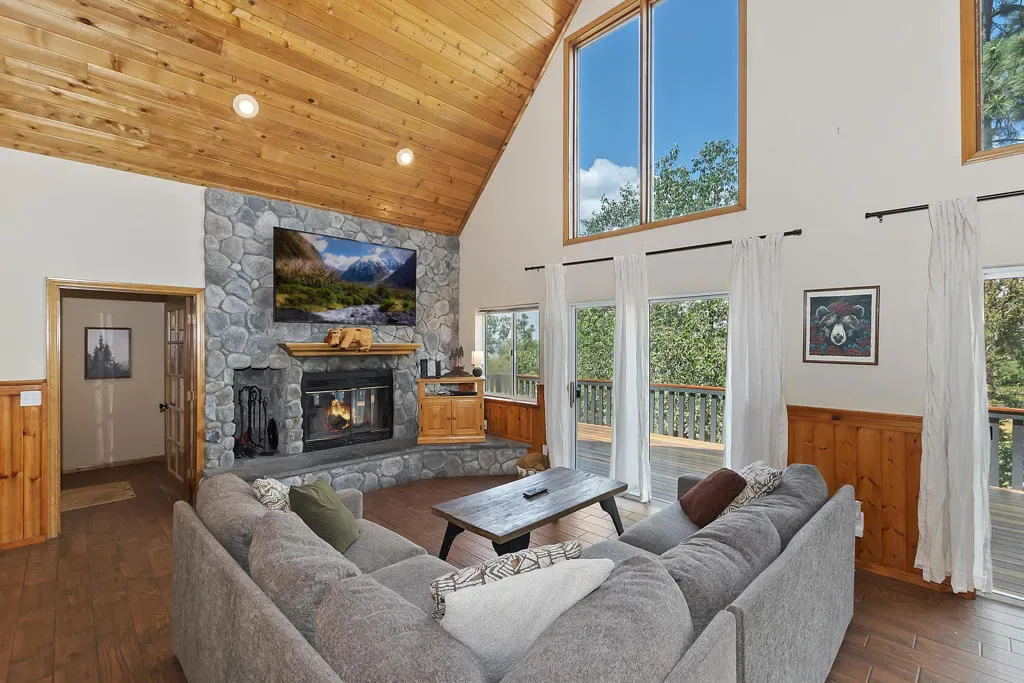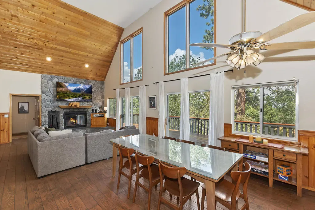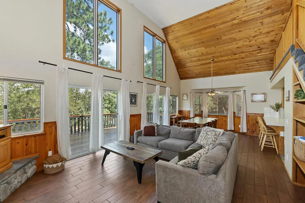 What A View! The Wall Of Windows To Back Deck With Views Of The Valley And National Forest Is What Big Bear Is All About. This Moonridge Beauty Is Boasting A Spacious Great Room With Vaulted Ceilings And Wood Burning Fireplace With Impressive River Rock Surround Where Everyone Can Be Together. Kitchen Has A Generous Amount Of Storage And Counter Space. The Large Back Deck Has A Hot Tub And The Nice Sized Backyard Has Plenty Of Room And A Horseshoe Pit. Upstairs Has A Loft Area For A Morning Cuppa With The View Out Of The 2-Story Windows. Downstairs Has 2 Bedrooms And A Full Bath And Upstairs Has 2 More Bedrooms With Another Full Bath. Direct Access Garage With Level Driveway On The Sunny Side Of The Street Makes For Easier Snow Melt. The Bonus Room Over The Garage Is An Incredible Space With Many Opportunities. Hiking Trails Right Down The Street, About 2 Miles To Bear Mountain Ski Resort, Golf Course, Alpine Zoo. About 3 Miles To The Shore Of Big Bear Lake. Has Been A Vacation Rental, Income Possibilities!