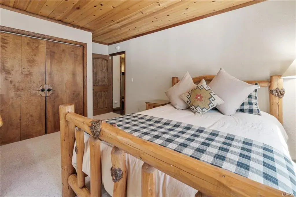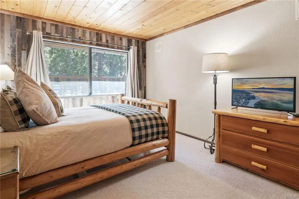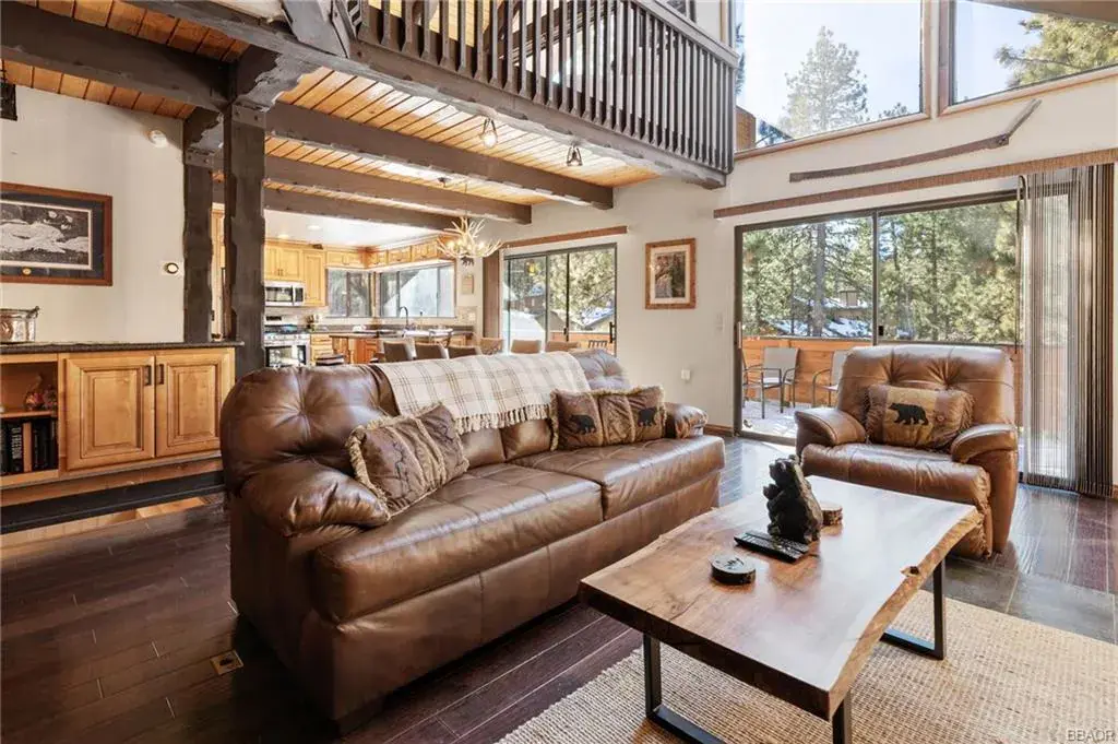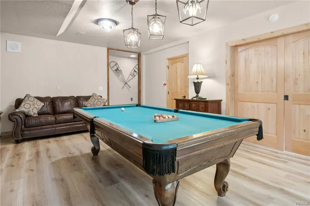Charming four-bedroom, three-bath mountain chalet in Big Bear Lake West. Nestled close to the Lake on three levels, this custom-built retreat features a master suite loft, a total of 5 sleeping areas 3 full baths. Set on an oversized 11,000 SF lot with level entry, room for an RV and even a boat as well in addition to the attached two-car garage. The kitchen with granite countertops, stainless steel appliances seamlessly opens into the spacious living room, highlighted by an oversized rock fireplace and cathedral ceilings. The main level opens onto the back deck with peek-a-boo lake view. Great for those seeking a blend of luxury and alpine charm. Downstairs is the oversized game room with pool table, another fireplace, bedroom and bath. (Lower level bedroom is not permitted for Vacation Rental Per City) but is part of Livable SF