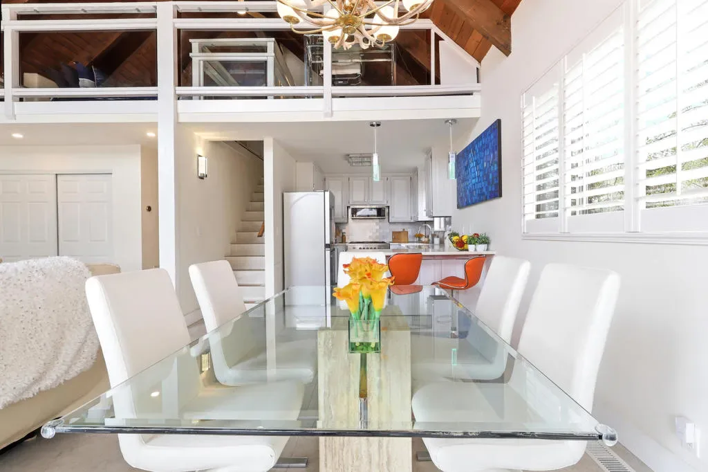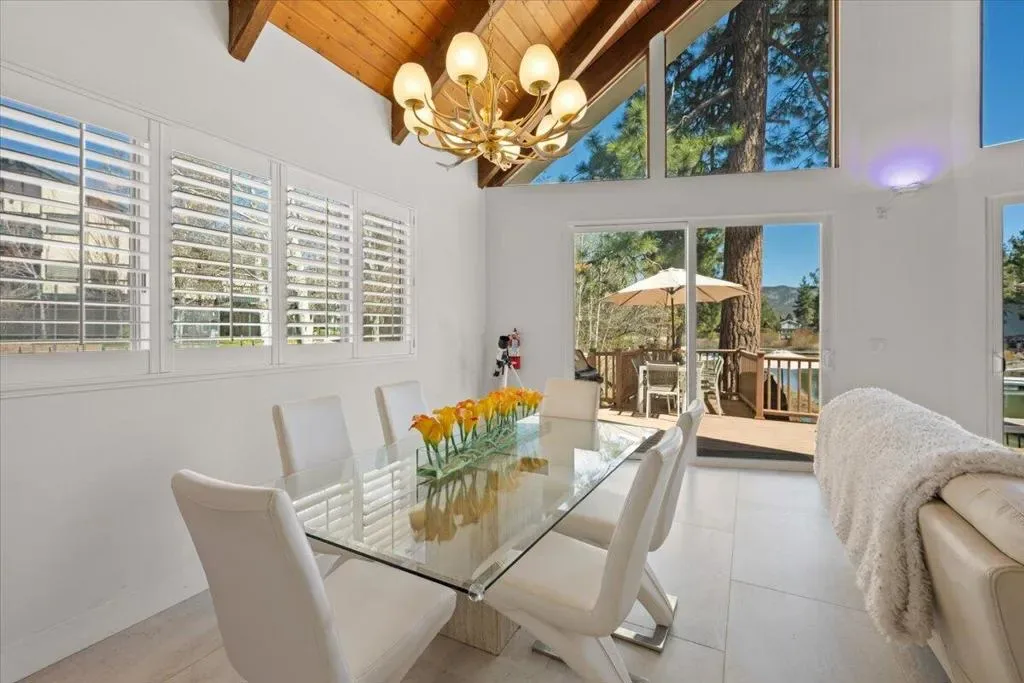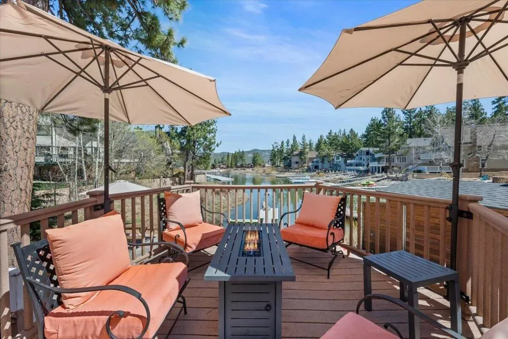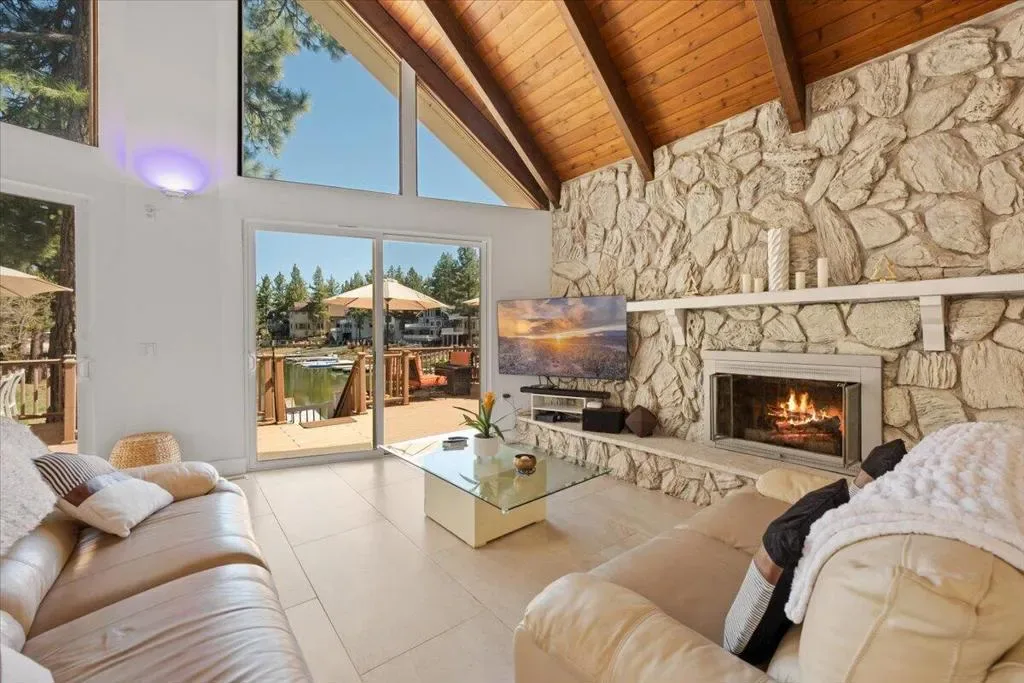 Discover the perfect blend of classic A-frame woodwork and modern upgrades in this beautifully updated lakefront home with boat dock privileges. Located along the protected waters of Mallard Lagoon, the serene setting offers a sheltered site that is ideal for safely launching a kayak or boat and also attracts a variety of ducks, stellar’s jays, blue heron, and eagles. Step inside to find a fully renovated interior featuring new large-format porcelain floors throughout, fresh drywall, recessed lighting, and a completely updated kitchen with bright quartz countertops, farmhouse sink, and high-end appliances including a Bosch dishwasher, gas stove, refrigerator, microwave, and garbage disposal. Both bathrooms have been refreshed, including a fully rebuilt upstairs shower constructed using a floated custom tile–considered a premium method for durability and craftsmanship. Modern artwork throughout is brought to life by new recessed lighting and eye-catching fixtures. Comfort is enhanced with a large gas fireplace, new tankless water heater, mini-split AC upstairs, and a fully updated central heating system. The home also features new washer/dryer, updated closets, and stylish furnishings including memory foam beds, reinforced frames, leather sofas, and designer dining chairs. Outdoor living is equally impressive with a spacious deck equipped with BBQ, full-size dining table, and fire pit seating area. Soak in the brand-new Artesian Captiva 33 WiFi-enabled spa, or sun on the expansive newly-built lower patio. The home features a stone path to the dock with dock light, and on the other side a fully fenced yard with motorized entry gate, fruiting trees (apples, pears, peaches, and apricots), in-ground electrical, irrigation improvements, boat parking pad, and EV charging outlet. The home has an audio and video surveillance system as well. The exterior has also been freshly repainted and the driveway resealed. This move-in-ready lakefront home seamlessly combines comfort, quality upgrades, and an incredible waterfront lifestyle–perfect for full-time living, weekend escapes, or entertaining by the lake. It is currently vacation-rental approved by the City and has been operating as a second home, supplemented by high-quality rentalincome, for five years.