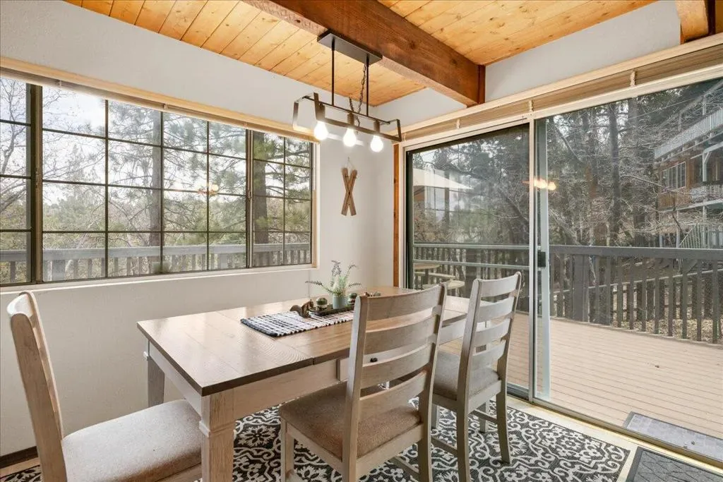 Step into your own Big Bear retreat! This light and bright 2 bed, 2 bath gambrel-style cabin is tucked in the highly desirable upper Moonridge neighborhood–just minutes from Bear Mountain ski slopes, Moonridge Coffee, the zoo, scenic trails, and the lake. Inside, you’ll find soaring beamed ceilings, two cozy brick fireplaces, and a stylish kitchen featuring sleek stainless steel appliances. Natural lightpours in, creating a warm and inviting cabin feel with modern touches throughout. Situated on a fully fenced, street-to-street lot, this property offers both privacy and convenience–perfect for pets, entertaining, or simply enjoying the outdoors. Step outside to the spacious wrap-around composite deck–durable, low-maintenance, and ideal for year-round relaxation. There’s also a generous storage area underneath with tons of potential for expansion or added functionality. Bonus: Sold fully furnished and already a favorite on Airbnb–this is a turnkey, income-producing opportunity or the perfect personal getaway!